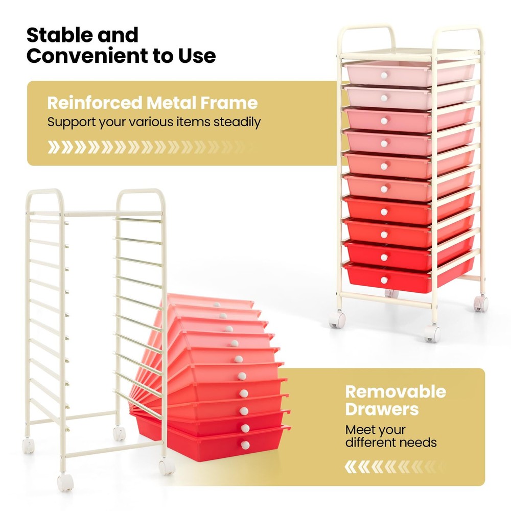 Description This individual 10-drawer trolley features 10 plastic drawers with silver drawer handles and a sturdy caster with a sturdy, smooth metal frame.The drawers are made of solid, colored, transparent materials that make everything easy to see, while removable casters facilitate movement. You can keep our 10 drawer rolling trolley in the kitchen for recipes, gadgets, and napkins. Keep this organizer tools in your office for documents, , and other supplies.This portable storage cart can also be placed in a garage or workshop to tools, screws and other hardware. It is also ideal for classrooms where art and crafts are stored in a simple place.You can even use it in retail Settings to sort inventory items or paperwork. Features Environmental, wear-resisting, and anti aging PP material ensures safe use 10 drawer storage cart providing plenty of space for keeping your home office supplies tidy and close, organizing makeup and cosmetics, and storing arts and crafts supplies Top handles make it easy to push and pull, 2 side handles make it convenient for you to move the cart Sturdy chrome plated steel frame for long lasting performance The drawers slide unattached through metal channels Castors with brakes ensure mobility and stability Smooth and flat tabletop is a good design for storing home or office stuff, ideal For Storing Small Tools In Office, Home, School, Garage Specifications Color: As pictures show Material: Steel + PP Net Weight: 9.5 lbs Drawer Size:15’’ x 11.5’’ x 2.5’’(L x W x H) Overall Size: 15'' x 13'' x 34'' (L x W x H) Package Includes: 1 x 10 Drawers Rolling Cart 1 x User's Manual [Large 10 Drawers]: 10 drawers rolling storage cart providing you with enough space to different categories of things, keeping your home office supplies, cosmetics, handicrafts and tools used in the garage neat . [Durable Construction]: Our storage rolling trolley main frame is made of high-quality steel, and is smoothly plated, rust-resistant and corrosion-resistant, and has a long service life. It's also strong enough to support the shelves and things you put in. [Flexible Casters]: There are four rotating casters under the whole shelf, which can make the cart move freely and smoothly anywhere you want. If you want the cart to stay still, of them can be locked stably. The top handles make it easy to push and pull, and also make you feel at ease. [Practicable Function]: This 10 drawer rolling trolley is an ideal choice for you to make your work places or home more organized and neat because this storage cart can perfectly place its practical role in a variety occasions such as office, home, living room, entryway, bathroom, school, garage etc. [Eye-Catching Drawers]: Our drawers trolley have 4 different colors for you to choose which looks lively and attractive. Each drawer dimension is 15"D X 11.5"W X 2.5"H which also fits for storing stuff. Clear color looks natural and fresh and perfectly match any decoration of your home or office.