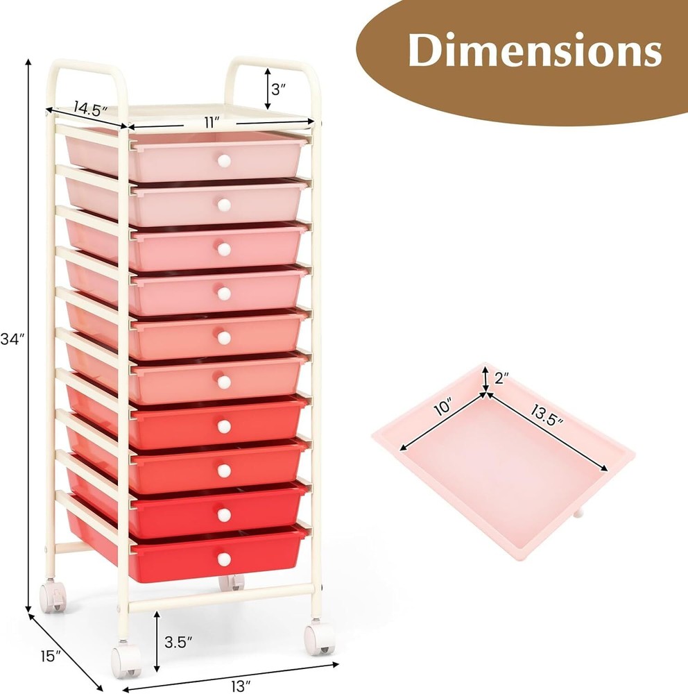 Description: Are you bothered by messy places? This 10 drawers rolling storage cart is the perfect solution for you! Our 10-drawer storage cart has 10 drawers, which provide enough storage space. It was made of chrome steel framed and plastic drawer organizer, which makes this 10-drawer rolling cart durable enough to serve for a long time. Equipped with 4 universal wheels that rotate 360, this home storage cart can easily be moved anywhere you need it. It will be a fancy complement to your office, barber , school, room, living room, bathroom, etc. ✔We can assure you that:No matter what questions you may have, you can send to us at any time. The reply will be sent within 24 hours. Features: Environmental, wear-resisting, and anti aging PP material ensures safe use Steel frame and plastic drawers, durable and can serve your for longtime 10 drawer storage cart providing plenty of space 4 universal wheels(2 with locks) for easy movement and fixation Sturdy steel frame for long lasting performance casters feature brakes to stop and fix it to where you want Colorful boxes good for storing items and decorating your living space Ideal storage box for home, office, barber , bathroom and school Specifications: Color: Black/Yellow/Clear/Rainbow/Multicolor Material: Steel+ PP Drawer Size: 15’’ x 11.5’’ x 2.5’’(L x W x H) Overall Size: 15'' x 13'' x 34'' (L x W x H) Net Weight: 9.5 lbs Package Includes: 1 x 10 Drawers Rolling Cart 1 x User's Manual ✨【10 Drawers for Sufficient Storage Space】: Featuring with 10 drawers, our 10 drawer rolling storage cart provides you with ample space to different categories of items, including makeup, children's toys, watercolor pens, tools, books, cards, snacks, etc. ✨【Wide Range of Usage】: If you want to keep your dressing area, bathroom, or children's room organized and neat, choosing our craft storage organizer cart with drawers will be a smart decision. It will be a fancy complement to your office, barber , school, room, living room, bathroom, etc. ✨【Ultra-Stable & Lightweight Construction】: Made of premium steel, this drawer storage trolley processed with smooth chrome finish to the sturdy frame and durable use. So, the whole frame is not easy to deform and can be used for a long time. Plus, it has a spacious top that can some frequently used items. ✨【4 Smooth Wheels for Better Mobility】: Equipped with 4 universal wheels that rotate 360°, this makeup organizer cart can easily be moved anywhere you need it. of the wheels are designed with lockable brakes to keep it still in a certain position, which help you cope with various situations. ✨【Colorful Decoration & Easy Installation】: Coming with detailed manual, the colorful drawer cart can be assembled well in short time. ⭐Tip: If your plastic drawers are damaged during transportation or have other problems, please our and we will give you satisfactory solutions.