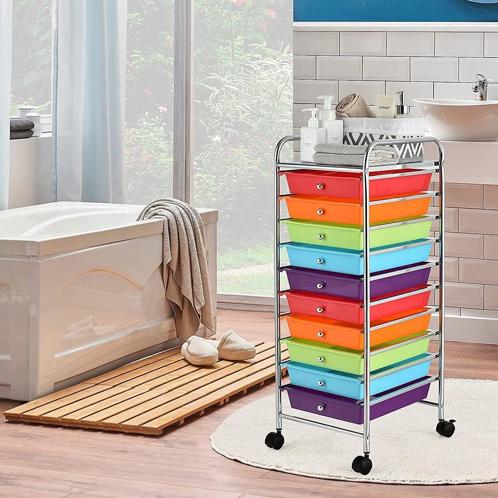 Our rolling storage cart includes 10 drawers, which provide enough storage space. It is Ideal to arrange your different stuff at Office, Home, School and Garage Or Just About Anywhere Organization Is Needed. Made of Chrome Steel Framed and plastic Drawer Organizer, this 10-drawer rolling cart is durable enough to serve you for a long time. Four universal wheels will help you move it easily. Do not hesitate, to buy ! High quality and brand new. 10 moveable drawers for storage. Steel frame and plastic drawers, durable and can serve your for long time. 4 universal wheels(2 with locks) for easy movement and fixation. Drawers slide through metal channels with no resistance. Private, polypropylene drawers protect drawer contents from peeping eyes.