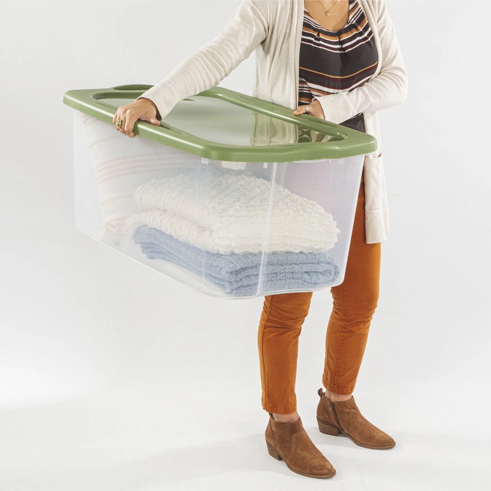 Make moving your storage easier, with innovative line of EZ Carry Storage Boxes and Totes! Unique through handles are designed to provide full grip access for comfortable lifting and carrying, as well as easier maneuvering through doorways, hallways, and up and down stairs. The 120 Quart size is ideal for blankets, sleeping bags, seasonal clothing, sporting gear, and other bigger, bulkier items around the home. The clear base allows for quick viewing of contents, and the recessed lids allow same size storage boxes to stack neatly on top of each other to use vertical storage space efficiently. The 120 Qt EZ Carry Clear Storage Box shares the same lid as the 30 Gallon EZ Carry Tote so the clear and opaque versions can be stacked interchangeably. The overall assembled dimensions of this item are 34" L x 20" W x 15" H. 120 Quart EZ Carry, Clear Plastic Storage Bin, Full-Grip Handles, Green Outside Dimensions: 34" x 20" x 15" Interior Dimensions at bottom: 27 5/8" x 15 7/8" x 14 1/4" Carry through handles allow for full grip access and easier portability Ideal for a variety of household storage needs, with a wide range of sizes The clear base allows for quick viewing of contents Deep recessed lid allows for secure stacking of multiple bases BPA-free and phthalate-free
