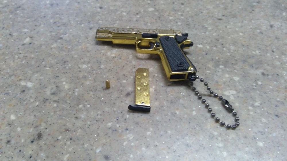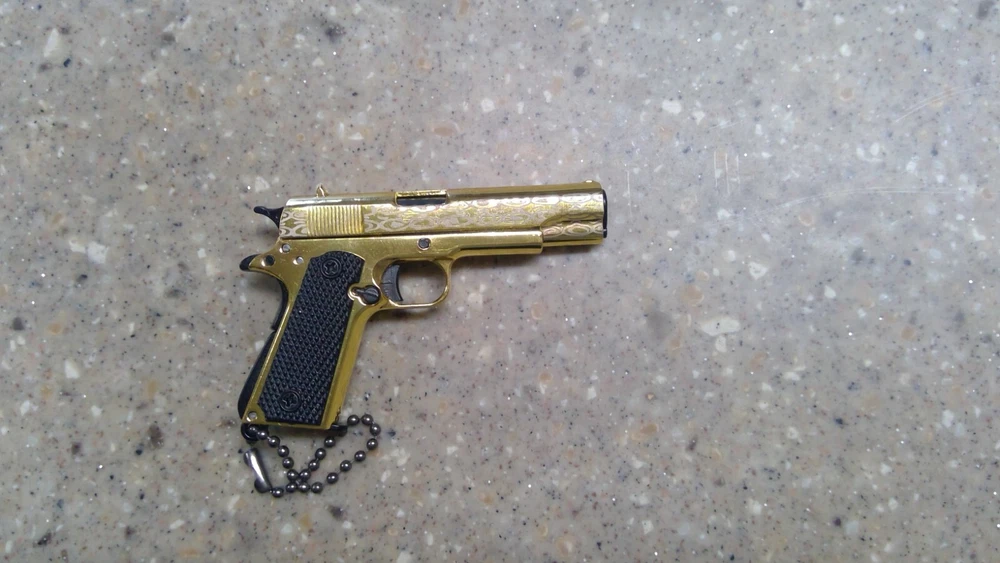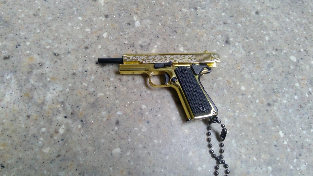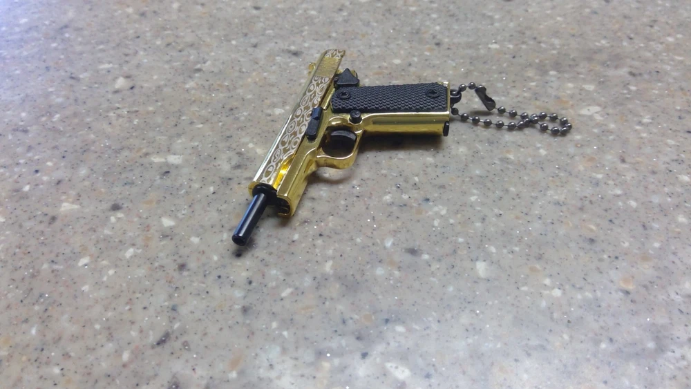 This is a limited edition gold engraved 1:3 mini 1911 metal keychain gun model. It features a detachable keyring and is made of metal. The keychain is designed in the theme of toys and is part of the guns/keychains character family. It was manufactured in China.
