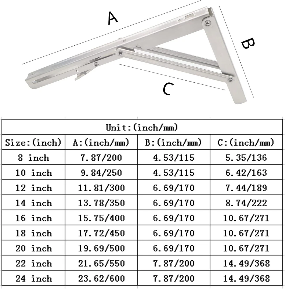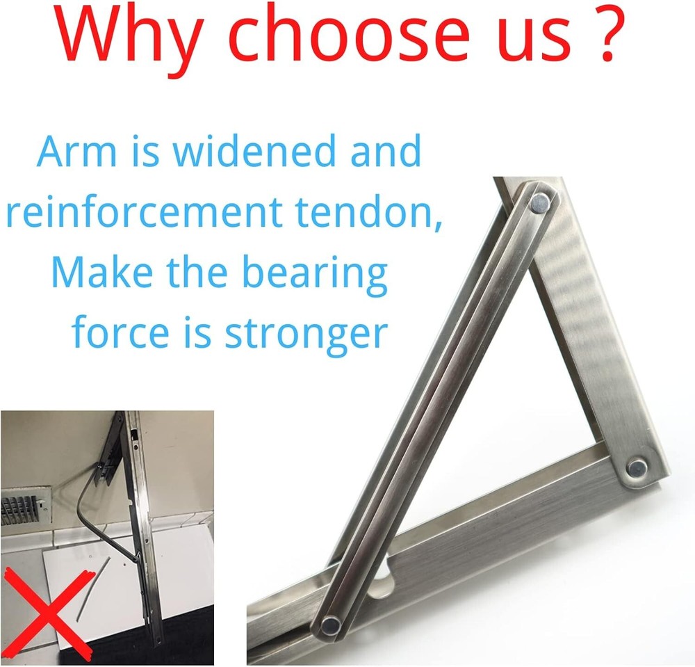 About this item 🍀 More Sturdy:The folding shelf bracket slide reinforced and widened,stronger than ordinary slide to prevent deformation,rivets using strong performance chain nails to prevent rivets from falling off. 🍀 More Durable:The folding shelf brackets heavy duty is made of high quality stainless steel,with good corrosion resistance and rustproof performance.High -quality brushed stainless steel, no need to paint,more durable and healthier. 🍀 Good Quality:The folding table bracket is 90 degrees,the surface is flat;the edge of the collapsible shelf bracket is smooth to prevent scratching;the folding switch is extended to avoid wall wear. 🍀 More Size & Widely Used:Dimensions of the foldable shelf bracket:8 inch-24 inch,Sturdy triangular construction,Max load: 550 lb,These shelf bracket are perfect for many home DIY jobs.Could be used to make a folding workstation in your garage,stores,workshops,boats,motorhome,backyard,trailer,room , kitchen,balcony,bathroom . 🍀 Quality Assurance:Free lifetime technical support.If you have any problem with the goods you received,please contact us by email as soon as possible,and then we can solve your problem quickly.So,please just enjoy this absolutely risk-free purchase.