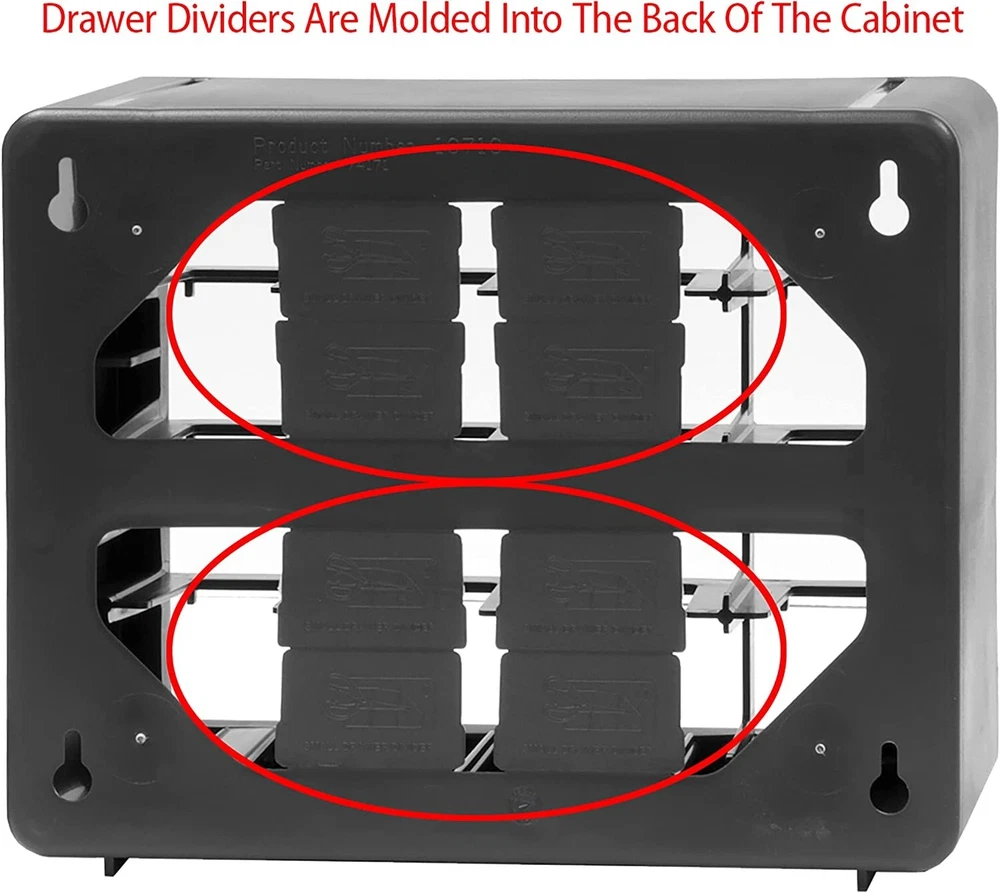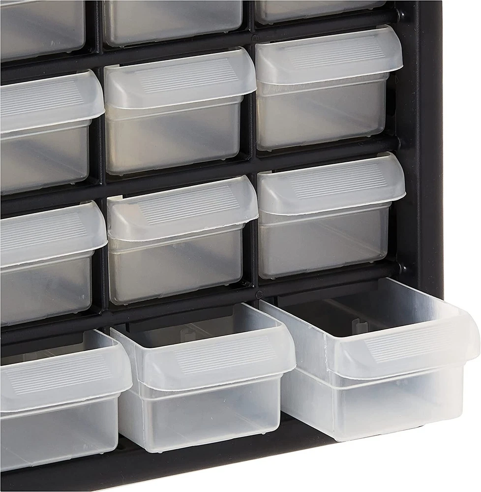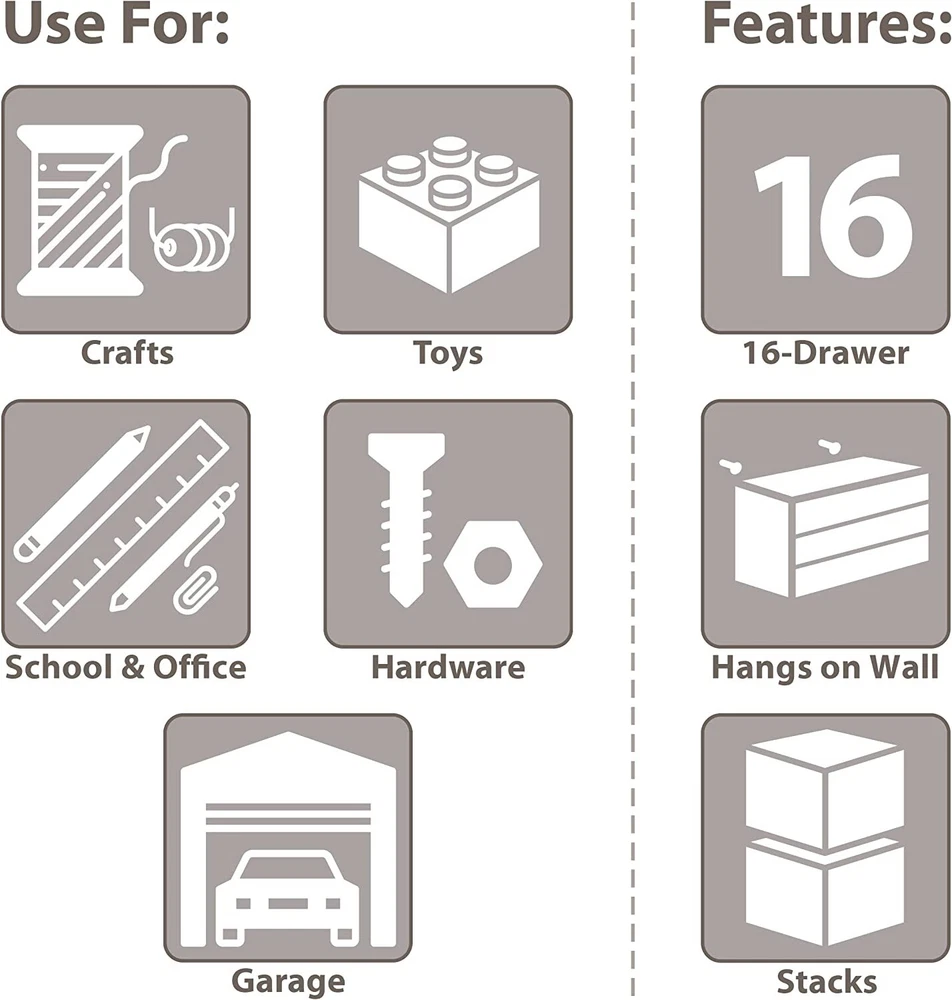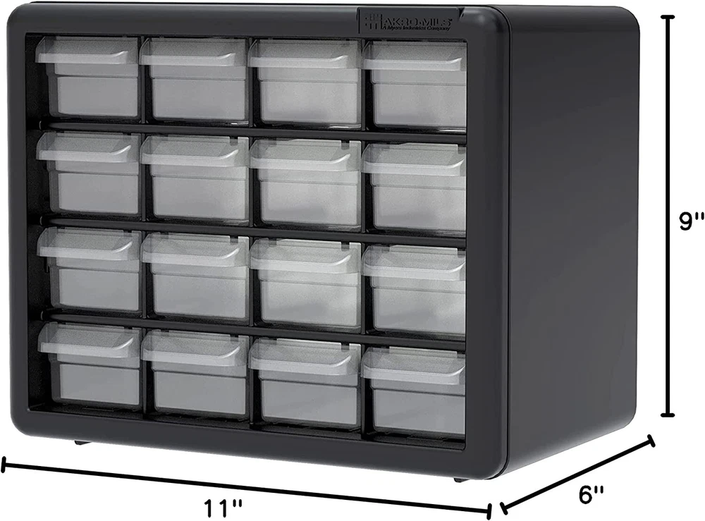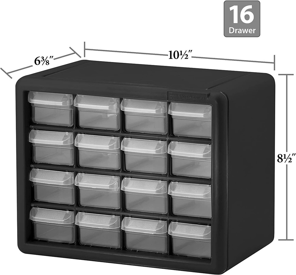 Akro-Mils 16-Drawer Plastic Drawer Storage Cabinet for Garage Organization, Beads, Makeup Organizer, Building Bricks Storage, Teacher Toolbox, 10-1/2-Inch W x 6-1/2-Inch D x 8-1/2-Inch H, 10116 Black Color: Black Size: 16 Drawer Color Black Material Plastic, Polystyrene Frame Material Plastic Brand Akro-Mils Product Dimensions 6"D x 11"W x 9"H About this item plastic HEAVY DUTY CABINET WITH 16 DRAWERS: The 16-drawer small storage cabinet is made in the U.S.A. from rugged, high-impact plastic and measures 10-1/2" W x 6-1/2" D x 8-1/2" H; Organizer drawers - 6" x 2-7/32" x 1-9/16" GARAGE ORGANIZATION: The small parts organizer is great for garages and workshops for both homeowners and businesses; The plastic storage drawers can be used as tool box, screw organizer or for battery storage; Keep nails and other small parts accessible CLASSROOM ESSENTIALS: Teachers can use the stackable storage drawers for classroom organization; Use it as a teacher toolbox, art supply storage organizer, craft storage cabinet for scrapbook supplies, and more HOME STORAGE AND ORGANIZATION: This plastic storage cabinet offers many uses around the home; It can be a lego storage organizer, craft organizer, or sticker organizer; Use it for makeup storage and organization or for medicine and first aid supplies FEATURES: Stack cabinets securely or use keyhole slots to mount for wall storage; Finger-grip drawer pulls provide easy access; Rear stop tabs prevent contents from spilling; Drawer dividers are included and molded into the back of the cabinet (Item does not ship to Miami&Doral, FL), have any problem please contact us !