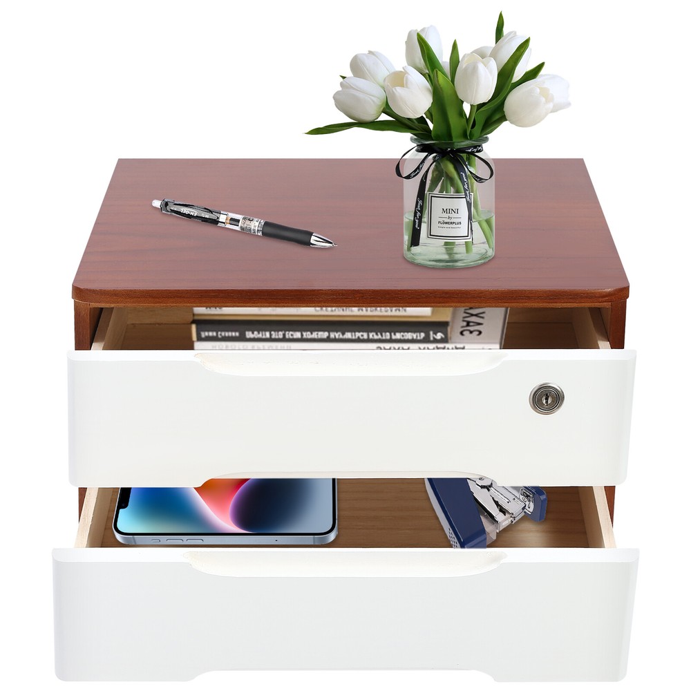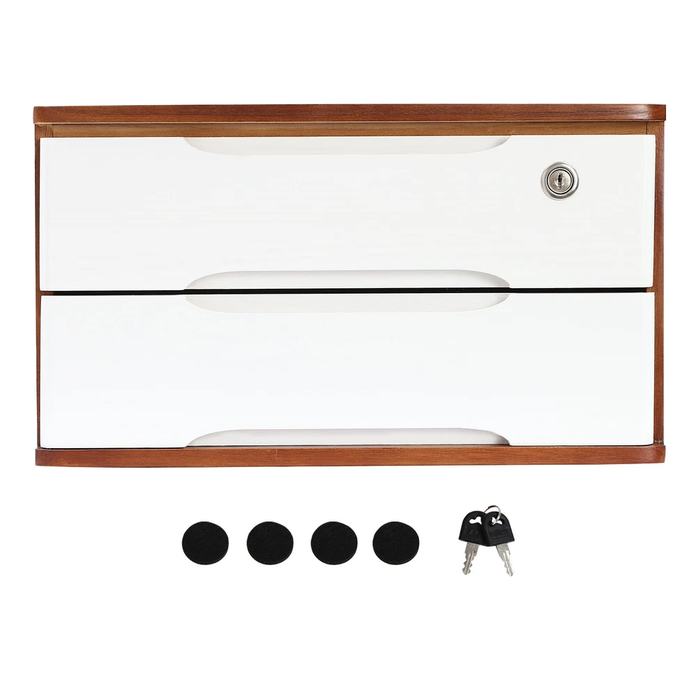 Description Do you feel annoyed by too many items on your desktop that are cluttered and unorganized? Our 2-tier organizer can help you solve this problem. This product is made of high-quality material, which ensures a long service life. The 2 drawers are convenient for you to organize different daily items, and the locking design effective ly protects your privacy. It can effectively help you reduce the pressure on your countertop, which is an ideal choice for you. Key Features Good Material: This product is made of high-quality tung wood with a spray painting process, which is hard, strong, anti-corrosion , not easy to deform, and has a long service life. Categorized Storage: The product has 2 drawers, so you can categorize and store your items in different drawers to give your desktop a neat look. In addition, the top can also be used to hold items, allowing you to maximize the use of your space. Protect Your Privacy: This product features the locking design that locks the drawer and can only be opened with the included key to protect your property. Strong Load-bearing Capacity: High-quality material and stable construction give the product a weight capacity of about 66.14 lbs , so you can store items on it with confidence. Save Space: This product is small in size ( 15.35*11.81*8.46 in ches) , fully utilizing vertical space, thereby reducing the burden on the countertop. Ready to Use: This product does not require assembly, and you can start using it once you receive it, saving the tedious installation process and making it more convenient. Effortless Cleaning: Thanks to the smooth surface and simple construction, you can easily wipe off the dirt on it with a soft cloth. Thoughtful Gift: This is an ideal gift for colleagues, friends, and family to help them organize their belongings and keep their desks tidy. Good Customer Service: We stand behind all our guests and look forward to assisting you with your purchase. It is our pleasure to answer your confusion and questions. The end of the story between us is not "we sell and you buy". Details Comfortable Handles: Each drawer has an ergonomic handle that is not only comfortable but also easy for you to pull the drawer. Smooth Edge: The rounded and smooth edges not only add to the aesthetics of the product but also improve the safety of use. Anti-slip Pad: It can keep the product stable and less likely to slip off while you use it. Application This product can be used in an office, study, bedroom, dresser, kitchen, etc. It is suitable for organizing documents, files, pens, notebooks, handy stickers, remote controls, staplers, cosmetics, greeting cards, tickets, business cards, stationery, jewelry, hair accessories, and so on. Specification Color: Walnut, White Shape: Rectangle Style: Modern Material: Tung Wood Process: Spray Paint Assembly Required: No Number of Tiers: 2 Number of Locks: 1 Number of Keys: 2 Max. Load Capacity: About 30kg/ 66.14 lbs Gross Weight: 4kg/ 8.82 lbs Package Size: 45*33*27 cm/ 17.72*12.99*10.63 in Product Size: 39*30*21.5 cm/ 15.35*11.81*8.46 in Package Included 1* 2-Tier Organizer 2* Keys 4* Anti-slip Pads Notes Please allow the slight color difference caused by the shooting light and the 1-3 cm error due to manual measurement, and make sure you do not mind before ordering. On Feb 16, 2025 at 21:35:01 PST, seller added the following information:
