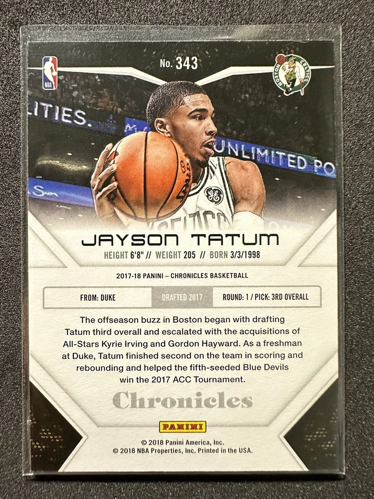Up for sale is a 2018 Panini Chronicles Momentum Jayson Tatum Rookie Card #343. As one of the NBA’s premier young talents and a multiple-time All-Star, Jayson Tatum is widely regarded as a superstar. This rookie card is a fantastic piece for any Tatum fan or collector. Year: 2018 Brand: Panini Chronicles (Momentum Insert) Player: Jayson Tatum (Rookie Card) Card Number: 343 Condition: Mint/Near Mint Jayson Tatum’s incredible scoring ability and leadership on the court make this card a valuable addition to any collection. Whether you’re a die-hard Celtics fan or looking for a great investment piece, this rookie card is a great find. Don’t miss out on adding this collectible to your portfolio!