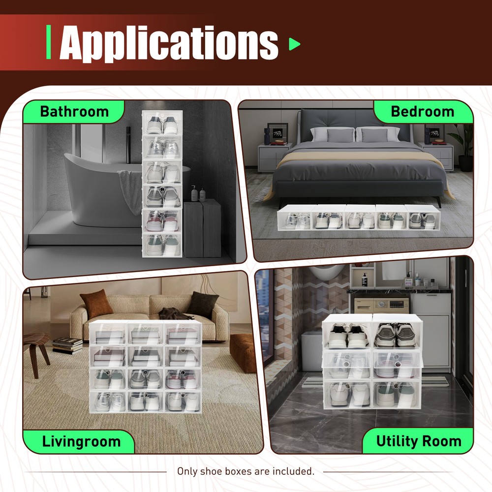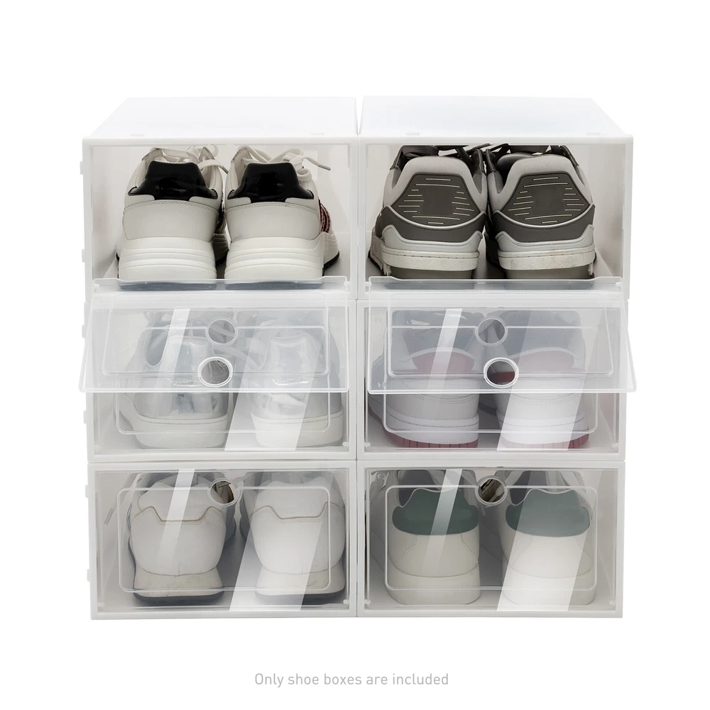 Application This box can be used to put shoes, books, magazines, accessories, cosmetics, and so on. It is suitable for living rooms, bedrooms, study rooms, cabinets, etc. Specification Material: PP, ABS Color: White Special Feature: Stackable, Foldable Shape: Rectangular Quantity: 20 Shoe Size Limitation: <31cm/12.2in(Length); <13cm/5.1in(Height) Each Shoe Box Size: 33*23*14cm/13*9.1*5.5inch Package Included 20* Shoe Doors 20* Shells 20pcs Large Plastic Shoe Storage Boxes Drawer Stackable Foldable Organiser Clear Description Wonderful life starts with organized storage. It has a foldable and stackable design and can be assembled easily. The transparent lid allows you to find the shoes easily and quickly. If you buy this 20 species set, you'll have enough places to put your shoes or other items. Key Features Say Goodbye to Mess : The shoe box can help us sort out messy shoes, create a cleaner and warmer environment for us, and also bring us a more comfortable experience. High-quality Material: Lightweight soft PP is used around the shoe box for the folding function, and ABS and PP are combined for the door frame, which is very stable after assembly. Both PP and ABS are harmless to the body so you can use it with confidence. Large Space: The size of each box is 13*9.1*5.5inch, which can accommodate most shoes. You can store larger shoes staggered according to the curvature of the shoes. Besides, it can also store a large number of clothes and lighten the load of your closet. Foldable Design: This shoe box can be folded into a tiny piece. If you're not using it, you can take it apart and fold it up for storage, saving you a lot of space. Easy to Maintenance: The lid design keeps the entire shoe box free of dust so that the items inside will remain clean. If your shoe box is dirty, you can wipe off the stain with a wet towel or just rinse it with water directly. Clear and Transparent: The front cover of this shoe box is completely transparent, so you can quickly find the pair of shoes you want to wear and save critical time and turn your frantic frustrated mornings into a breeze. DIY Placement: You can stack these 20 shoe boxes into different shapes according to your own furniture arrangement and preference. If your room is not big enough, you can increase the stacking height so that you can free up more space. Versatile: The white color scheme can easily fit into different style scenes. In addition, different overlapping methods can show another style and enhance the design of the room. Easy to Install : Thanks to its simple structure, this shoe box is very easy to install. We will also provide you with a detailed installation video in English as a reference. Details Round Hole in the Door: With this hole, your fingers can easily hook the door to open it. It also promotes air circulation and prevents shoes from getting damp and smelling Snap Connection: The white frame of this shoe box is designed with attachable snaps. By locking the snaps, the overlapping shoe boxes can be firmly attached together. Oblique Stripe Design: The surface of this shoe box is designed with uneven stripe lines, which increases the friction of the shoe box. So the overlapped shoe boxes are more stable. Application This box can be used to put shoes, books, magazines, accessories, cosmetics, and so on. It is suitable for living rooms, bedrooms, study rooms, cabinets, etc. Specification Material: PP, ABS Color: White Special Feature: Stackable, Foldable Shape: Rectangular Quantity: 20 Shoe Size Limitation: <31cm/12.2in(Length); <13cm/5.1in(Height) Each Shoe Box Size: 33*23*14cm/13*9.1*5.5inch Package Included 20* Shoe Doors 20* Shells Notes Please do not put too heavy items on the shoe box to avoid it deforming. If your shoes are a little big, try to put them staggered because the shoes have curves. This shoe box can hold a pair of shoes with a height of less than 5.1 inches and a length of less than 12.2 inches. Please allow the slight color difference caused by the shooting light and 1-3 cm error due to manual measurement, and make sure you do not mind before ordering. Payment Delivery details Terms of sales About us Contact us Payment We accept ebay payment 。 Fees such as import duties, taxes are not included in the item price or shipping costs. These charges are the buyer's responsibility. Delivery details Shipping: 2-9 working days to: USA Terms of sales We maintain high standards of excellence and strive for hundred percent customer satisfaction. Feedback is very important to us. We hope that you contact us immediately before you give neutral or negative feedback, so that we can address your concerns. It is impossible to address issues if we do not know about them! About us Your satis faction is our ultimate goal. We work hard to earn your trust and future business. Our certified technicians have tested each item before shipping. The unit comes with 1 year limited warranty on all manufacturing defects. a) If you receive a defective item, you may return it or ask for a discount. Please contact us within 14 days after you receive the package. b) What you returned must be intact and in its original packaging as re? u. Customer is responsible for shipping costs of the returned item. c) We will cover the cost of shipping back t with the shipping rate indicated in the registration page. We will send you a new unit or refund the full payment you paid. Thank you. Contact us Business Hour Business Hour: Monday To Friday: 8:30 AM to 5:00 PM (Beijing China time) Due to time zones, our reply to your questions may not be immediately. But within above working time, we will reply your email within 24 hours. If it's non-workdays, please kindly be patient and wait till Monday. Please contact us with ebay message. Please feel free to contact us if you have any questions. Monday To Friday: 8:30 AM to 5:00 PM (Beijing China time) Due to time zones, our reply to your questions may not be immediately. But within above working time