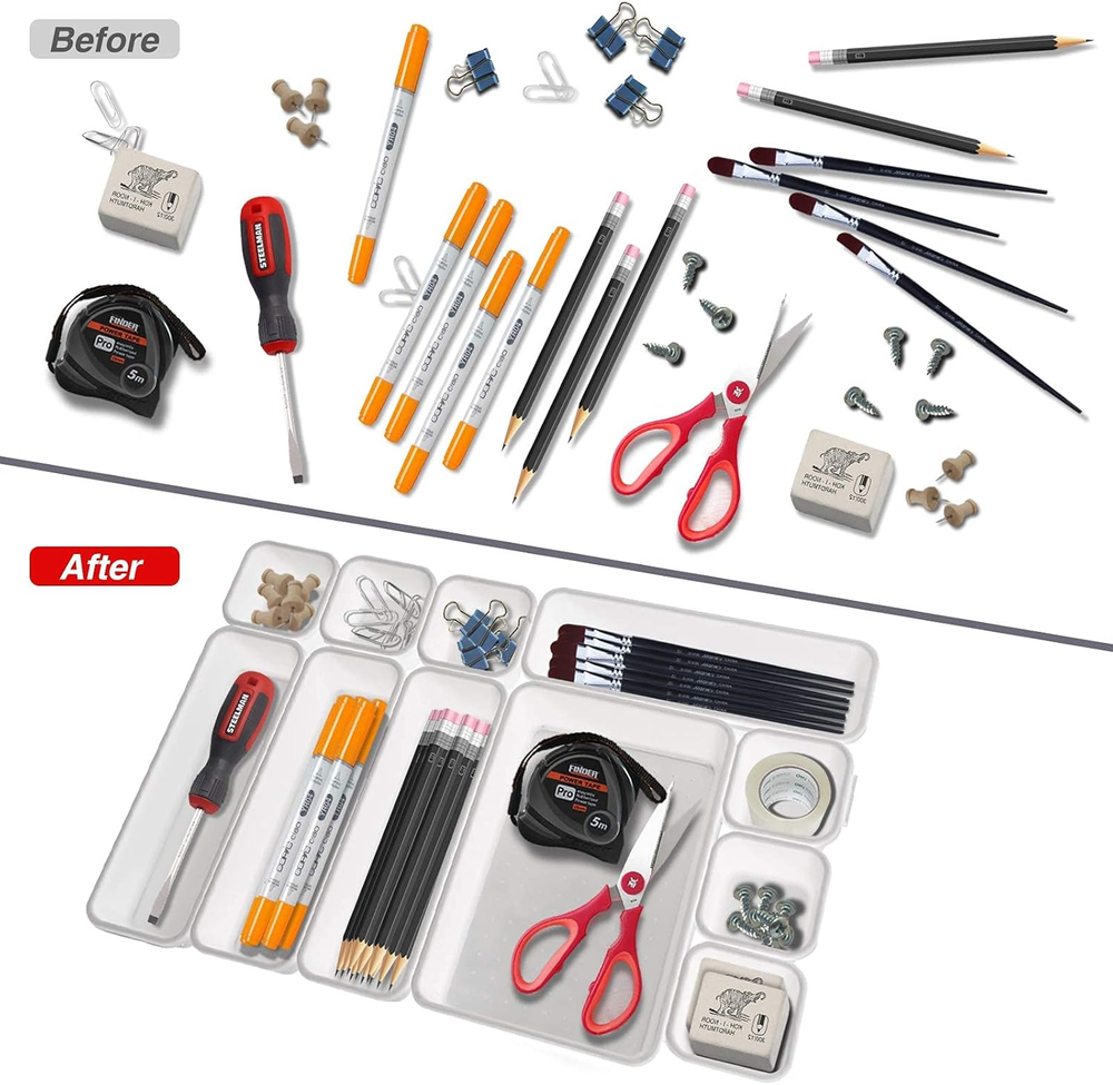 Separate and Stackable - These sturdy desk drawer organizer set can be stacked together, or each one works alone. The interlocking feature of the junk drawer organizer help you create your own mix.Keep everything organized, No more trouble finding things. Durable Material - These shallow drawer organizers are made of high-quality and solid durable plastic material.Drawer organizer bins are break-resistant and could accommodate different items and match organizational system to fit in any drawer. Multi-purpose drawer organizer tray - Designed for multipurpose solutions, perfect for dresser, bathroom drawer, kitchen drawer, office desk etc.Cosmetics, brushes, daily necessities, tableware, fruits, jewelry, tools, pencils can be easily stored. Easy to Care - Rounded corners plastic drawer organizer allow for easy use and cleaning.You could wipe clean with soap and sponge when it is dirty.The drawers can be stored permanently. Customize Combination - 22 pack flexible small drawer organizer with 3 various sizes allow for a good variety of layout. Items are organized according to size and use. contains 12pcs Small:(2.9×2.9×1.9 inch) - 7.5×7.5×4.8 cm,8pcs Medium:(9×2.9×1.9 inch)- 23.5×7.5×4.8cm,2pcs Large:(9×6×1.9 inch)-23.5×15.5×4.8cm. Product Description This desk drawer organizer set is perfect for dresser, bathroom drawer, kitchen drawer, office desk etc.Keep everything organized, No more trouble finding things.