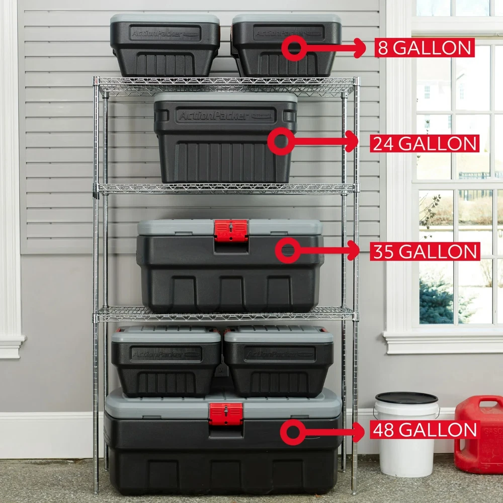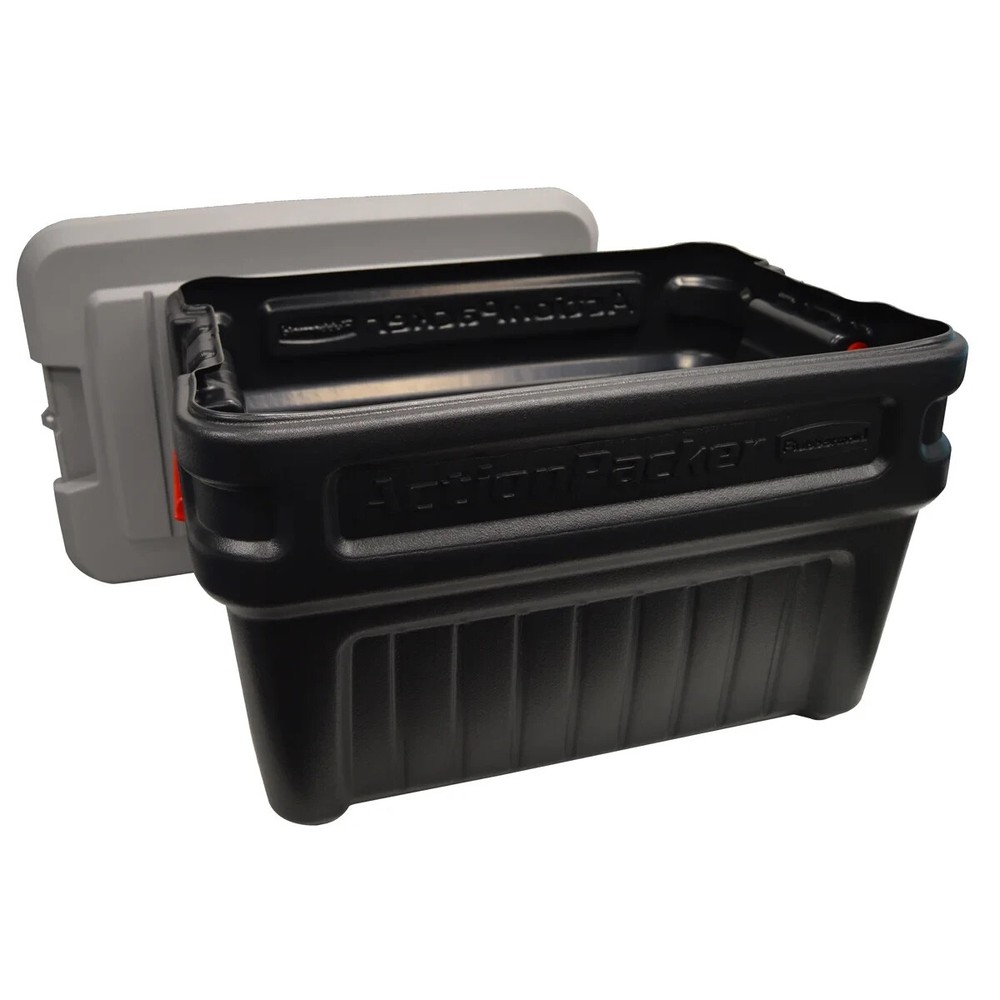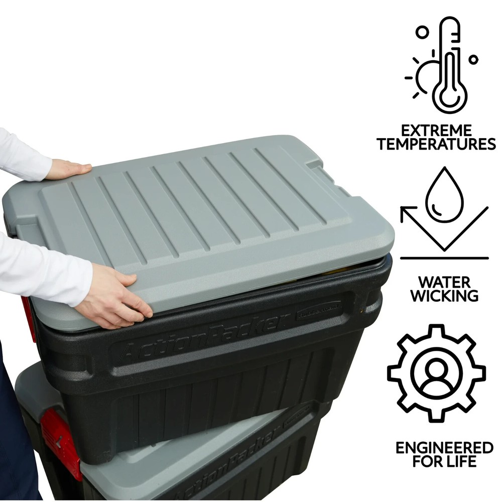Product details The Rubbermaid 24 Gallon ActionPacker Storage Bin is tough and can withstand everyday usage. This heavy duty storage tote is made of impact resistant material and can withstand temperatures of 0-100 F. Featuring a double-walled lid, this storage bin will keep all contents safe and dry and is designed to prevent water from pooling on the lid top. This container also is designed to accommodate a lock, adding extra security to your contents. This storage container provides a storage solution for anything whether it be sports equipment, camping supplies, or even a tool chest. Rubbermaid 24 Gallon ActionPacker Storage Bin, Heavy Duty, Lockable, Black, Included Lid Black base with grey lid and red handles Stackable Outside dimensions: 26.000 in. L x 18.500 in. W x 17.000 in. H Inner dimensions: 20.000 in. L x 14.500 in. W x 15.000 in. H 24 Gallon / 90.8 Liter load capacity, 50 pounds