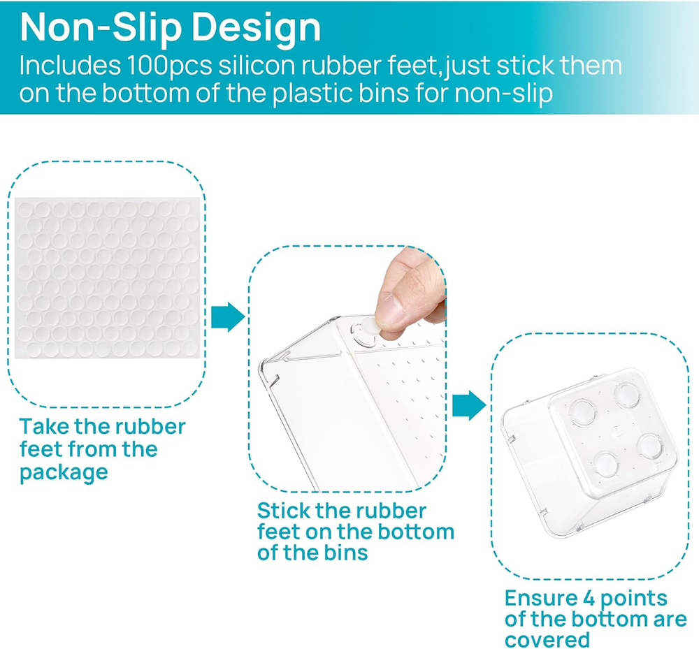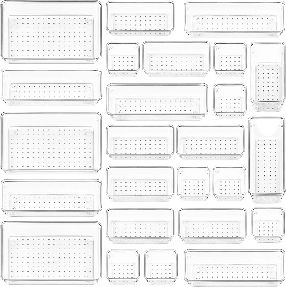 ✔Make Everything Organized -- These clear versatile drawer dividers trays are perfect for any place in your home. Fit all kinds of drawers, such as vanity / bathroom / kitchen / office drawers/ craft room, ideal for organizing cosmetics, makeup tools, hair accessories, jewelry, pins, office supply, craft supplies, utensils, etc. ✔Combination of 4 Different Sizes -- One set includes 25pcs storage bins in 4 different sizes, which help you customize combinations to store items and organize drawer in shelf/ closet/ cabinet/ dresser . Includes: 9 x 6 x 2 inches (3pcs), 9 x 3x 2 inches(6pcs), 6 x 3 x 2 inches(8pcs), 3 x 3 x 2 inches(8cps). ✔Non-Slip and Durable -- Extra 100pcs silicone pads are included, just stick them on the bottom of the plastic trays for non-slip. Made of durable and clear plastic, so you can see what’s in it without digging around or making a mess, help you get a neat lifestyle. ✔Stackable Storage -- The drawer bins can be stacked into one other when you not use them, that will save much space and organize well. You will find it's so easy to keep things neat and tidy. ✔Easy to Clean -- Our desk drawer storage bins are easy to be wiped clean with a damp cloth and perfect for keeping everything in its place. Convenient for use in your daily life, make everything look beautiful and better organized. Product Description Vtopmart 4 sizes drawer organizer trays are perfect for various drawer in kitchen/ bathroom/ bedroom/ vanity and more. 1 Makeup Organizer 2 Bathroom Organizer 3 Office Organizer 4 Kitchen Organizer 5 Tool Organizer Size Info More options for package quantity Add to Cart Add to Cart Add to Cart Add to Cart Add to Cart Add to Cart Add to Cart Customer Reviews 4.7 out of 5 stars 33,707 4.8 out of 5 stars 489 4.8 out of 5 stars 338 4.8 out of 5 stars 1,539 4.7 out of 5 stars 1,620 4.8 out of 5 stars 461 4.8 out of 5 stars 580 Price $18.99 $ 18 . 99 $15.99 $ 15 . 99 $15.29 $ 15 . 29 $24.99 $ 24 . 99 $29.99 $ 29 . 99 $33.99 $ 33 . 99 $40.99 $ 40 . 99 Quantity for 9 x 6 3 3 1 PCS 9.9 x 6.3 6 6 11 12 Quantity for 9 x 3 6 1 2 PCS 9.9 x 3.2 10 10 14 20 Quantity for 6 x 3 8 3 2 PCS 6.3 x 3.2 6 14 23 18 Quantity for 3 x 3 8 3 1 PCS 3.2 x 3.2 6 14 18 22 Quantity for silicone pads 100pcs 50pcs 50pcs 150pcs 200pcs 300pcs 350pcs Is the drawer organizer fully square that is straight 90 degree sides? These drawer bins are wider at the top and narrower at the bottom, please carefully check the size in detail page. Drawer organizers are widely used in different size drawer in bathroom, vanity, dresser, office, keeping your home well organized. Are these drawer bins BPA free? Yes, these drawer organizers are made of plastic, and all material are BPA free