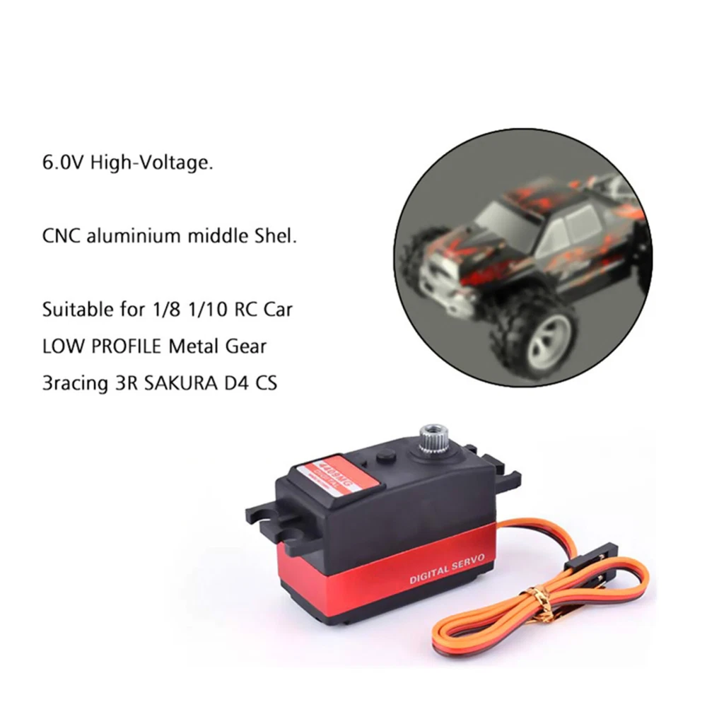 This servo is a beast! Instantly noticed the smooth, precise control thanks to the high-quality metal gears and double ball bearings. The torque is insane—handles rough terrain and tight turns like a champ. Super responsive at 6.0V, and the aluminum build feels premium. Perfect upgrade for 1/8 or 1/10 scale RC cars, especially if you need durability and power. No lag, no play, just pure performance. Worth every penny!