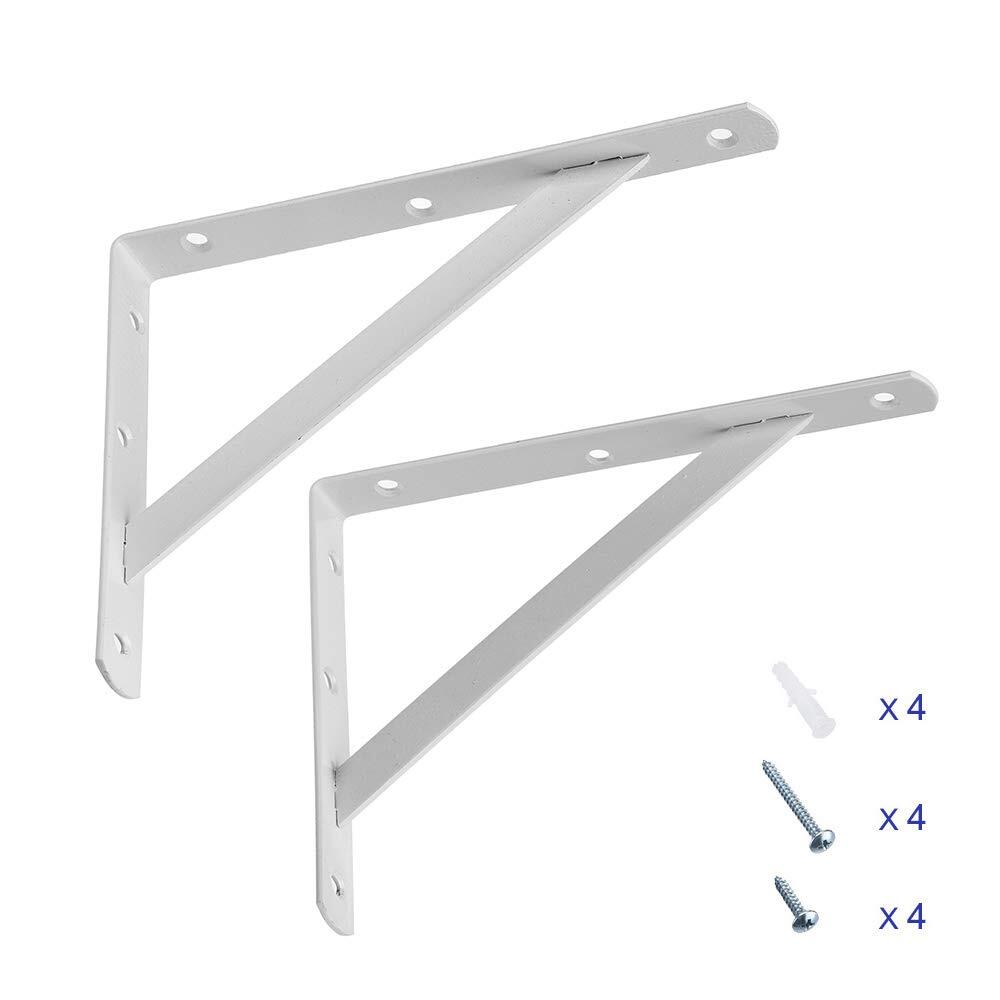 Product Description This white shelf bracket is perfect for display bookshelf, bookracks, storage shelf ,exhibition stand ,etc. Made of heavy duty cast iron, with premium matte white coat finished, adds a touch of industrial and rustic taste to your home Coming with screws and anchors, easy to install. Shelf Brackets Dimension-10*8 inch (250*200 mm); Thickness-3mm; Width-25mm Package included: 2 x Angle Brackets,4 x long screws, 4 x short screws and 4 x anchors, NO WOOD BOARD INCLUDED WIDE APPLICATION---This white shelf bracket is perfect for display bookshelf, bookracks, storage shelf ,exhibition stand ,etc. STURDY & RUSTIC--- Made of heavy duty cast iron, with premium matte white coat finished, adds a touch of industrial and rustic taste to your home EASY INSTALLATION --- Coming with screws and anchors, easy to install. MEASUREMENT---Shelf Brackets Dimension-10*8inch(250*200mm); Thickness-3mm; Width-25mm PACKAGE INCLUDED –-- 2 x Angle Brackets,4 x long screws, 4 x short screws and 4 x anchors, NO WOOD BOARD INCLUDED