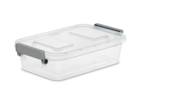 (2 pack) Sterilite 2.7 Qt. Modular Latch Box Plastic, Titanium Product details Sterilite's Modular Latch Boxes help make small storage organization easy! Available in a wide range of sizes and designed to stack and use vertical storage space efficiently. The color accented write-on latches keep the covers secured to the base while providing a space for labeling, making personalization simple! Label by contents, activity, or by name, use a dry-erase marker to erase and re-label as necessary or apply a standard adhesive label. Use the 2.7 Qt size for organizing closets, craft areas, play rooms, office spaces, bathrooms, workshops and more! Keep health and beauty items, accessories, and craft supplies, neat and contained, where they are most frequently used. Its clear base and lid allow items to be viewed from any angle. The 2.7 Qt and 5.5 Qt have the same size lid, allowing shallow and deep containers to stack in the same footprint. The overall assembled dimensions of this item are 11 3/4" L x 7 3/8" W x 3 1/4" H. About this item Sterilite Adult Plastic 2.7 Qt. Modular Latch Box Titanium: Outside Dimensions: 11 3/4" x 7 3/8" x 3 1/4" Use the 2.7 Qt size for organizing your living spaces - store health and beauty items, accessories, craft supplies, and more Single unit option Clear base and lid allow contents to be viewed at a glance, making them easy to find - Titanium Interior Dimensions at bottom: 9 1/2" x 6" x 2 5/8" Write-on ID Latches make personalizing storage easy Ideal for a variety of small storage needs Dry-erase markers easily erase if relabeling is needed Stack for efficient use of vertical storage space BPA-free and phthalate-free