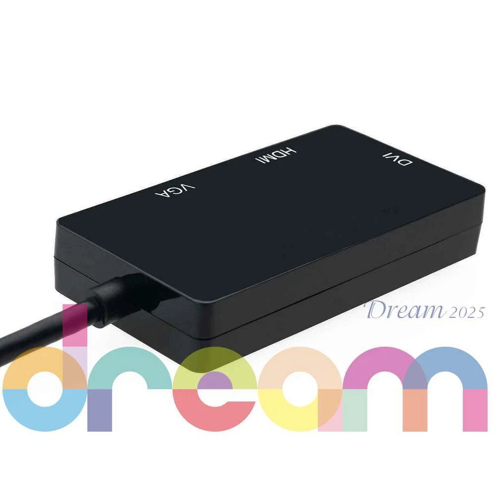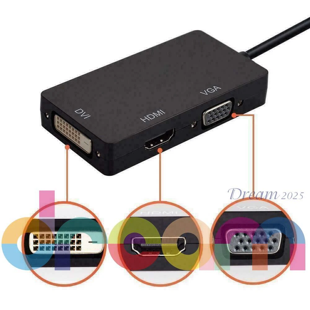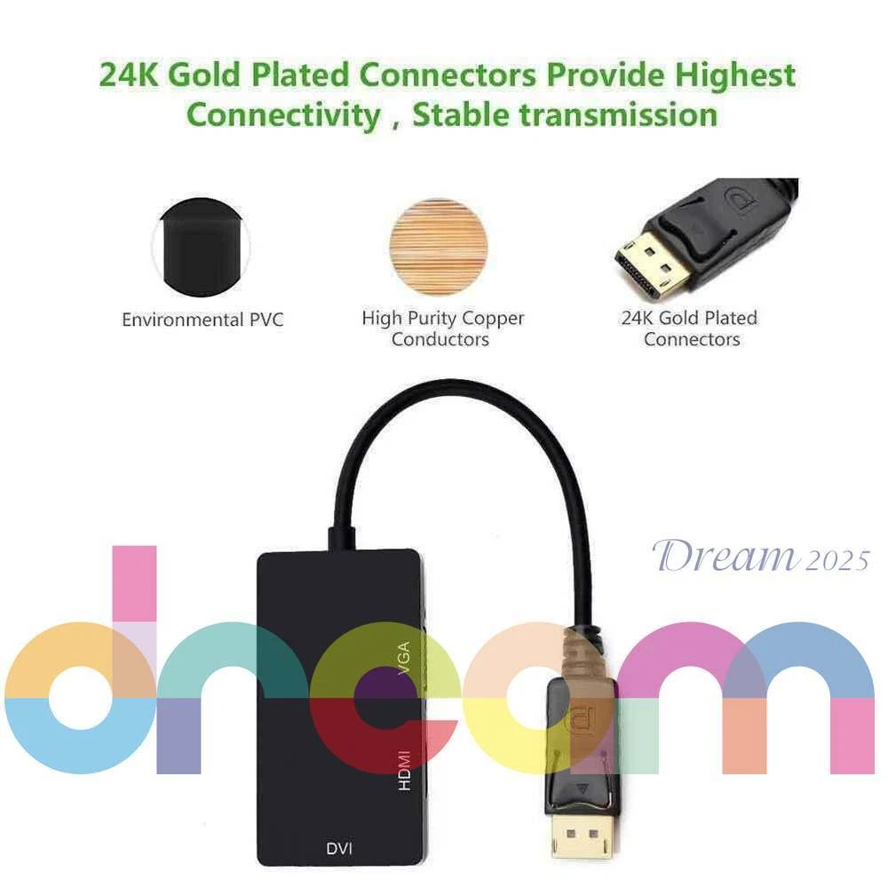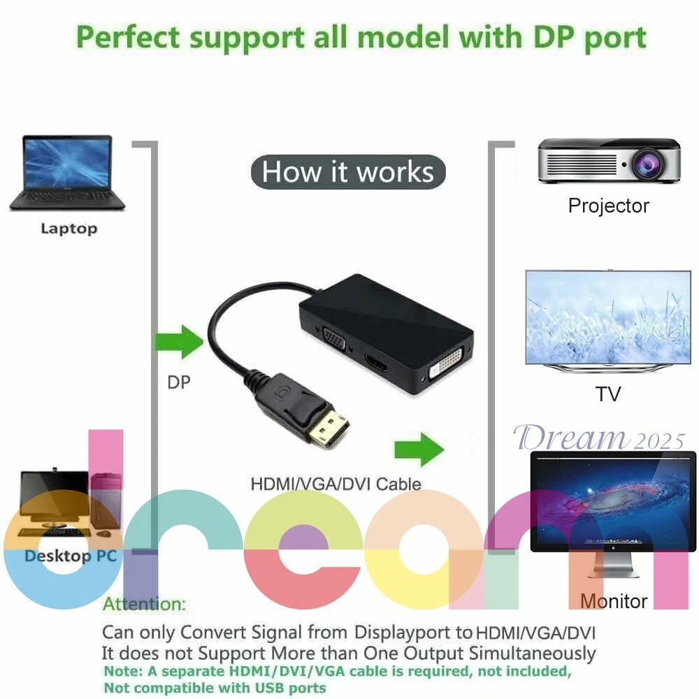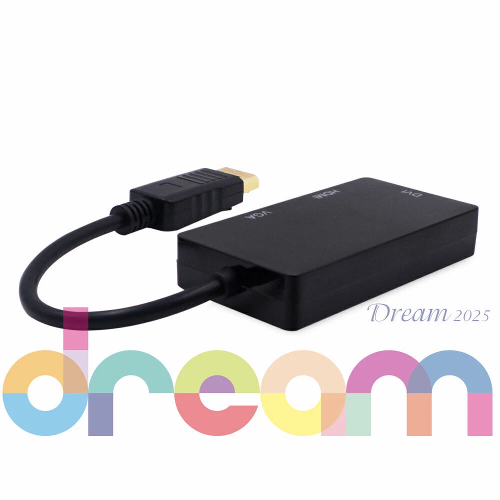 Brand New 3 In 1 Displayport DP Male To HDMI/DVI/VGA Female Adapter Converter Cable 1080P Features Connects a DisplayPort DP equipped laptop or desktop to an HDTV, monitor, or projector with HDMI/DVI/VGA; Only supports 1 display output at a time, HDMI/DVI/VGA cable (sold separately) is required. Transmits high-definition audio and video from your computer to an HDTV display for video streaming or gaming via HDMI; Connect and configure your monitor for an Extended Desktop or Mirrored Displays Supports video resolutions up to 1920x 1080P (Full HD) and uncompressed digital 7.1, 5.1 or 2 audio channels.When connect to monitor, audio will not pass through the adapter to the HDMI/VGA/DVI monitor, a speaker is needed to get audio out; When connect to TV, only HDMI port can have audio out, VGA and DVI ports need a speaker to get audio out Silver-plated connectors resist corrosion, provide durability and improve the signal transmission DisplayPort connector with latches provides a secure connection with a release button that must be depressed before unplugging Specifications Can only convert signal from DisplayPort to HDMI/DVI/VGA. This is not a bi-directional adapter Input: DisplayPort Male,(Not compatible with USB ports) HDMI: Output, 19-pin, Female (Note: A separate HDMI cable is required, not included, ) DVI: Output, 25-pin DVI-D (Note:A separate DVI cable is required, not included ) VGA: Output, 15-pin, Female (Note:A separate VGA cable is required, not included) Note: Not compatible with USB ports - Color: Black IMPORTANT NOTE - It does not support more than one output simultaneously - When connect to monitor, audio will not pass through the adapter to the HDMI/VGA/DVI monitor, a speaker is needed to get audio out; When connect to TV, only HDMI port can have audio out, VGA and DVI ports need a speaker to get audio out - Depress the button on the DisplayPort connector to release the latches and avoid damage when unplugging - This adapter is NOT compatible with USB port on your computer Includes 1 x Displayport Dp to Hdmi/dvi/vga Male to Female 3-in-1 Adapter Converter Cable Warranty : 12 Months Return & Refund : Refund or replacement request is available only the requests within 1 week after parcel received & returning the item as the same condition as received. Shipping : We ship to eBay address. Please make sure your address in ebay is matched with your shipping address before you pay. W e ship your product in 3 days and provide the tracking number. Generally, about 5-10 working days to UK, USA, AU, CANADA, France,Germany,Japan South korea. Other countries in the region: usually takes 15-30 working days. You may sometimes experience longer delivery time due to customs-related delays. If you we are not satisfied with the product or service ,please contact me and don't give us negative or natural feedback,We must give you a satisfactory solution. We have many products not listed.Please send message If you need more with better price. Our working time: Beijing time :Monday to Friday 9:00 am to 6:30 pm. We do not work holidays in China. if you send email to us,In our working hours will be resumed within 48 hours. Feedback & DSRs (Detailed Seller Ratings): We depend on our eBay reputation and customer satisfaction to succeed. We would like to earn your good feedback and 5 star DSR rating.