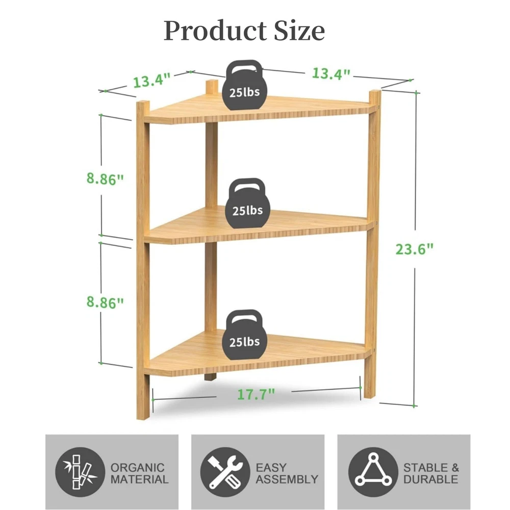 【ECO-FRIENDLY SUPERIOR MATERIAL】The entire frame of our 3-tier shelf consists of environment-friendly and sturdy . Durable and long-life in use. 【MULTIPURPOSE SHELVING】This corner cabinet organizer can be put in various places such as the bathroom, hallway, living room, bedroom, balcony, etc. Place towels toiletries, or any other stuff like books, plants, and photos. 【SPACE SAVING】Size: 13.4"D x 13.4"W x 23.6"H. It occupies a small area which greatly helps you save storage space. Perfect for any small corners in the living room and bedroom. 【STABLE & DURABLE】 The triangle shape is the most stable, which constitutes a sturdy base. Our corner shelf stand is put in your shower for convenient accessing bath supplies while keeping them tidy. It won't be affected to fall apart by humidity. 【EASY TO ASSEMBLE】All parts and hardware plus detailed instruction are included for easy assembly, you can successfully install it in several minutes.