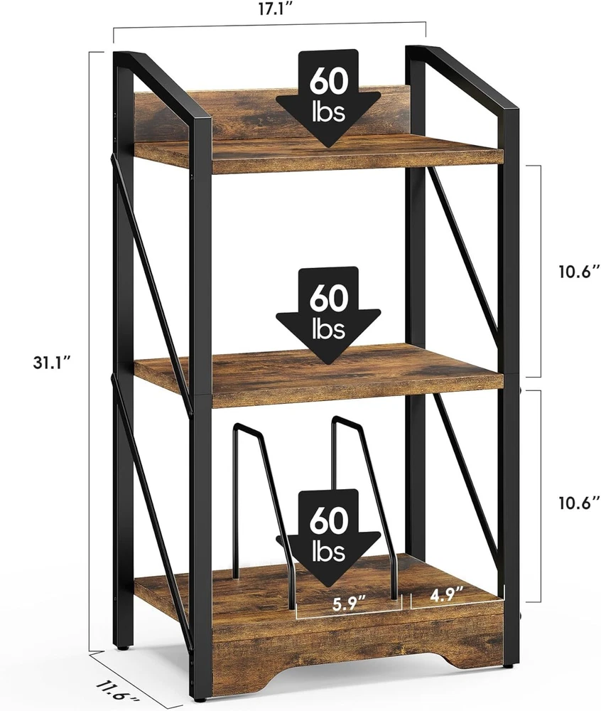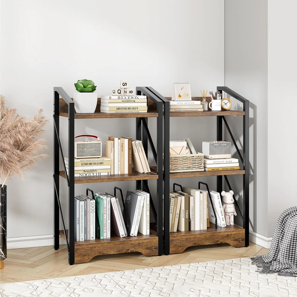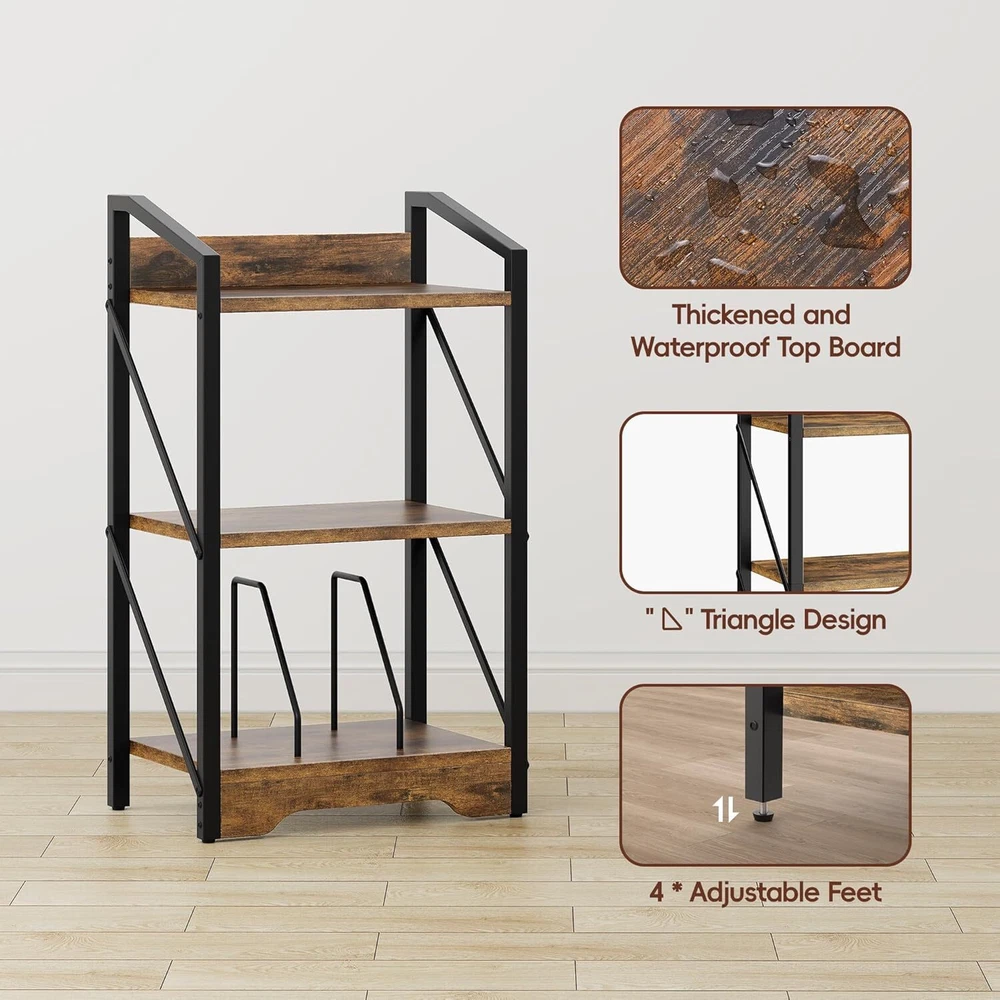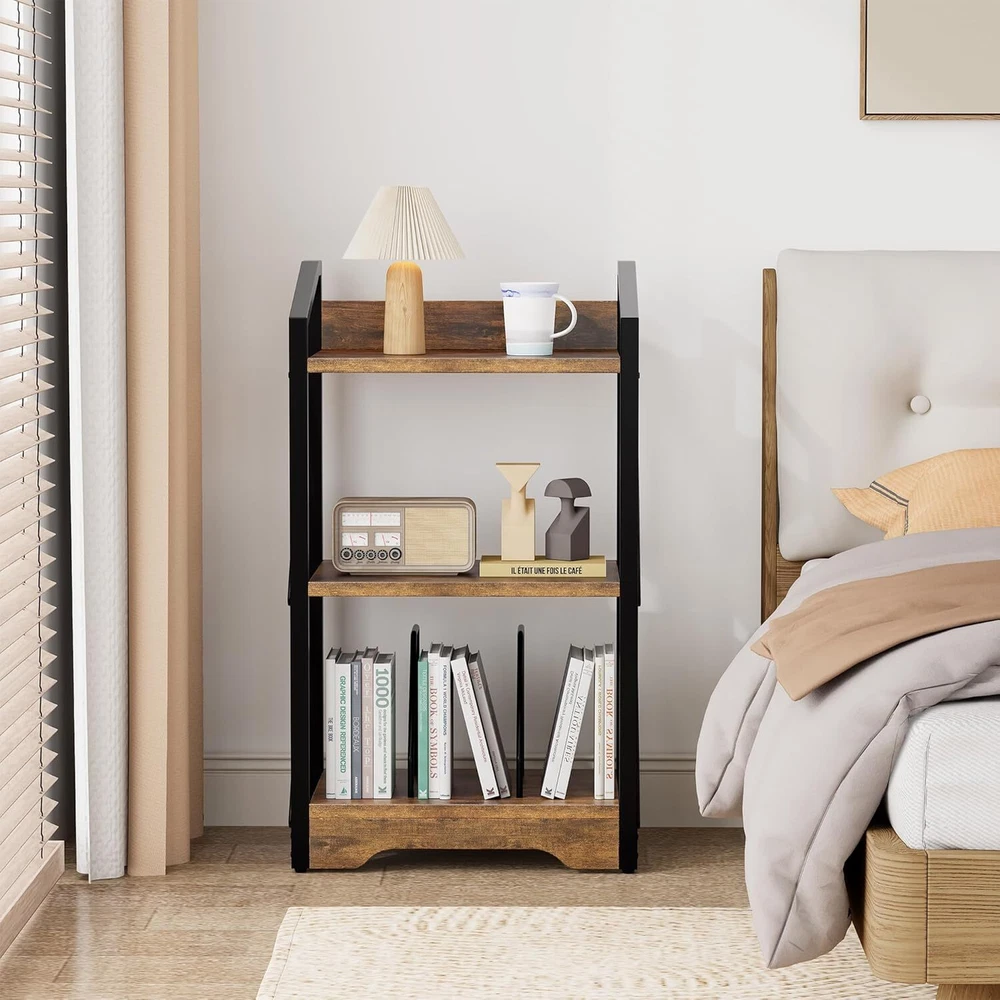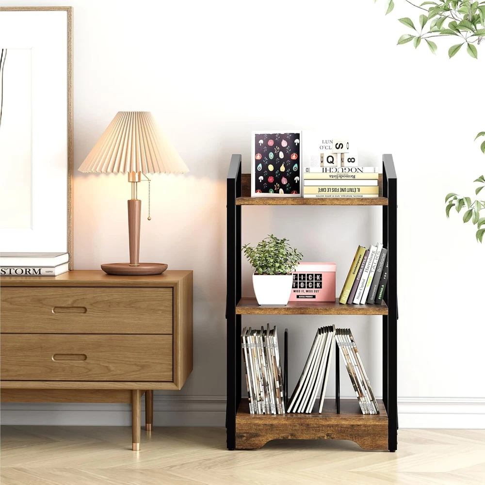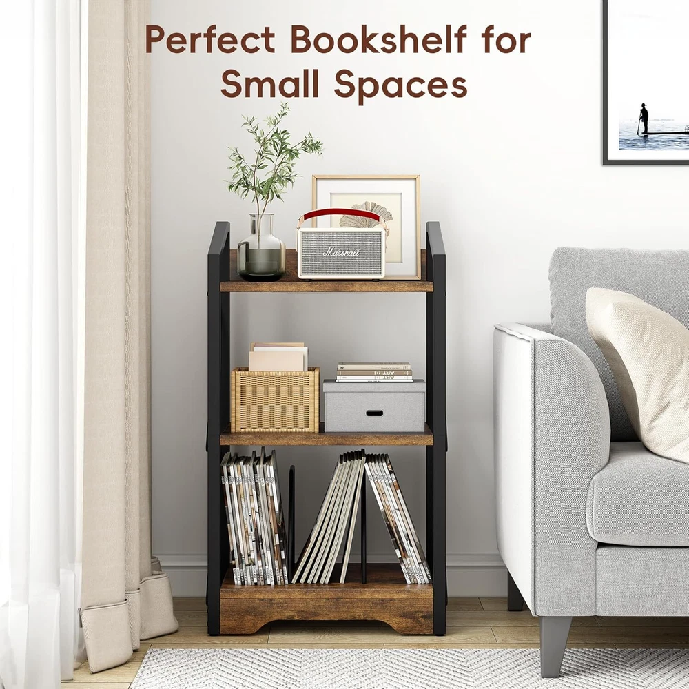 3 Tier Industrial Bookcase, Metal Small Bookcase, Rustic Open Book Shelf (Brown)