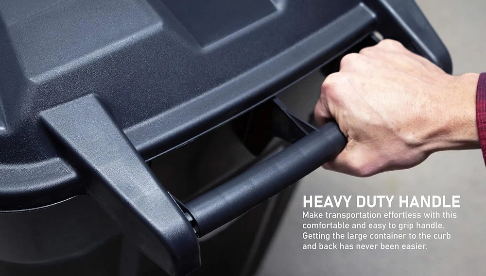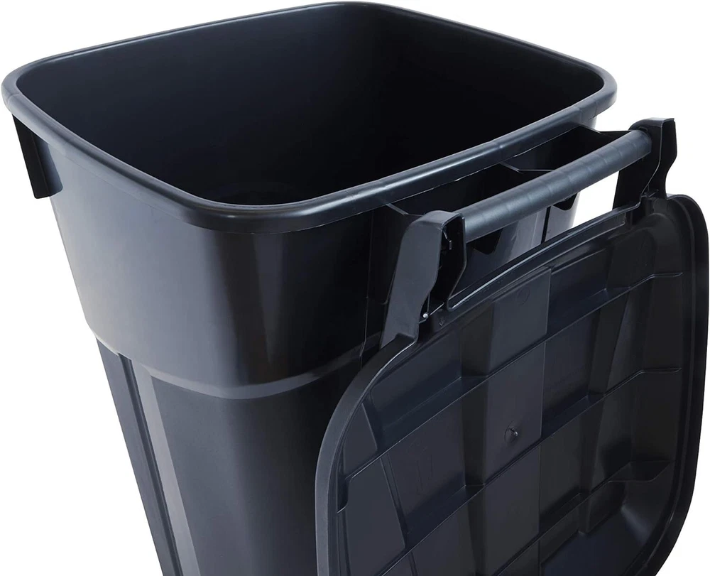 32 Gallon - 2 Pack Features: Heavy-Duty, Lock Lid, Sturdy, Reliable, Wheeled Securely Attached Lid – With the attached snap lock lid, this trash can will make it simple to place trash inside and keep it there. Leave this trash can with lid in your driveway backyard and know that everything is secure, even in windy conditions. Heavy Duty Handle – Make transportation effortless with the comfortable and easy to grip handle on this black trash can with wheels. Paired with the integrated wheels, getting this 32 gallon trash can to the curb and back has never been easier. Rugged Wheels – Built tough, these wheels make for smooth transport while the garbage can is in use, making this perfect for outside use on your patio, deck or in your garage. Tote this trash bin wherever you need it to go without having to lift it. Withstand the Elements – This outdoor trash can is with heavy-duty polypropylene and durable construction to endure extreme temperatures and rough use. The large bin on wheels is impact resistant and can be trusted on rough terrain and smooth ground. Multiple Uses - The sleek design and size of this black trash can make it a versatile addition to any space. Perfect for use in the garage, on the patio, or at the office. Use it as a dog food bin, recycle bin, deck storage container, and more.