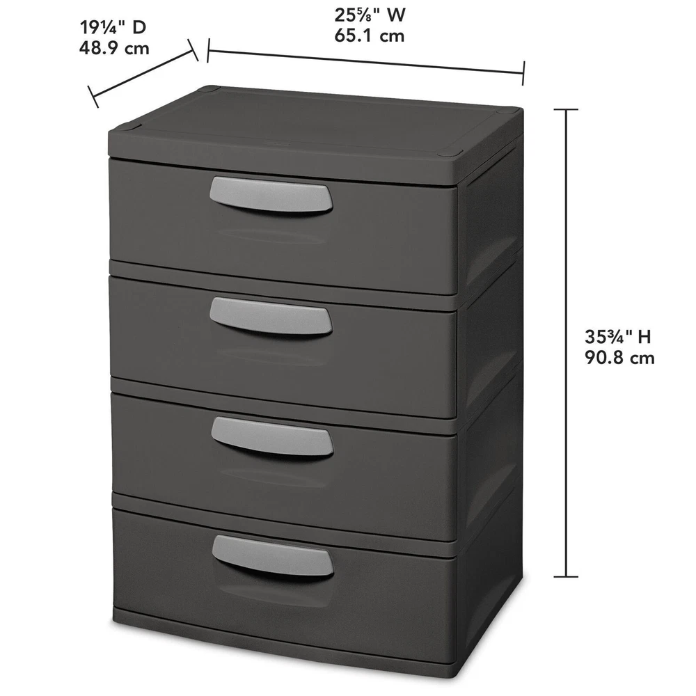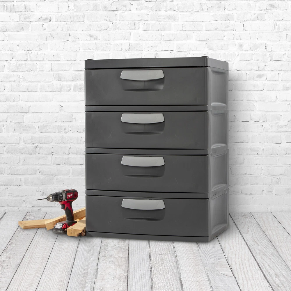 Triple Strength Glucosamine Chondroitin Tablets Dietary Supplement 340 Count 38.03 USD 40.46 USD Free shipping 6% off Portable Training Kit for 9mm Dry Fire Laser Training System for Target Practice 109.99 USD Free shipping 36 Mega Rolls 2-Ply Toilet Paper Soft Strong Septic Safe Bulk Pack 11520 Sheets 29.14 USD 31.0 USD Free shipping 6% off Metal Storage Cabinet with Doors and Shelves 5 Tier Metal Pantry Closet Cupboard 175.47 USD Free shipping 118" Wide Baby Gate Metal Safety Playpen Fireplace Fence for Toddler/Pet/Dog 129.57 USD Free shipping 6 Foot Bi-Fold Plastic Folding Table Black Dinning Table Portable Seats 8 Adults 44.21 USD 47.03 USD Free shipping 6% off Fan Bedroom Oscillating Standing Fans DC Motor 80ft Air Circulator 8 Speeds New 79.1 USD 84.15 USD Free shipping 6% off Ergonomic Gaming Recliner Adjustable Footrest PU Leather Comfortable Sofa Chair 229.46 USD Free shipping 17 Inch Sound Bars for TV Bluetooth W/ Subwoofer Surround System Wall Mountable 72.37 USD 76.99 USD Free shipping 6% off 1 HP Automatic Submersible Water Pump 3450 GPH Sump Pump Pool Flood Basement New 41.35 USD 43.99 USD Free shipping 6% off 2ft Heavy Duty 3 Outlet Extension Cord 15A Indoor Outdoor Power Adapter New 15.95 USD 16.97 USD Free shipping 6% off Bright Solar Pathway Lights 8 Pack Color Changing+Warm White LED Path Lights 43.42 USD 46.19 USD Free shipping 6% off Organize with ease! The durability, modularity, and simplicity of Sterilite’s versatile 4 Drawer Unit makes it the ideal solution for basements, attics and garages. The trend forward color is both sleek and refined and complements a variety of living areas, offering additional storage options for pantries, utility /laundry areas, bedroom/dorms and mudrooms. The large-capacity drawers glide smoothly on hidden rollers, even under a heavy load, while the wide ergonomic comfort grip handles make opening and closing the drawers easy. The solid side walls offer strength and durability, while also concealing contents for a neat appearance. Drawer stops are used to prevent drawers from being removed accidentally. Heavy duty plastic will not dent, chip, peel or rust, ideal in a challenging environment. Create a custom storage solution with other Sterilite Hardware items, such as the 5 Shelf Shelving Unit, 4 Shelf Shelving Unit, and 4 Shelf Cabinet. The overall assembled dimensions of this item are 35 3/4" H x 25 5/8" W x 19 1/4" D. Sterilite Adult Plastic 4 Drawer Unit Flat Gray: Outside Dimensions: 25 5/8" x 19 1/4" x 35 3/4" Four opaque drawers keep contents concealed where they most often used, with hidden rollers for easy opening Single unit option The trend forward color is both sleek and refined and complements a variety of living areas - Flat Gray Ideal organizational solution for garages, basements and throughout the home Large-capacity drawers glide smoothly on hidden rollers Solid sided walls offer strength and durability Drawer stops included to prevent drawers from being removed accidentally Will not dent, chip, peel or rust BPA-free and phthalate-free Cordless Cleaning Brush with 8 Replaceable Brush Heads Electric Spin Scrubber US 41.34 USD 43.98 USD Free shipping 6% off Epoxy Resin Kit 1 Gallon-Crystal Clear UV Resistant Self Leveling Food Safe New 61.0 USD 64.89 USD Free shipping 6% off Digital Multimeter and Analyzer TRMS 6000 Counts Volt Meter Ohmmeter Tester 38.25 USD 40.69 USD Free shipping 6% off D-Shaped 2'' Thick Chair Cushions Removable Machine Washable Cover and Ties 47.55 USD 50.59 USD Free shipping 6% off USB Outlets 15 Amp Wall Outlet with USB Ports 21W USB Outlets Receptacles New 55.83 USD 59.39 USD Free shipping 6% off Charcuterie Boards Set Large Bamboo Cheese Board Set House Warming Gifts New 41.35 USD 43.99 USD Free shipping 6% off 12 Pack 5CCT LED Recessed Lighting 6 Inch Dimmable Can Lights 965LM New 56.86 USD 60.49 USD Free shipping 6% off Electric Spin Scrubber Cordless Cleaning Brush Scrubber for Home 2 Speeds New 51.69 USD 54.99 USD Free shipping 6% off 20x20x1 Air Filter MERV 8 Dust & Pet Defense Electrostatic Pleated Filters New 45.49 USD 48.39 USD Free shipping 6% off Laser Level 100ft Self-Leveling Green Cross Line Laser for Picture Hanging New 41.33 USD 43.97 USD Free shipping 6% off Melamine 12 Pc Dinnerware Set Dinner Plates Bowls Salad/dessert Plates New 63.6 USD 67.66 USD Free shipping 6% off 3/8-Inch Drive Click Torque Wrench 15-80 Ft.-lb, 20.4-108.5 Nm Workshop Tools 40.13 USD 42.69 USD Free shipping 6% off