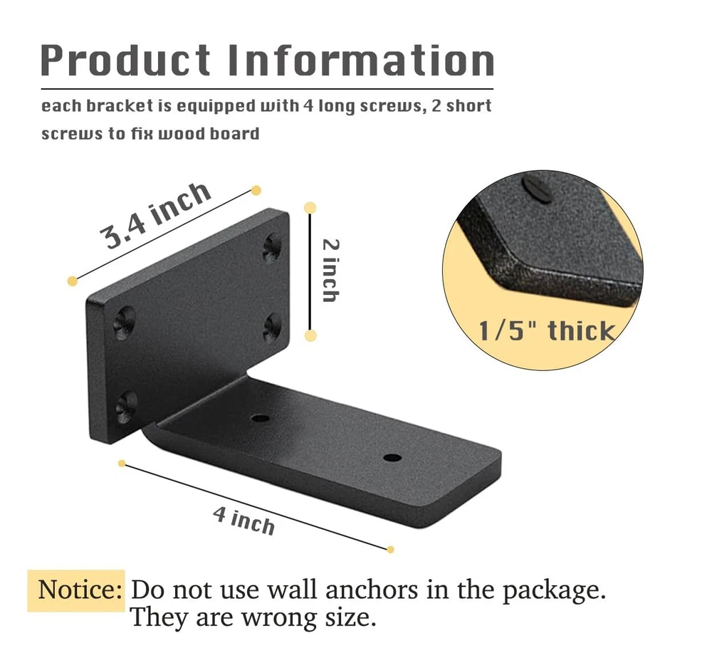 Key Features: Sturdy and Reliable: Crafted from premium-steel, these floating shelf brackets are built to last. Each pair of brackets can hold maximum 150lbs. They offer unparalleled stability and can easily handle various loads, ensuring your belongings are safely secured. Space-Saving Design: Our 8-Pack Bracket Set allows you to maximize space efficiency by utilizing vertical storage solutions. Transform any room, garage, or workspace into a well-organized area with ease. Multi-Purpose Use: These iron shelf brackets are incredibly versatile for a wide range of applications. From creating custom shelving units to supporting heavy items like shelves, boards, these brackets are up for the task. Easy Installation: Installing our heavy duty L bracket set is a breeze! Each pack comes with all the necessary hardware, making it simple to set up without the need for professional help. Save time while achieving professional-results. Sleek and Elegant: With a sleek black power coat finish, these brackets for shelves not only offer exceptional functionality but also add a touch of sophistication to any space. They blend seamlessly with various interior styles, complementing your decor effortlessly. Specifications: ✧Material: Iron ✧Color: Black ✧Quantity: 8 Brackets per pack ✧Dimension:6 inch, 8 inch, 10 inch,12inch Package Contents: ✧8 x Premium Shelf Brackets ✧Screws and Anchors for installation Transform your Space Today: Revolutionize the way you organize your living or working area with our floating. Whether you're tackling a home improvement project, optimizing your storage space, or creating a custom shelving system, our heavy duty shelf brackets provide the ideal foundation for your endeavors. Upgrade your space with these reliable, durable, and stylish brackets available exclusively on ! ✰High Value of 8-Pack Shelf Brackets: Our product includes a set of 8 high-quality shelf brackets, which is made from high quality iron steel to ensure long lasting performance, making it a complete solution for your shelving needs. With this pack, you'll have ample brackets to support multiple shelves or create a versatile shelving system in your home or office. ✰Heavy-Duty Weight Capacity: the thickeness of our floating shelf bracket is 1/5 inch. Designed to withstand heavy loads, each pair of our shelf brackets can support up to 150lbs, ensuring a secure and reliable shelving solution. You can confidently and display a wide range of items, from books and collectibles to kitchenware and electronics. ✰Perfect 12-Inch Length with sleek surface: Measuring 12 inches in length, our brackets offer optimal size for various shelving projects. The brackets feature a sleek black coat finish that not only adds a touch of elegance to your space but also provides enhanced durability. The finish acts as a protective layer, guarding against scratches, chips, and corrosion, ensuring long-lasting performance. ✰ ways of installation with Included Screws: our floating shelf bracket have different installation ways for you to choose. We've included all the necessary screws for a hassle-free installation experience. Simply align the brackets, secure them using the provided screws, and you'll have sturdy shelves ready to use in no time. Our user-friendly design ensures quick and efficient installation for DIY enthusiasts and professionals alike. ✰Wide application and no risk policy. With design, our shelf brackets can blend well with different decoration style and creat a rustic look for your bedroom, dining room, kitchen room and so on.if you have any questions about our brackets, you are free to return or apply for your order any time. We always stand behind our product.