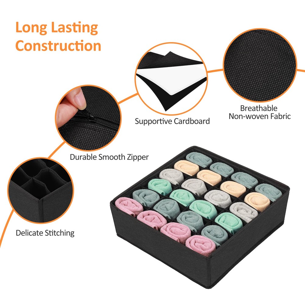 Time Save Organizers: With this underwear organizer, you will not be bothered through messy drawers or wardrobes for panty or bra while in a rush to get ready. Our Collapsible drawer organizer includes 4 bins: 6 cell( for scarves, ties,makeup brush), 8 cell(for underwear, briefs, ties), 5 custom large cell(ideal for bras up to 38D), 24 cell(perfect for socks),Great for store your items, you can even use them to store stationery. Premium Material: drawer organizers made of strong fabric and meticulous stitching (make it sturdy for repeated use/ long time use.) , keeping your items neat at all times and makes storage look stylish. Space-saving Design: These 4 drawer organizer box can be folded flat to save space when not use. Simply open the zipper and fold flat to store. Great dresser drawer organizer for tidy your closet and room, also a ideal gift for others. You will receive: Set of 4 sock and underwear drawer organizers, our hassle free warranty and 24/7 friendly customer service.