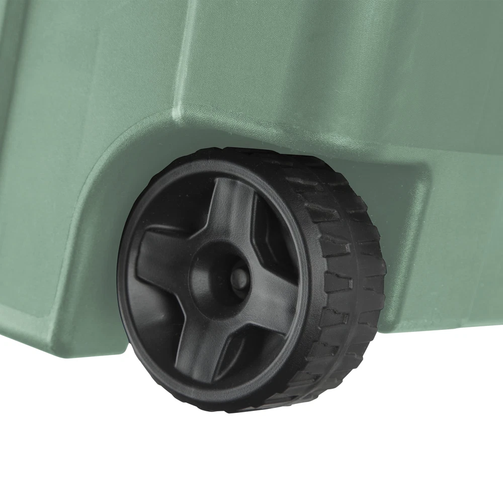 Bring order to garages, basements, and attics with the heavy-duty design and unique features of Sterilite’s Industrial Tote line. Be confident that stored items will stay protected in the durable 40 Gallon Wheeled Industrial Tote, the ideal portable solution for storing larger and heavier supplies. The grooved lid design and keyholes provide options for tie-downs to simplify transportation, and keep totes in place in the back of a pick-up truck. The ergonomic handle rotates up for easy pulling while the large wheels and metal axle allow for rolling over rough surfaces. The innovative drip-resistant lid provides maximum protection against items getting wet, while the tight-fit lid keeps items contained. The robust latches offer extra security that the lid will stay attached to the base, and the textured surface makes for a sure grip when carrying. Sterilite Adult Plastic 40 Gal. Wheeled Industrial Tote Green Sage Outside Dimensions: 36 3/4" x 21 3/8" x 18" Interior Dimensions at bottom: 30 1/2" x 16" x 17 1/8" Heavy-duty construction with robust non-slip grip latches Ergonomic handle rotates up for easy pulling and large wheels with metal axle allow for rolling over rough surfaces Deep recessed lids offer secure stacking capabilities helping to maximize available storage space Tight fit drip-resistant lid provides maximum protection against items getting wet BPA-free and phthalate-free
