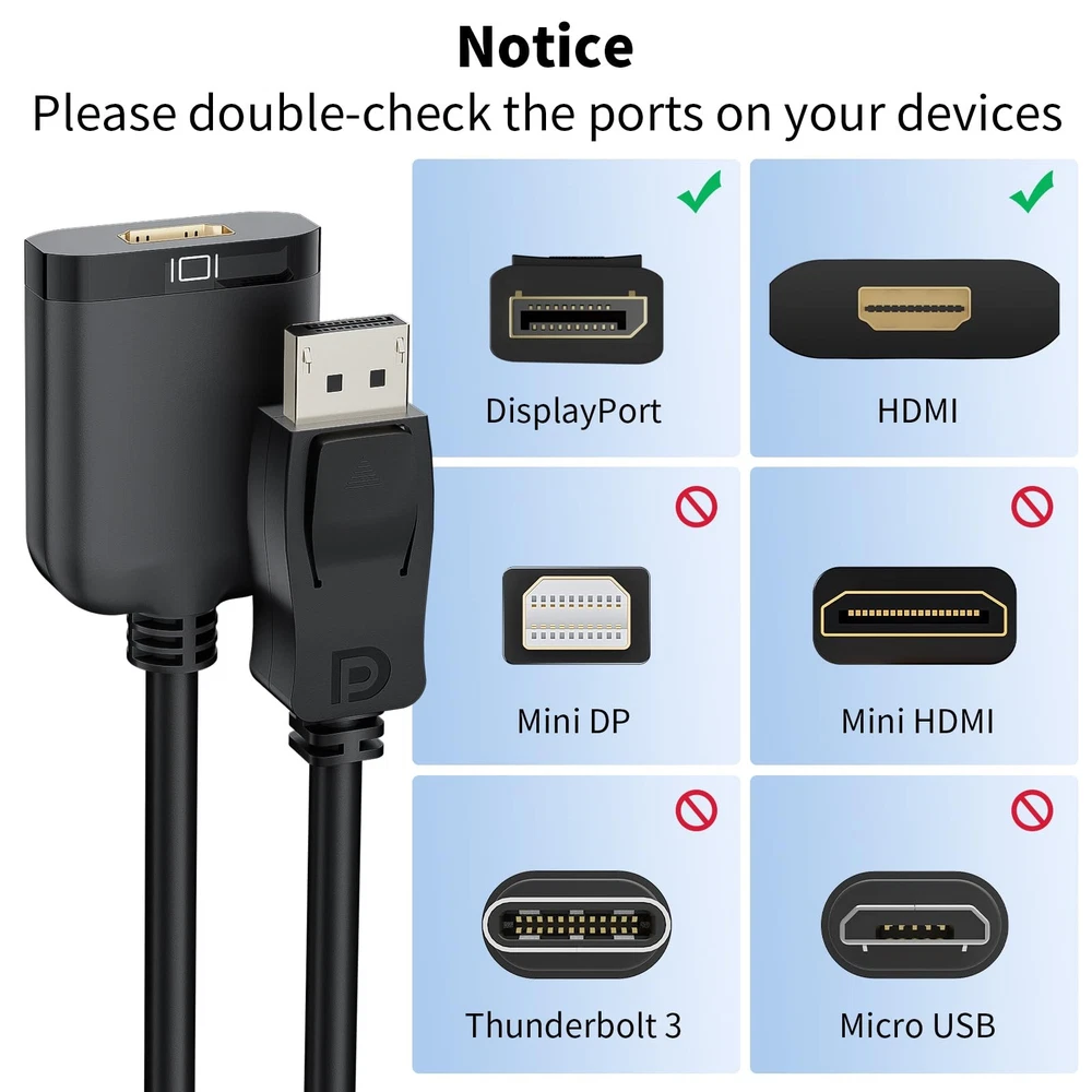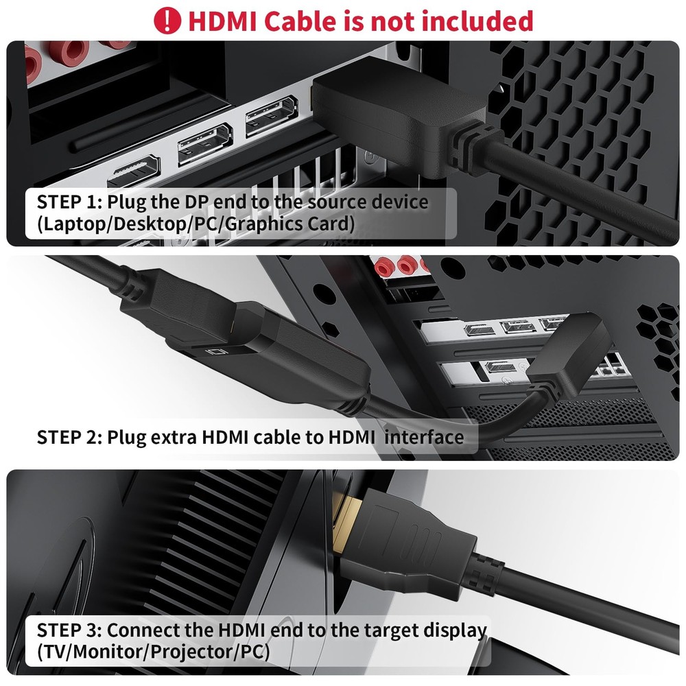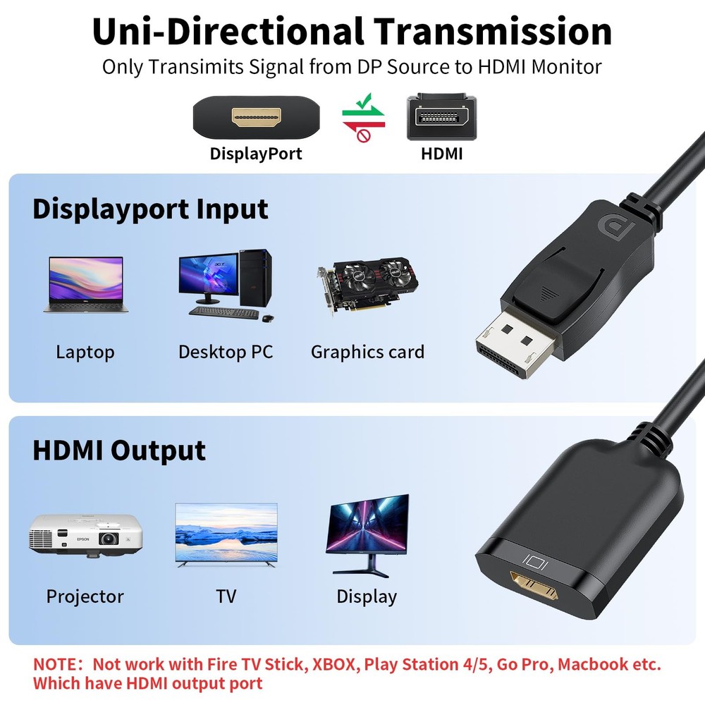 4K 60Hz DisplayPort 1.4 to HDMI 2.0A AdapterPlug and Play: Directly plug it in and enjoy 4K High-definition output immediately. No external drivers, dongles or additional power supply requiredSpecification:Input: Displayport MaleOutput: HDMI FemaleResolution: 4K@60Hz (3840 x 2160P)Standard: DP 1.4 / HDMI 2.0Transmission: Support Active TransmissionDO NOT Support Transmit from HDMI to Displayport Stunning 4K Resolution: The 4K@60Hz active Displayport 1.4 to HDMI 2.0 adapter supports resolution up to 3840X2160@60Hz, which bringing you an unprecedented visual experience (NOTE: This adapter only support signal from displayport to HDMI port) Latches Protection: The DisplayPort connector with latches that provides a more secure connection, avoiding accidental disconnection. If need to plug out, please press the release button and easy to pull out Ultra Durability: This Active DP to HDMI adapter features a plastic cover on HDMI interfaces for fraying and damage protection. The powerful conversion chip to provide up to 18Gbps and stable signal transmission Unversal Compatibility: This 4K DP to HDMI adapter that is fully compatible with various laptops, desktop PC, GPU and other devices with a DisplayPort port. Connect to TV, projector, monitor, VR headset, etc. It's the first choice for office conference, late-night gaming or home theater Warranty: displayport to hdmi cable comes with 3 Month worry-free warranty and lifetime technical support. Feel free to contact us by email if you encounter any problem while during the use