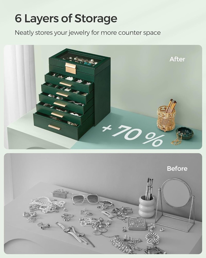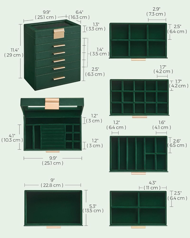 Product Description Jewelry Box with Glass Lid, 6-Layer Jewelry Organizer, 5 Drawers, for Sunglasses, Big Jewelry, Jewelry Storage, Modern Style, Forest Green and Gold Color UJBC171C01 [Storage, 6 Layers] Keep all your jewelry organized in this jewelry box—small pieces of jewelry go in the various slots of the top 5 layers, and sunglasses and watches go in the big bottom drawer [Clear Glass Lid] The see-through glass lid of this jewelry organizer allows you to see and find your favorite jewels at a glance while protecting them from dust, keeping your jewelry ready to wear and clean [Chic & Durable] Elegant green and gold colors, shiny metal handles, soft velvet lining, neat stitching, quality PU, and sturdy MDF—all these elements combined make this jewelry case stylish and durable enough for your ever-growing jewelry collection [Perfect Gift Idea] Gift this original design jewelry box to your loved ones for their birthday or anniversary to surprise them! Or, treat yourself to this fancy jewelry box—you deserve it! [Versatile Use] This modern jewelry holder looks nice whether displayed on the dresser of your bedroom or your cloakroom to organize your pins, necklaces, rings, bracelets, and other accessories About Us We are a reputable seller with many years of experience selling on eBay. Our goal is to provide high-quality products and excellent customer service. Shipping Items will be shipped within 1-3 business days when we received payment. (Orders are not processed on weekends & holidays) Tracking information will be sent once item is shipped. Delivery time depends on destination and other factors Item is shipped to ebay address. Leaving correct address can minimize delay. For international shipping and shipping to Guam, Hawaii and Alaska, Please contact us before placing the order. International buyers please note: Import duties, taxes and charges are not included in the item price or shipping charges. These charges are buyer’s responsibility. We will try our best to reduce the risk of the custom duties. Local pick-up is unavailable at the moment. Contact Us We reply any email messages within 1 business / working days(off-duty at weekend). If you do not get a response from us, then please check your junk or spam mailbox. Our Business hours: Mon-Fri 9:00-18:00, UTC/GMT +8 hours. Please contact us either by clicking "contact seller" in the "purchase history" section or simply click "ask a question" at the bottom of this page. If you are unsatisfied with our item or service, please contact us before leaving any feedback. We are committed to resolve all issues in a friendly and satisfactory manner.