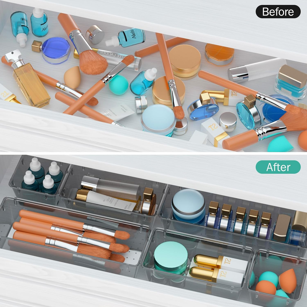 Premium Material: The material of the organizer is transparent and glossy so that it is safe to use 3 Combinations of Different Sizes: Our set drawer organizer includes 6pcs storage bins in 3 different sizes; include:9 x 3 x 1.8 inches (2 pcs), 6 x 3 x 1.8 inches (2 pcs), 3 x 3 x 1.8 inches (2 pcs) Stackable Storage: These clear storage bins can be stacked to keep them organized by arranging them for use Non-Slip Design: The bottom of the storage organizers has a non-slip tread to prevent the tray from moving around when the drawer is opened and closed Multiple Storage Options: Suitable for organizing makeup, toothpaste, jewelry, stationery, craft supplies, nail polish, bathroom supplies, kitchen, office and more Product Description Premium Material Stackable Design Non-Slip Inside Design Non-Slip Outside Design 1 Makeup Organizer 2 Bathroom Organizer 3 Office Organizer 4 Ornaments Organizer 5 Kitchen Organizer