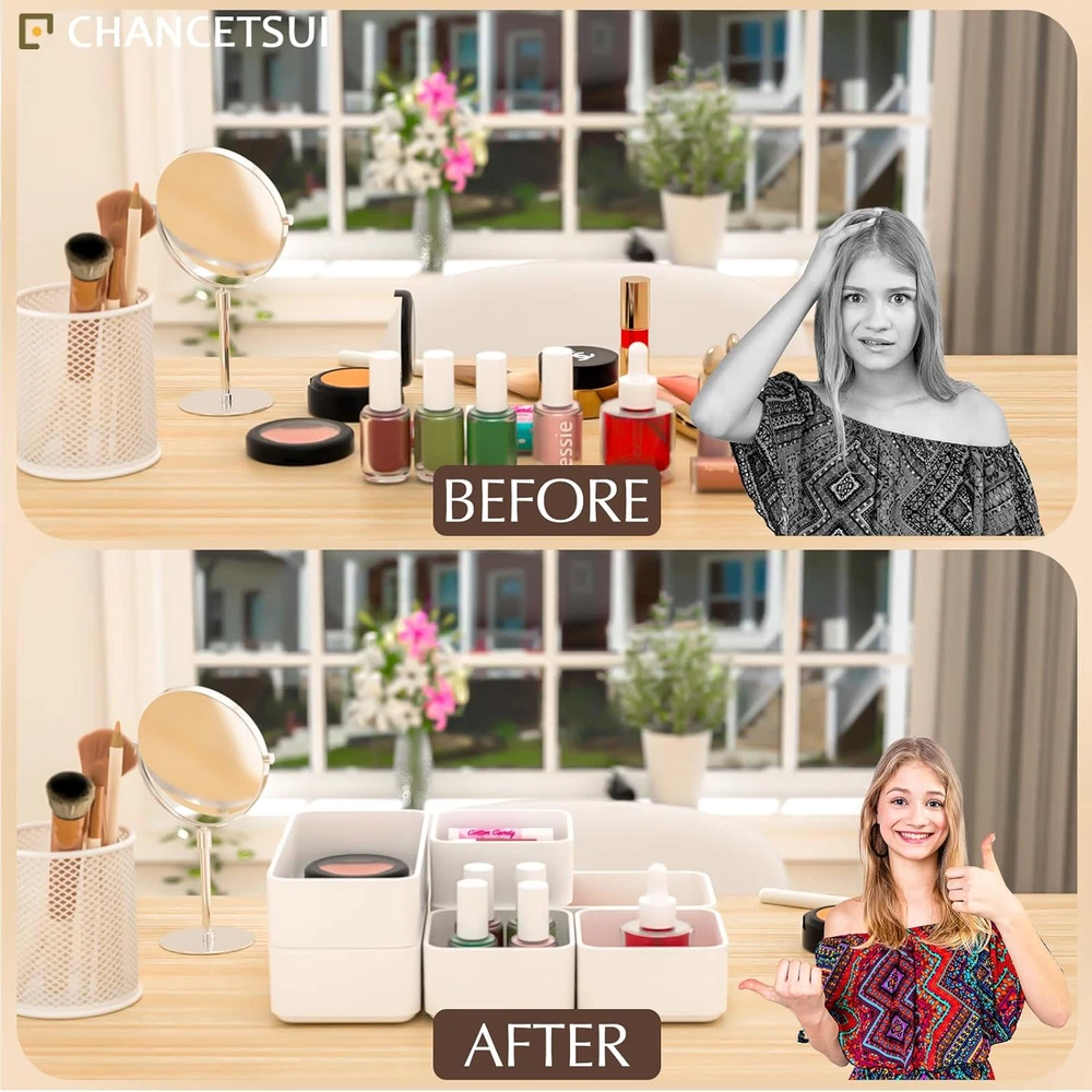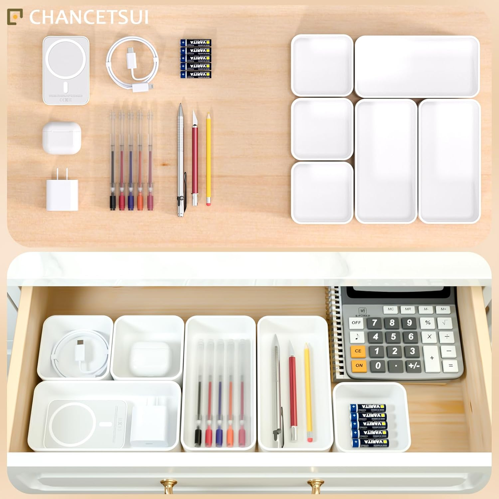 【6 Pcs Set 】 This multifunctional organising trays comes in a 6 pcs set. Package includes : 3.35 x 3.35 x 1.77'' (3 pcs), 3.35 x 6.6 x 1.77'' (3 pcs). You can flexibly use our storage organizer for house organization and storage according to your needs. 【Customize and Stackable】 Individual Plastic Storage Bins can be used to separate your messy drawer and fit all kinds of drawers, such as vanity, bathroom, kitchen, and office drawers. You can customize the layout of the drawer organizers to suit any specific needs. 【Sturdy and Durable】 The desk drawer organizer trays set are made of durable and environmental PET plastic, ensuring a long life of use. Drawer organizer bins are break-resistant and could accommodate different items keeping the organiser nice and steadily stacked. 【Stackable and Space Saving】 These storage bins fit any part of your home. Suitable for use in different drawers to keep your desktop neat and tidy. Offer a generous capacity for storing toiletries, hair accessories, cosmetics, medicine, toothpaste, office supplies, craft supplies, nail polish, jewelry, etc. 【Easy to Clean】These desk drawer storage bins are easy to be wiped clean with a damp cloth. It is very convenient to keep your desktop tidy and easy to find items in the drawer to save time. Making everything look beautiful and better organized. Product Description