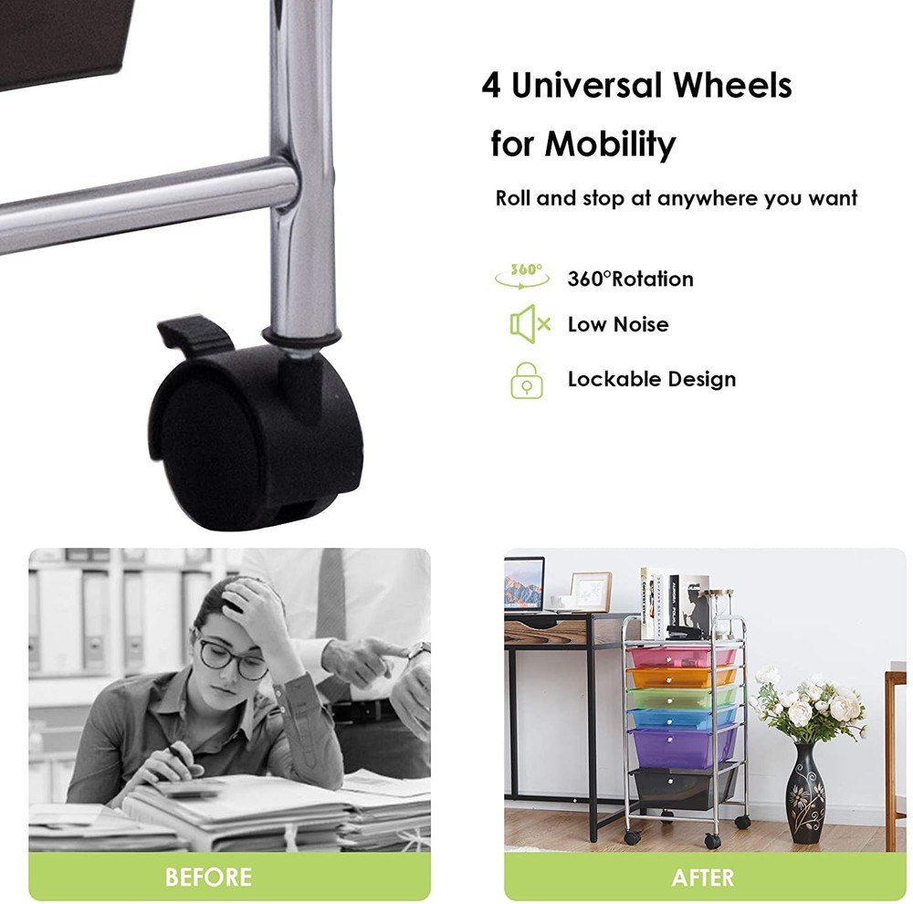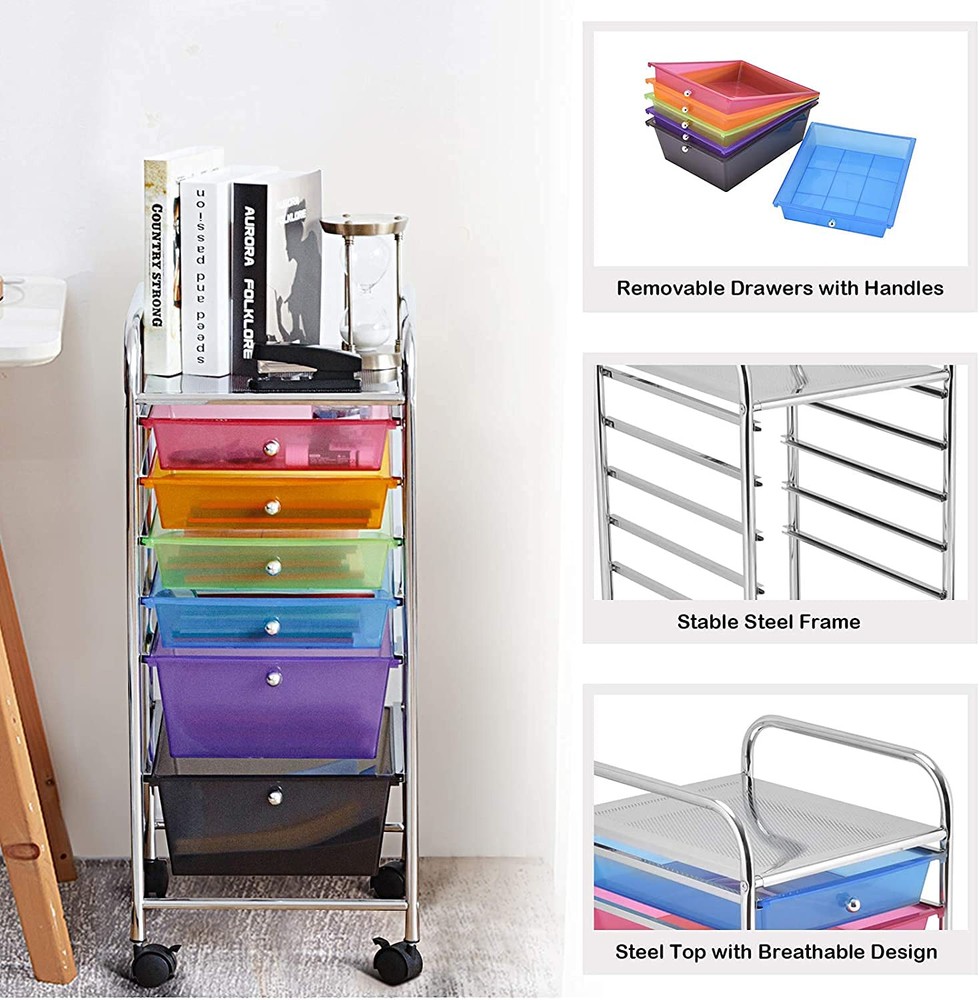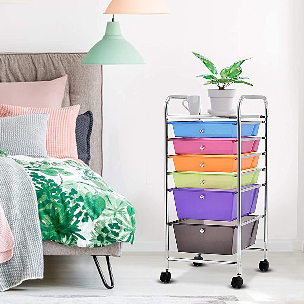 đăSmart 6-Drawer Storage OrganizerăThis storage cart with drawers has 6 drawers, of which are large. It provides plenty of space for keeping your home office supplies tidy and close, organizing makeup and cosmetics, storing arts and crafts supplies, and arranging tools for use in the garage. đăMobile Storage Solutionă Our storage trolley with drawers equipped with 4 castors that you can easily move where you want. Since it is equipped with foot brakes, this rolling cart ensures its stability if you want it stay at some certain place. đăSturdy Construction with Steel FrameăOur craft storage organizer cart with drawers features a heavy-duty iron frame, which gives it a superior stable construction to withstand a high weight capacity. Reinforced electroplated finish has a higher resistance of corrosion and rust without deformation for longer use. đăUser-friendly DesignsăRemovable drawers ensure a better user experience. The drawer slide rail is well fixed on the metal channel to make the movement more stable. With convenient handles on each drawer, you can easily pick and place things when you need them. đăVersatile CartăThis is an ideal storage solution to make your workplace or home more organized and tidy, because this storage trolley can perfectly place its practical role in various occasions, such as office, home, living room, entrance passage, bathroom, Schools, garages, etc.