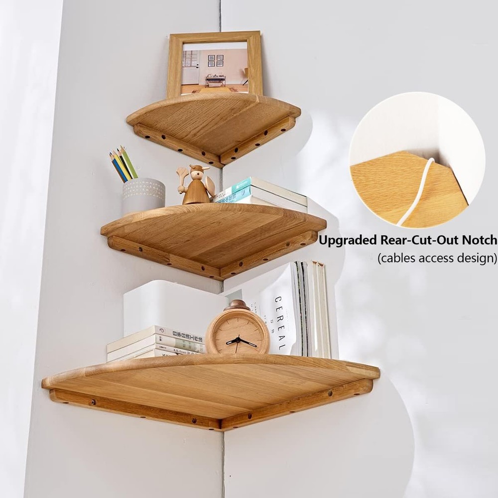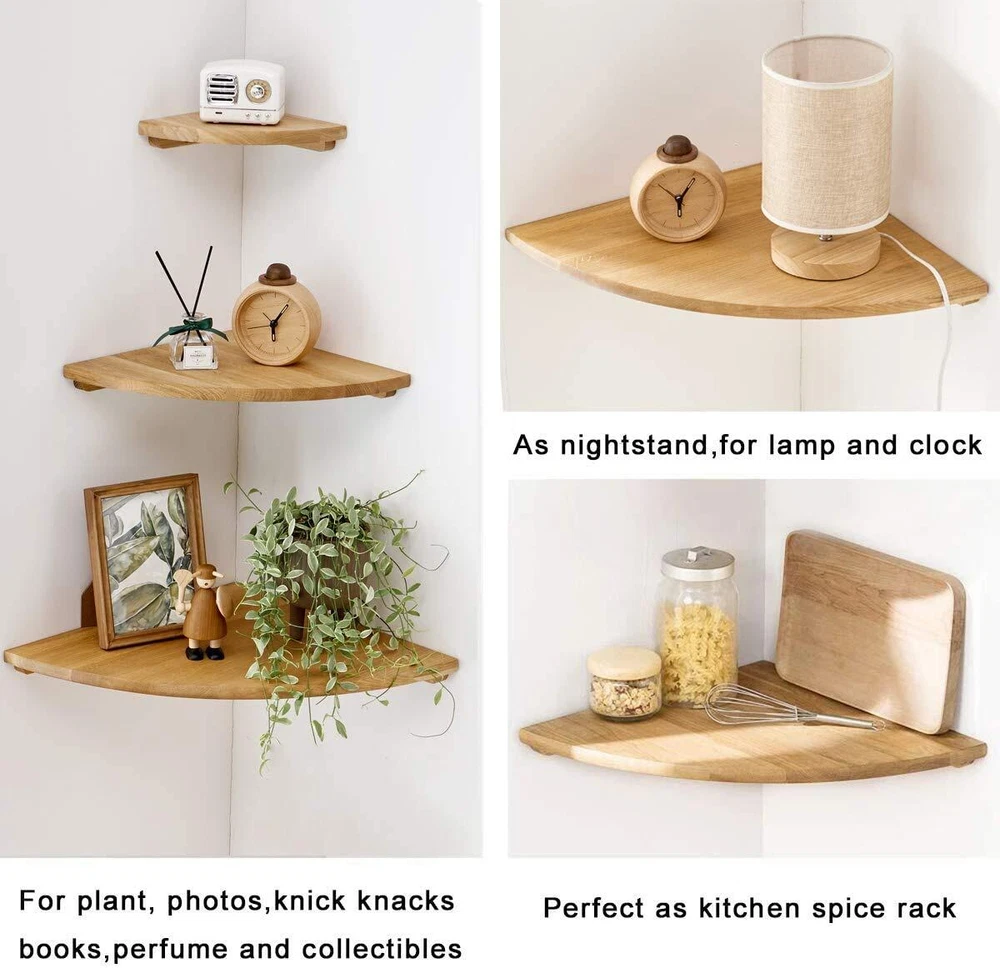 1. These white oak corner shelves are a game-changer for small spaces! The solid wood feels sturdy and the minimalist design blends seamlessly into any room. I love using them in my bathroom for extra storage—they hold toiletries and decor without cluttering the counter. The eco-friendly finish gives a nice natural look, and the floating design maximizes unused corners. Perfect for plants, books, or displaying trinkets while keeping things organized. Easy to install and surprisingly spacious for their size. Definitely worth it for the quality and versatility!