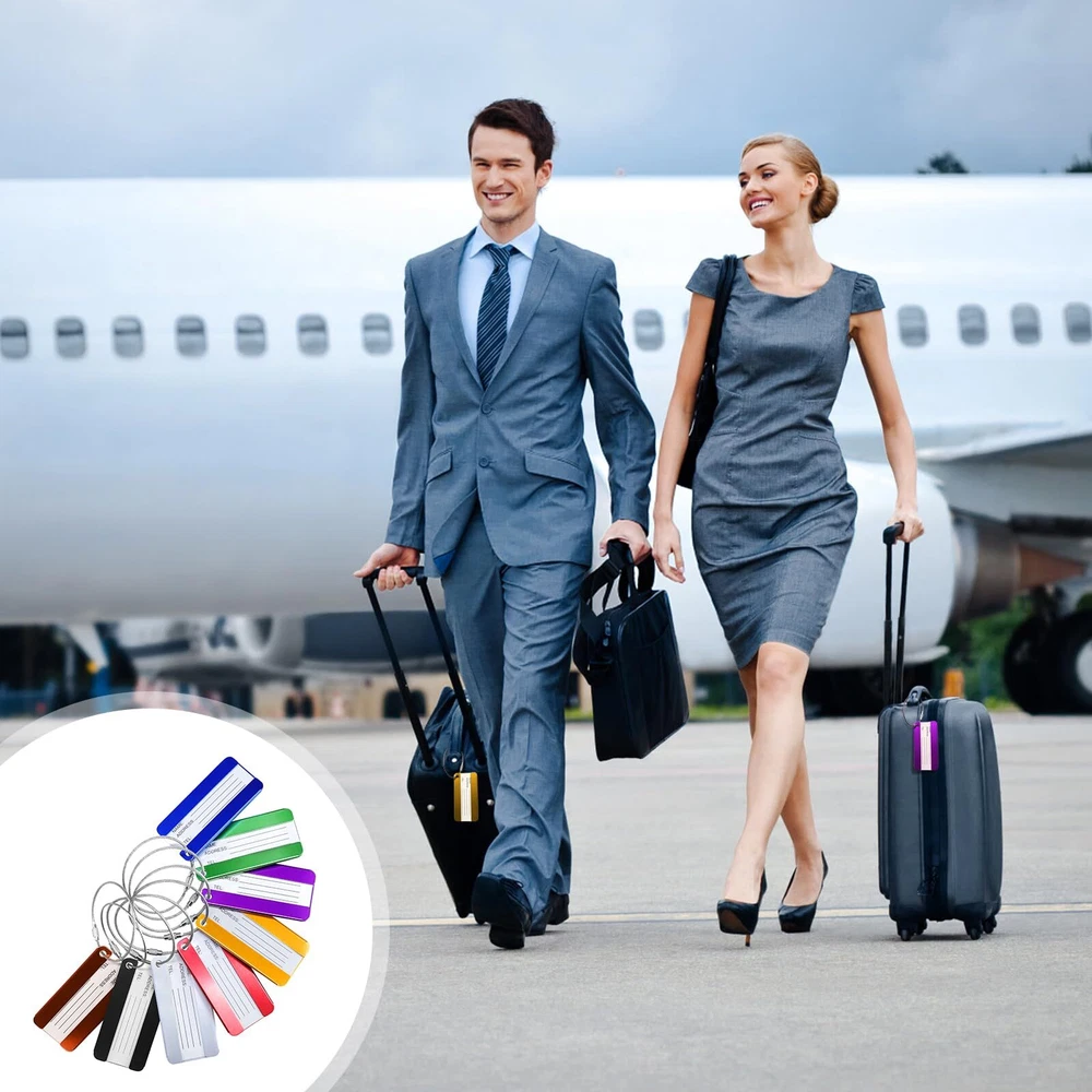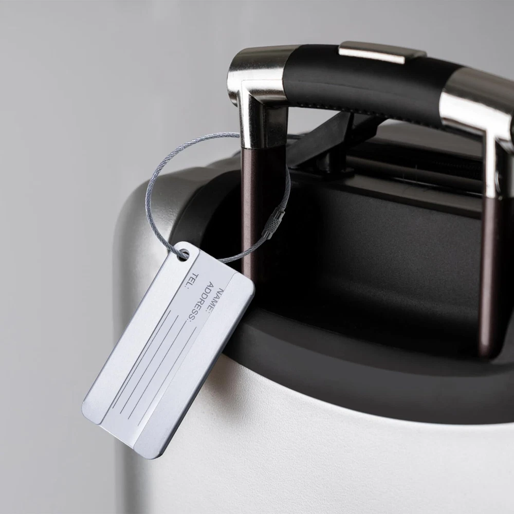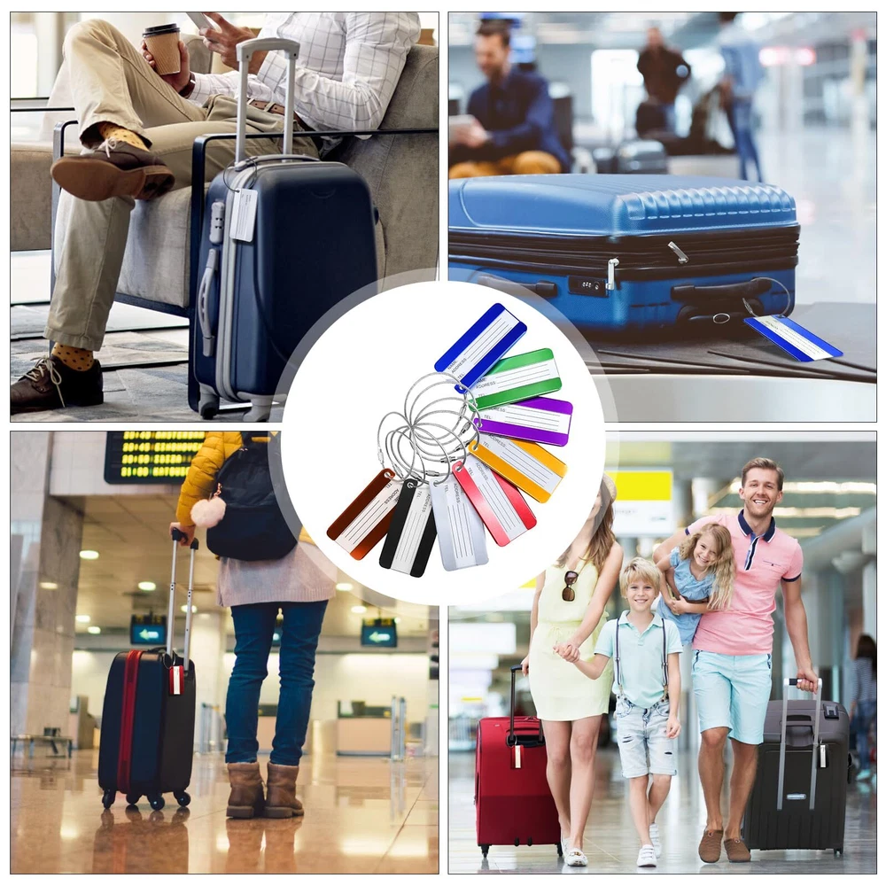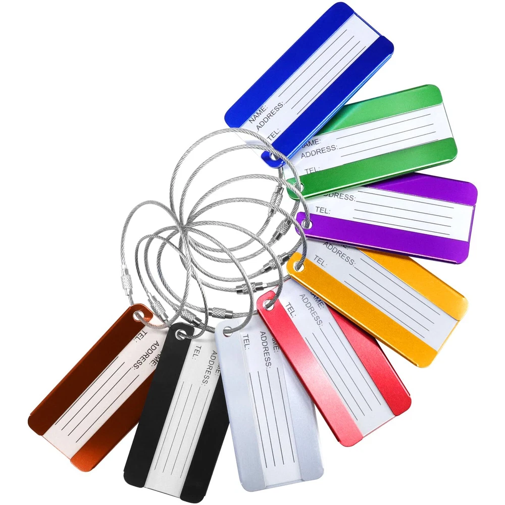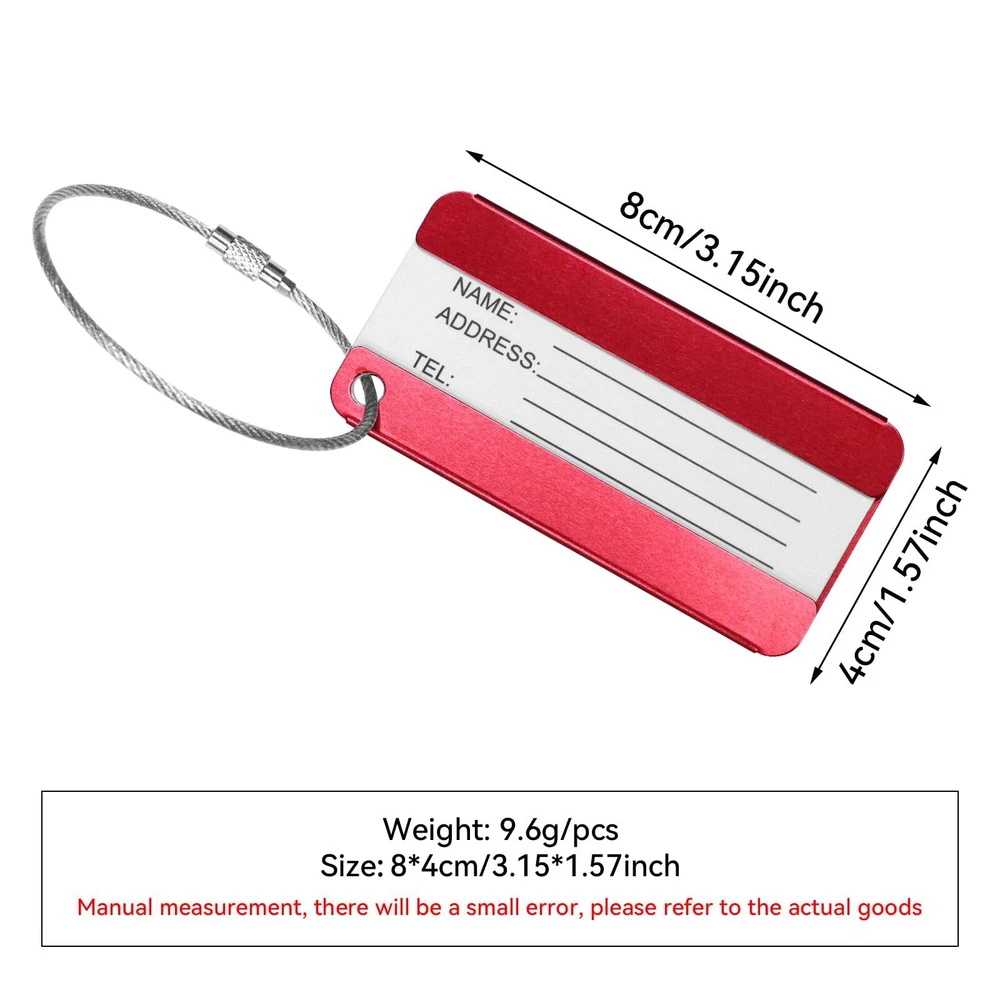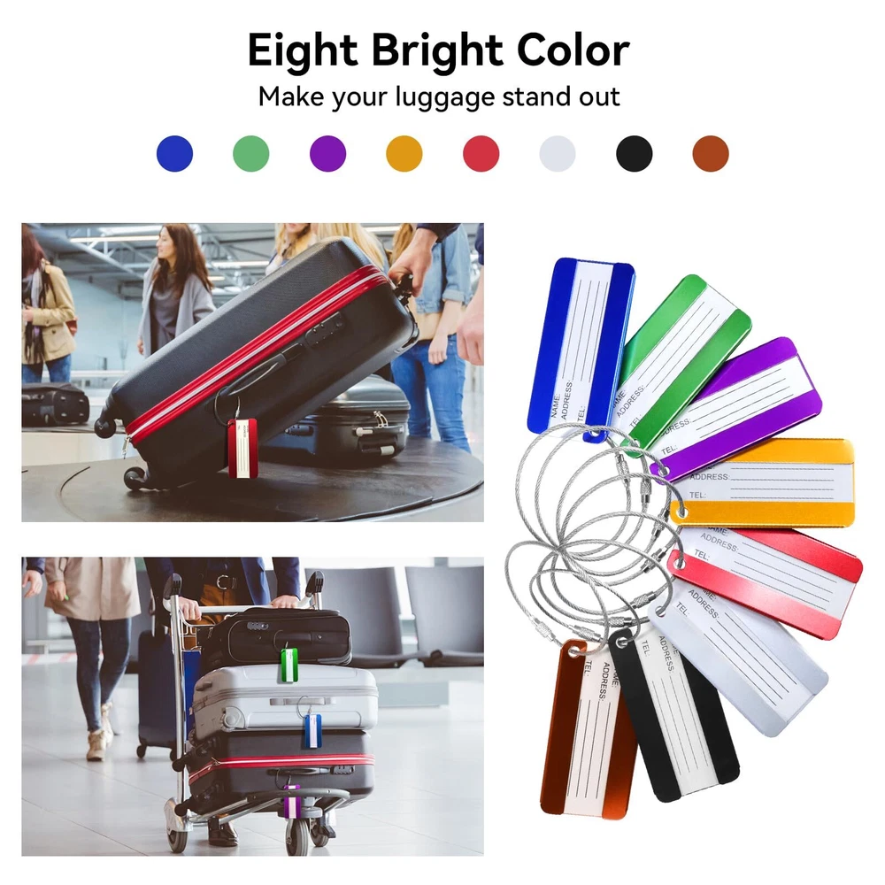 Features: - The travel luggage baggage tag with replaceable information card for writing NAME and ADDRESS. - Luggage tags are PVC waterproof membrane to protect the tag identification name, wearing a detachable rope for easy connection to your luggage - Bright colors help you to identify your luggage from others easily Specification: Material:Aluminum Alloy + stainless steel key ring Tag Dimension:80mm*40mm/3.1" x 1.57" Color: 8 different colors (purple,coffee,blue,green,sliver,gold,black,red) Weight: Each luggage tag is approx 9.6g,8 luggage tags approx 77g Package Includes: 8x luggage tags Includes 8 different colors luggage tags (purple,coffee,blue,green,sliver,gold,black,red) Material: Aluminum Alloy + stainless steel key ring.Tag Dimension:80mm*40mm/3.1" x 1.57" Luggage tags help you find your own luggage at the first sight from similar luggages.don't worry about take the luggage by mistake.Personal information hides behind the tag and protect your privacy. Each tag include: aluminum alloy case + stainless steel key ring + blank paper + PVC cover front of paper.You can write your NAME and ADDRESS on the name card, for easy to identify your luggage from others. Can be used for luggage tags ,office ID tags, briefcases,pet tags,keys, baby strollers, and anything you want to use.