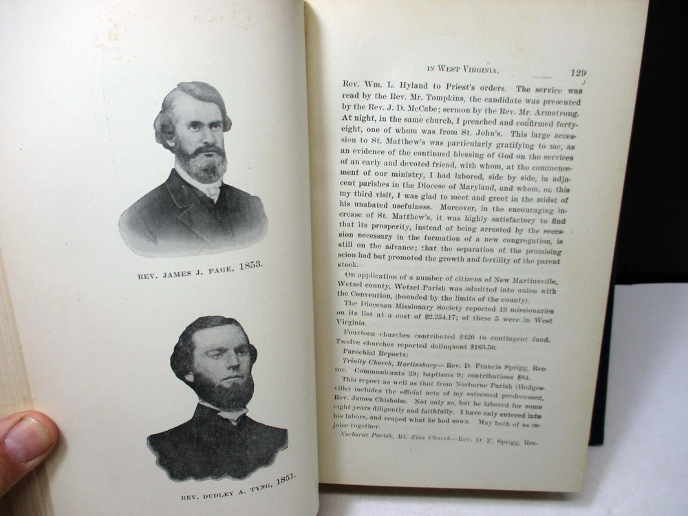 A History And Record Of The Protestant Episcopal Church West Virginia Diocese 1902 A History And Record Of The Protestant Episcopal Church In The Diocese Of West Virginia By Geo. W. Peterkin Published 1902 Entered according to an act of congress in the year 1901 854 Pages Condition: The cover has light wear on the corners and light fading on the bottom edge. The hinges have partial cracks in the paper covering. Shipping Notes: We do offer reduced shipping costs when buying multiple items.