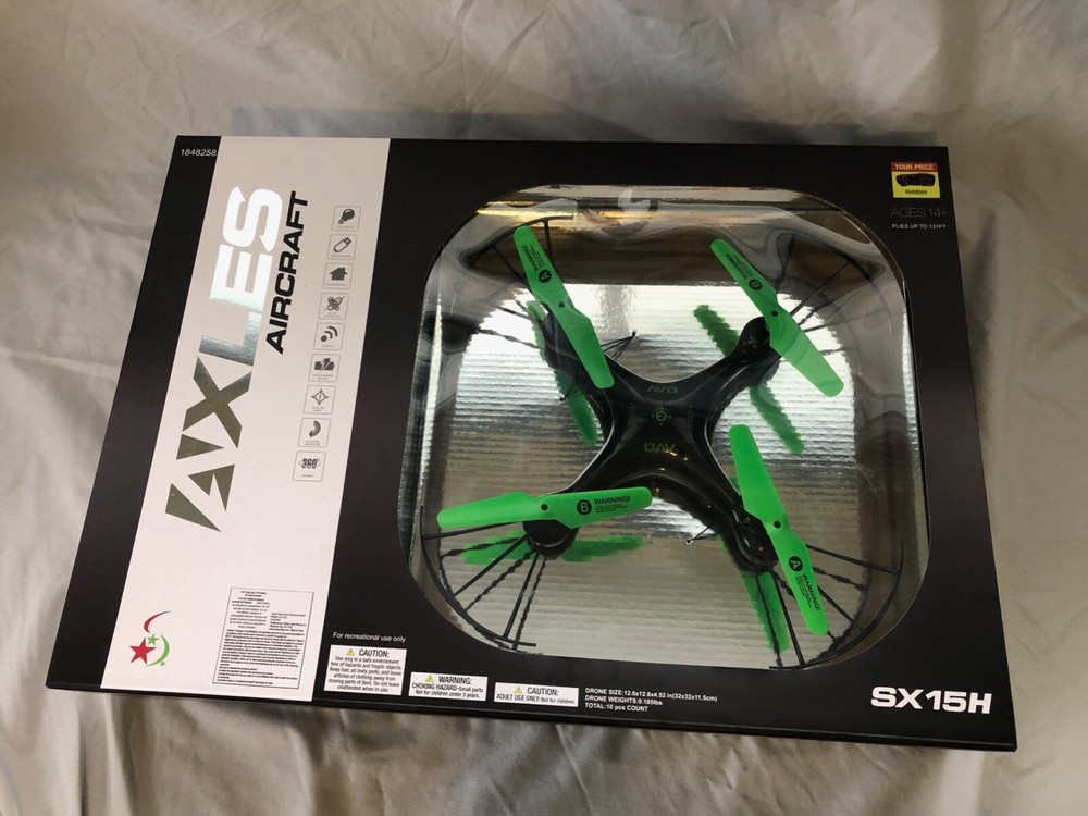 Brand new remote control drone in original box. Black body with green propellers. Includes drone, remote control, spare propellers, charging cable, screwdriver, and 2 stands. Drone Dimensions: 12.6 x 12.6 x 4.5 in