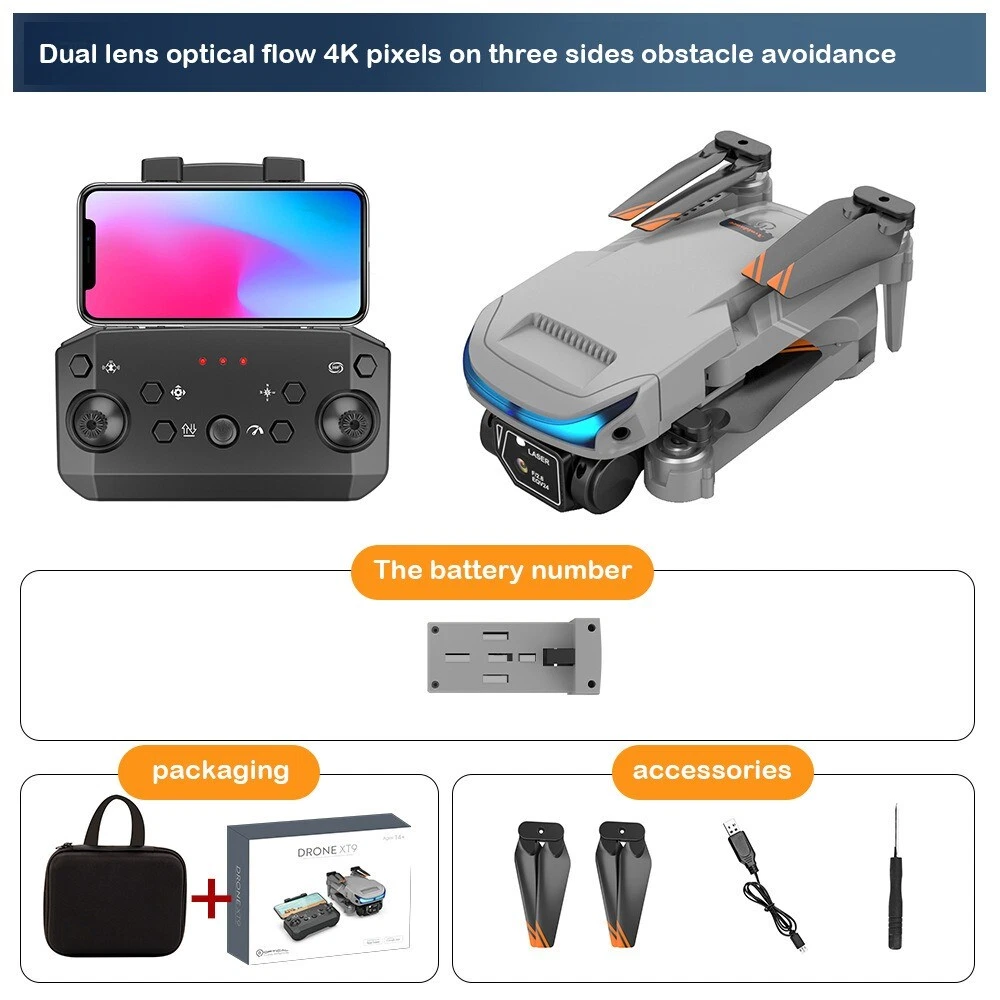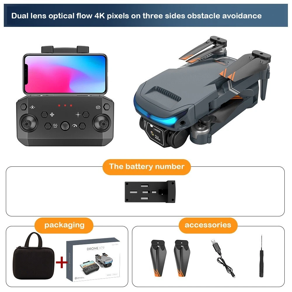Aerial UAV XT9 high-definition dual lens pixel multi-rotor UAV optical flow fixed high positioning remote control drone LSRC XT9 WiFi FPV with 4KHD Dual Camera Altitude Hold Mode Foldable RC Drone Quadcopter RTF(Optical flow location) Description: Brand Name: LSRC Item NO.: LS-XT9 Material: ABS Plastic & Electronic Components Color: Black Gyro: 6-axis Frequency: 2.4G Channel: 4CH Motor: 716 Brushed Coreless Motor Battery: 3.7V 1800MAH Lipo Battery (Included) Transmitter Power: 3 x AAA Battery (Not Included) Transmitter Mode: Mode 2 (Left Hand Throttle) Flying Time: about 15mins Low Flying Speed: 2m/s Medium Flying Speed: 4m/s High Flying Speed: 7m/s Charging Time: 120 minutes RC Distance: 80-100m FPV Distance: 30m FPV: WiFi Camera:4KDual Camera Resolution: 4K Camera Angle: Electric regulation Adjustable 180°- 90° Quadcopter Size: 18*12.5*4.5CM (Unfolded) 13*7*4CM (Folded) Package Weight: 460g Package Size(BOX): 22.5*17.5*7 CM Features: - Foldable arms, small size only 13cm, easy to carry. - With altitude hold mode function, flight is stable.(Optical flow location) - In headless mode, there is no need to adjust the position of the aircraft before flying. - One Key Take-off/Landing/Return. Easily find your way home using the one-button back function. - Built-in4K pixel HD camera. Surprisingly, it can capture stunning pictures and videos from the sky. - Dual camera switch, get rid of fixed angle of view. - With WiFi function, it can be connected to applications, APK system, and take photos, videos, and real-time transmission through mobile phone camera images. - Draw a flight path on the screen, the drone will fly autonomously along the specified path. - VR 3D experience. Through mobile app with VR glasses, you can feel the emptiness from the perspective. - MV production, music addition. - 3.7V 1800mAh modular battery, easy to install and take, battery life up to 15 minutes. - 2.4GHz anti-interference technology. - 4 channels for ascent, descent, forward, backward, left flight, right flight and 360°roll. - Six-axis gyroscope, smoother flight and more convenient control. - LED lights make flying more spectacular, especially in the dark. Functions: Up / Down, Forward / Back, Left / Right Turn, Side Flight, LED Light, Headless Mode, One-button Auto Return, Altitude Hold Mode, WiFi FPV Package Included: 1 x XT9 Drone 1 x Remote Control 1 x 3.7V 1800MAH Battery 1 x USB Charging Cable 2 x Spare Blade 4 x Protection Cover 1 x Screwdriver 1 x Manual 1 x Storage Bag