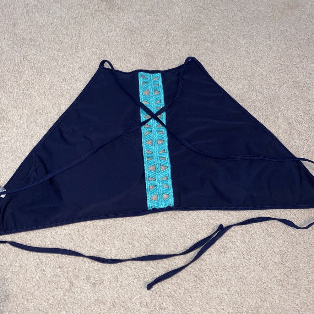 Add a touch of elegance to your swimwear collection with this Aerie high neck bathing suit top. The navy blue top features a lace cross tie detail and is made of Nylon material. It comes in size XL and is perfect for women who want to make a statement at the beach. The top has removable pads, padded cups, and adjustable spaghetti straps for comfort and support. The top also features a drawstring closure and is solid patterned, making it a perfect choice for those who love bohemian and colorful themes. Whether you're lounging by the pool or taking a dip in the ocean, this top is sure to make you feel confident and stylish. Pair it with your favorite swim bottoms and accessories to complete your beach look. Good condition