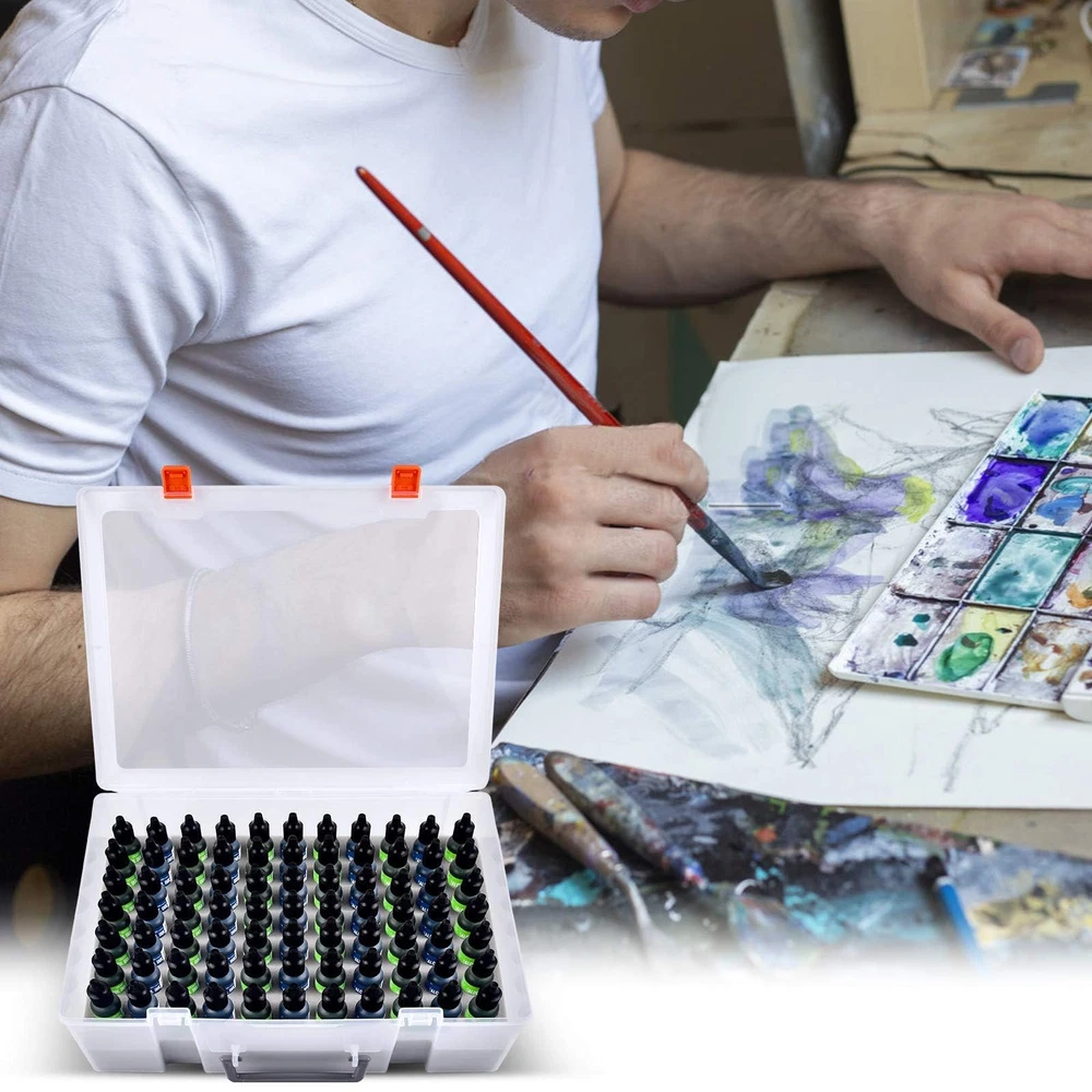 Large alcohol Ink and paints case -Holds 77 Bottles: Fits bottles up to 1 inch wide and 3 inch tall. Keep your alcohol ink collection organized and easily accessible with our large capacity storage case - holds up to 77 bottles, including many brands fits the size (No Any Bottles Included) Strong and heavy-duty plastic material: White alcohol ink case made of good material plastic, more resistant and crash worthiness than acrylic. Clear enough to find what colors you need. Easy for resin petri dish making, for epoxy resin painting, for tumbler cup making Great Construction Art Storage Organizer: Unique insert Foam with nice slot cut, fits for army painter bottles, for vallejo game colors bottles, for reaper paint bottles, for GSW paint dropper bottles, fits the alcohol ink snugly, also can tightly fix all alcohol ink in the groove, avoid the friction between each other, will not spill out due to shaking, keeping your home clean and tidy Alcohol Ink Bottle Storage Container: Stand-up foam design allows you easy to put your paint dropper bottles in and out of the case, make the bottles more stable, keeps the colors from getting spilled and fall over. Strong double latch for easy to open and close Alcohol Ink Carrying Case for travel: lightweight and portable size:14*10.5*3.8inches. Our alcohol ink carrying case is perfect for taking your miniatures and getting together with friends to paint. The strong top handle makes it easy to transport your alcohol ink set wherever you go