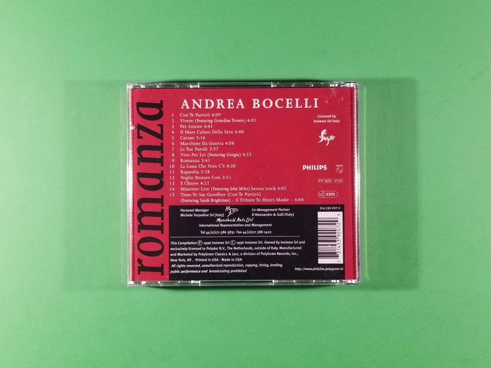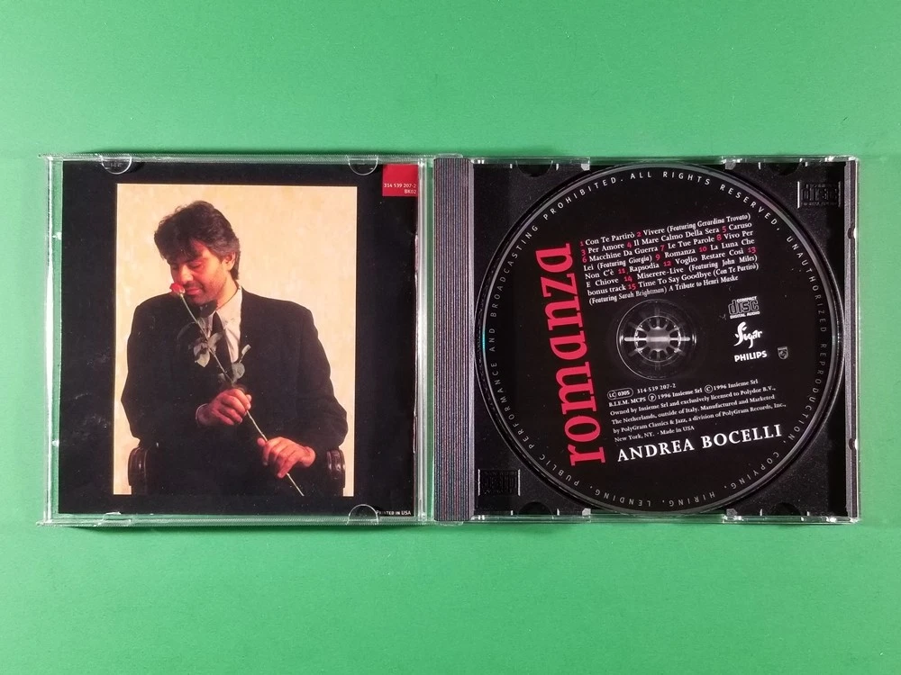 This is Andrea Bocelli's 1996 album, Romanza , on CD. PLEASE READ BEFORE BUYING: Most CDs appear to be in good, playable condition. Keep in mind, you are buying pre-owned CDs. Please buy with the understanding that you are buying these CDs "as is" - we make no guarantees, since we have not played or inspected every single CD. The above picture(s) are of the item(s) you will be receiving. Payment confirmation due within 72 hours of listing's end. If payment confirmation is not received within 72 hours, the item will then be re-listed. Package will be shipped within 3 business days of payment. For cost of shipping, please refer to the 'Shipping and Payments' Tab. If you are looking to combine ship, please add the items in your cart and click 'Request Total from Buyer' to send us an invoice; If you have any questions, feel free to contact us. We ship out on Mondays, Wednesdays, and Fridays. Our deadline for items to be shipped out is 9:00 a.m. pacific time on each of our days we ship out. We will ship all items that are purchased and paid for by 9:00 a.m. on the day of shipping. If purchased after 9:00 a.m. pacific time, item will be shipped on next shipping day. (M-002)