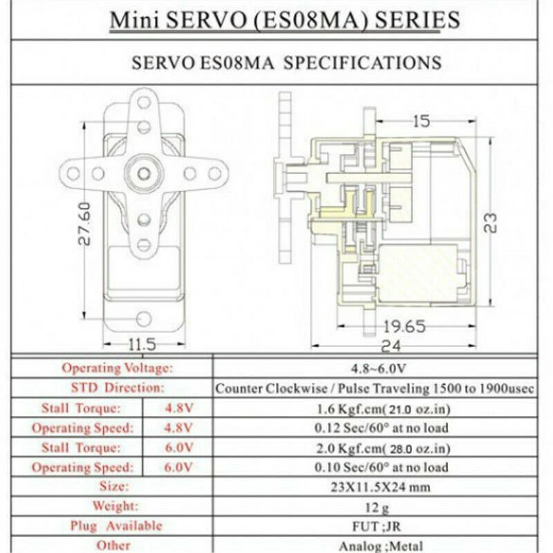 NEW-00023 SCX-24 DEADBOLT Upgrade Axial Metal Gear Micro Servo for RC Car Crawler Robot b PRODUCT DESCRIPTION Specifications: Dimensions: about 32 x 11.5 x 24 mm (1.25 x .45 x .94in) Working voltage: 4.8V~6.0V Working current: 200mA/60o Speed: 0.12sec/60o at 4.8V; 0.10sec/60o at 6V Torque: 1.5/1.8 kg.cm (4.8V/6v) Gear material: metal Servo cable length: 25 cm Plug standard: Futaba/JR universal Suitable for fixed wing, 450 helicopters, robots, super smooth! Package includes: 1 x ES08MA servo 1 x Steering gear rocker arm group Notes: Please allow 1-3 cm difference due to manual measurement. Due to light and screen difference, the item's color may be slightly different from the pictures. Shipping Contact Us Our products have been sent to the US warehouse. All items will be shipped via WINIT CORPORATION. In 2-5 working days, you will receive your items. Thank you and have a nice day. If you have any question about us or items, please contact us, we will reply it as soon as possible. Shipping Our products have been sent to the US warehouse. All items will be shipped via WINIT CORPORATION. In 2-5 working days, you will receive your items. Thank you and have a nice day. Contact Us If you have any question about us or items, please contact us, we will reply it as soon as possible. PaymentShippingReturn policyAbout usContact us Copyright © - Tongtool All rights reserved | Design:Tongtool