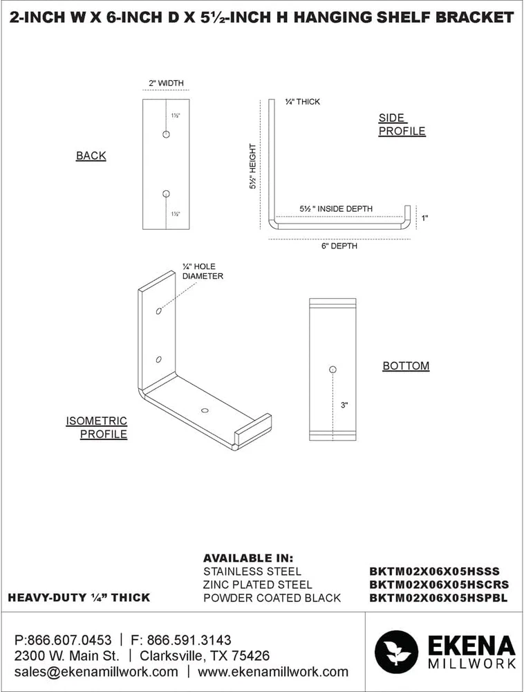 Store New Arrivals Add to Favorite View Feedback Contact BKTM02X06X05HSCRS Steel Bracket Hanging Shelf, 2"W X 6"D X 5 1/2"H, Unfinished Description Item model number BKTM02X06X05HSCRS Item Package Quantity 1 Style 1/Pack Finish Hand-painted,Paint,Steel Unit Count 1.0 Count Mounting Type Wall Mount Part Number BKTM02X06X05HSCRS Color Unfinished Included Components Steel Hanging Shelf Bracket Product Dimensions 6 x 2 x 5.5 inches Material Steel Country of Origin USA Item dimensions L x W x H 6 x 2 x 5.5 inches Item Weight 1.47 Pounds Batteries Required? No Usage Professional Global Trade Identification Number 00192770458324 Size 2"W x 6"D x 5 1/2"H Finish Type Hand-painted,Paint,Steel Perfect for countertop, cabinetry and shelf applications Pre-drilled mounting holes for easy installation State-of-the-art designs in a variety of sizes High-quality, 1/4" heavy-duty metal offers durable, sturdy support Unique and modern designs for all decor styles Available in a variety of specialty hand-painted finishes Installation is a breeze with pre-drilled holes. Steel meets the demand for urban, industrial, or refined farmhouse style and decor. Steel provides lasting, sturdy support with stunning appeal and holds up well in wet areas. Instantly upgrade a room with impressive open shelving or modernized under-cabinet support. Create a striking contrast against dark wood or paint. Design with your personal style in mind and bring joy to your space with the largest collection of steel brackets available in the marketplace today. ABOUT US We offer the best prices around on high quality products. Our E-store includes media such as books, movies, music and games while offering electronics, toys, sporting apparel, clothing, tools, general home, garden items and more. SHIPPING We are always working hard to ensure your package arrives as soon as possible. Please understand that some factors like weather, high postal traffic, and the performance of shipping companies are outside of our control. We offer free shipping to the lower 48 states and ship within 2 business days of payment, usually sooner. We do not accept P.O. Boxes. Please provide a physical address. For shipping outside of the continental USA, we only use eBay's Global Shipping Program.The item is shipped to KY and then sent to the rest of the world. International customers are responsible for all duties and taxes. Continue to check out in order to calculate costs for shipping the item to your country. Messages regarding eBay's Global Shipping Program MUST be directed at eBay EXCLUSIVELY. RETURNS We offer a 30-Day Return Policy on items which you are not completely satisfied with. You have the option for a full-refund or an exchange of the item. No returns are available on items shipped outside of the USA. PAYMENT We accept PayPal. CONTACT US This page content is yet to come Please ad us to your favorite seller and visit again later Thank You CUSTOMER SATISFACTION We try our very best to make sure every customer is completely satisfied. If there's a problem, message us! We're happy to help. WE ACCEPT Copyright © 2021 AutoDS. | All Rights Reserved
