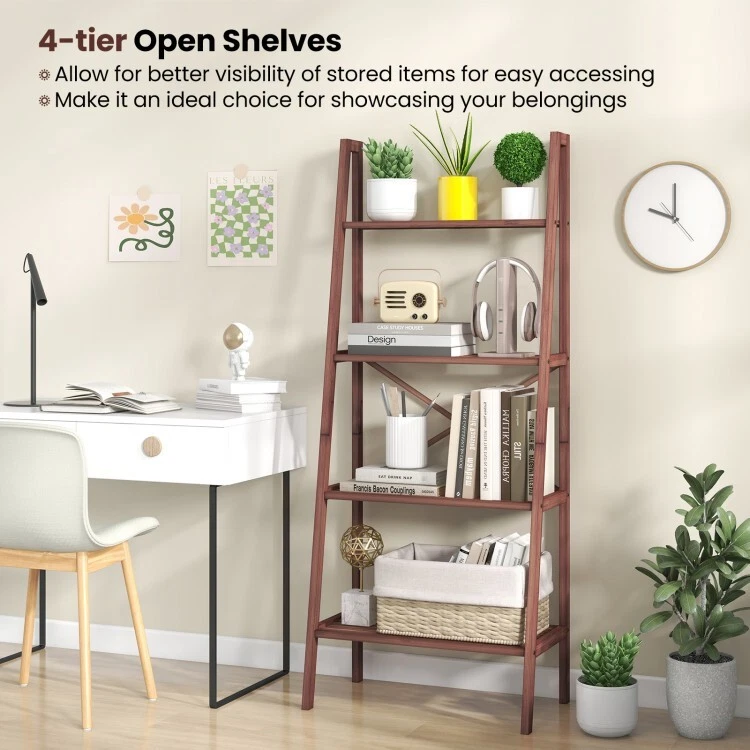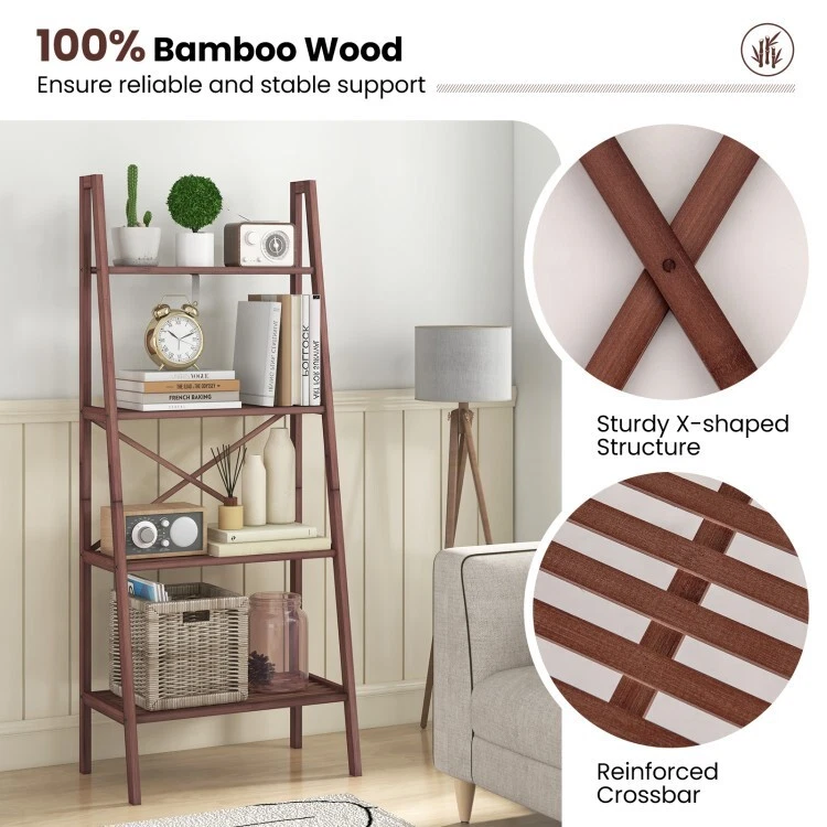Bamboo Ladder Bookshelf 4-Tier Living Room Storage Organizer Display Plant Shelf ● 100% Natural Bamboo: The whole frame of this 4 tier bookshelf is made of selected bamboo material with varnish, which is burr-free for smooth touch. Therefore, you can clean it with ease. Likewise, the natural bamboo adds a rustic addition to your space. ● Spacious Storage Space: Featuring 4 shelves of different widths, this 4-tier bamboo ladder bookshelf (14" height between shelves) is carefully designed to accommodate different belongings, such as books, potted plants, ornaments, photo frames, storage baskets and sundries to keep your space tidy and clean. ● Anti-tipping Device and Reinforced Crossbars: To keep it stable for freestanding and make it safe to use, this storage display shelf is equipped with an anti-tipping device that is great for families with kids and pets. Moreover, the reinforced crossbars and anti-slip foot pads ensure additional stability. ● Hassle-free Installation: With a straightforward instruction and all necessary accessories included, the assembly of this ladder bookcase is simple for time-saving. Overall dimension: 24'' x 14'' x 58'' (L x W x H). ● Multifunctional Design: In addition to using as a ladder bookshelf in your study room, this indoor wooden furniture can be used as a storage rack in the living room, kitchen or office, a plant stand on the balcony, fully satisfying your various requirements. And the perfect size will fit different places. Color: Walnut Material: Bamboo Product Dimension: 24" x 14" x 58" Net Weight: 9 lbs Weight Capacity of the First Shelf: 22 lbs Weight Capacity of the Second Shelf: 33 lbs Weight Capacity of the Third Shelf: 44 lbs Weight Capacity of Bottom Shelf: 44 lbs