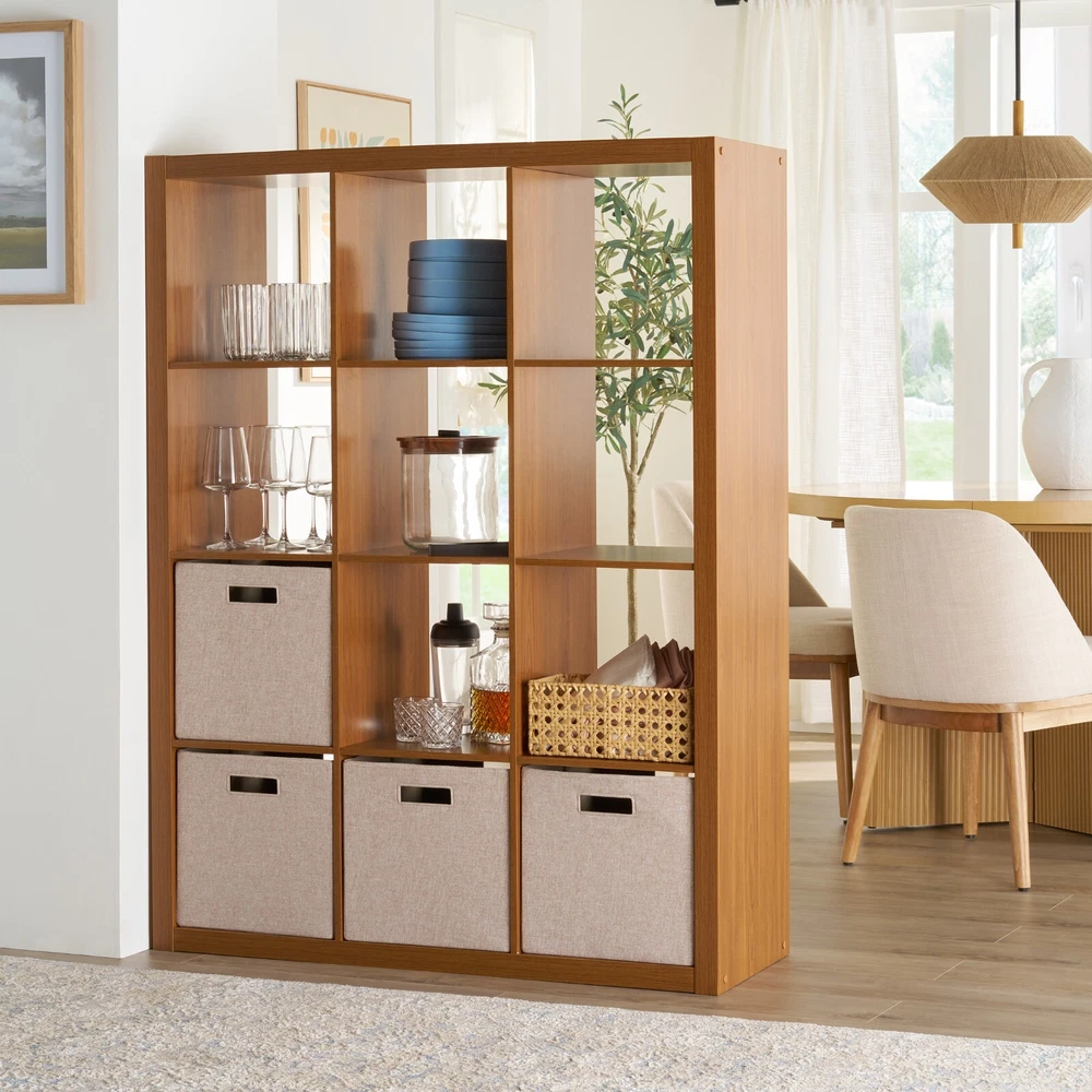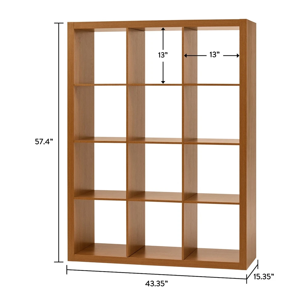 Add function and style to your home with the Better Homes & Gardens 12-Cube Storage Organizer. Available in multiple finishes, including both solid and wood grain options, this cube organizer features twelve 13" x 15" x 13" compartments, the perfect size to display books, collectibles, photos, artwork, storage bins and baskets. An open back design makes it easy to manage cords and cables. This sturdy bookcase can stand vertically or horizontally to best suit your needs and space. The top panel supports up to 100 lbs and each cube supports up to 30 lbs. Combine it with other Better Homes & Gardens Cube Organizers and Cube Storage Bins (sold separately) to create a complete, customized storage and display system. Easy to assemble with included wall attachment safety system, the Better Homes & Gardens 12-Cube Storage Organizer is perfect for your office, living room, den, playroom and more. Features twelve 13" x 15" x 13" compartments Modern, open back design for easy cord management Compatible with Better Homes & Gardens Cube Storage Bins (sold separately) Versatile design allows for vertical or horizontal placement Top panel can support up to 100 lbs and each cube supports up to 30 lbs Can be combined with other Better Homes & Gardens Cube Storage Organizers (sold separately) Materials: MDF, particle board Attaches to the wall with included safety strap Easily assembled by 2 people with included instructions and video assembly guide (hammer, Phillips head screwdriver & flat head screwdriver required) Finishes available: Textured White (BHD036118664036), Tobacco Oak (BHD036118664037), Rustic Gray (BHD036118664035), Light Honey (BH5336278612094), Charcoal (BH5336278612093) and Acorn (BH5336278612095) Site to Store Pickup Note: This item is packaged in one large box that may not fit in a standard-sized vehicle. Please make sure you have a large car or truck for store pickup. Package size: 63.03" x 9.45" x 18.11" (90.62 lbs) Assembled weight: 78.76 lbs Assembled dimensions: 57.4" W x 15.35" D x 43.35" H