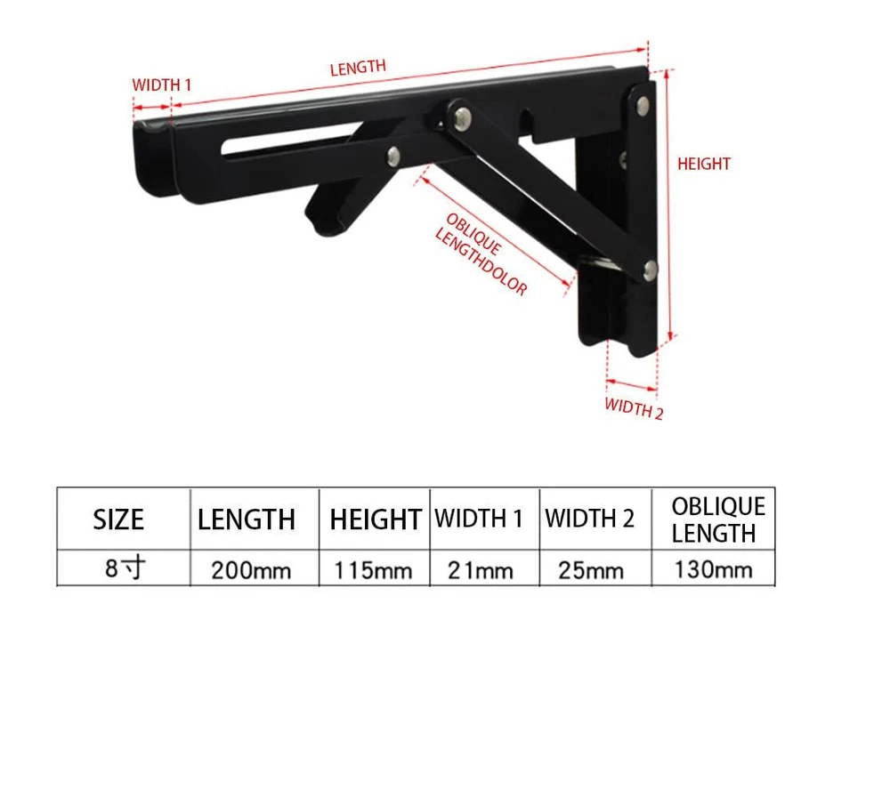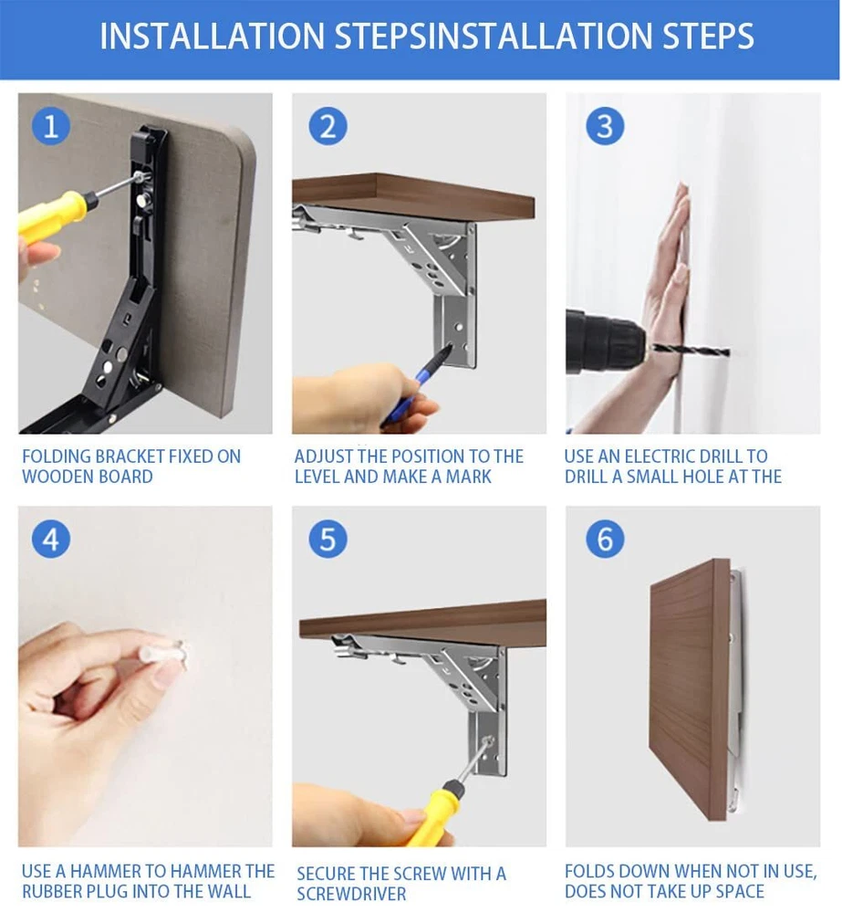 BEAUTIFUL AND STYLISH - It is crafted from solid steel with a sleek finish that goes perfectly in a rustic or industrial home decor scheme. Great for open shelving concept in a kitchen, displaying a library of books in a study or even for extra storage in a powder room. Use with an unfinished wood board for a more contemporary look and a stark contrast between metal and wood or with a piece of weathered wood for a more farmhouse vibe Space Saving - These folding brackets are perfect for DIY jobs around the house. Pop it out when you need it and fold it away to save space when not in used. You can use these brackets to save most space in your garage, laundry room, kitchen, workshops, boats, backyard, trailer, bedroom, balcony, bathroom, etc Easy Installation - The shelf brackets are easy to mount just make sure they are straight on the studs when you do mount them. Comes with mounting accessories, High quality screws and top quality anchors Strong Enough, Holds a Lot of Weight - Dimensions of the brackets: 8inches x 6.9inches. Triangle structure, holds a good amount of weight, supports up to 220lb/100kg. Could be used to make a workstation in your garage, a folding study table for your kids, bench in your backyard, clothes table in laundry room, bookshelf, kitchen shelf, exhibition stand, etc Buy With Confidence - If there are any issues or you think everything is not as advertised, please feel free to contact us, we will refund every penny of your money or give you a replacement at no cost. Just enjoy this absolutely Risk Free purchase