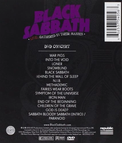 Genre:Heavy MetalBrand:UNIVERSAL MUSIC GROUPISBN:0602537540563Studio:Republic RecordsPackage Dimensions LxWxH:6.81x5.24x0.55 Inchesgtin13:0602537540563Type:Does not applyUPC:0602537540563Movie/TV Title:Black Sabbath Live: Gathered in Their MassesWeight:0.04 PoundsSub-Genre:Music Video (Concert/Performance)EAN:0602537540563Format:DVD