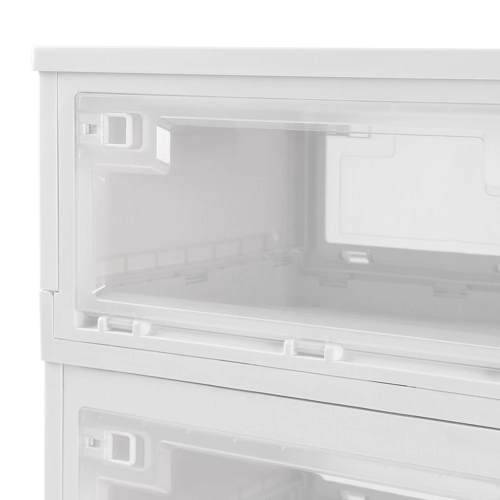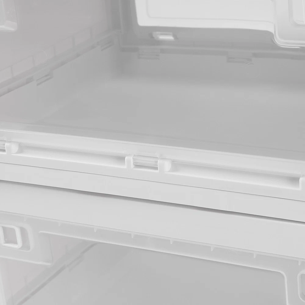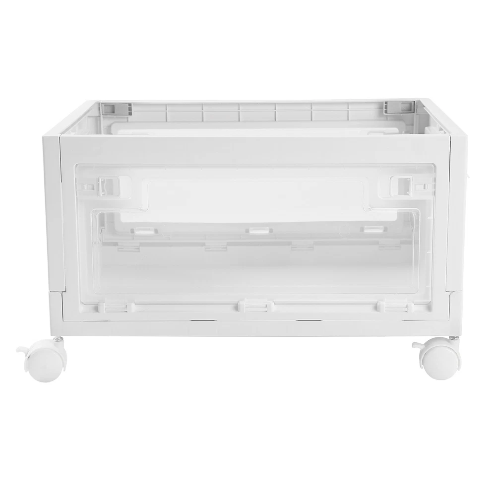 Plastic Storage Bins with Lids Are you often unable to find what you need to use? Are you often bothered by the fact that the plastic storage bins are not big enough? Choose this 3-tiered large-capacity storage box, to bring your life neat and orderly! Details Pull Rings: The bin has two pull rings on left and right, you move the ring inward to open the door, which is very convenient. Bottom Grid Design: The bottom of this plastic storage bin is designed with a reinforced grid, which further ensures the stability of the plastic storage bins. Wheels with Brakes: Each wheel has a brake to fix the bin in place. Application This item can be used to store books, towels, snacks, sundries, etc. You can put it in the living room, children's room, study, bedroom, or car. Specification Material: PP Color: White and Clear Assembly Required: Yes Total Height(Wheels not included): 72cm/28.3in Single Storage Bin Size: 50*36*24cm/19.6*14.1*9.4in Folded Height(Single): 6.5cm/ 2.5in Capacity(Each): 45L/10.23 Gallons Maximum Load(Each): 50kg/110.2lbs Package Included 3* Plastic Storage Bins with Lids 4* Wheels 3* English Manuals All Accessories for Assembly Notes Please allow the slight color difference caused by the shooting light and 1-3cm error due to manual measurement and make sure you do not mind before ordering. Neat and Orderly: These plastic storage bins with lids can store towels, tissues, books, data cables, and other daily essentials to create a cleaner and tidier room environment. Saving Space: The top of this plastic storage bin is designed with recesses, so you can stack them at will to suit your needs. Moreover, these plastic storage bins can be folded. After folding, each storage bin is only 2.6 inches high, you can slip it under the sofa to save a lot of space. Convenient to Access: When the storage bins are stacked together, the door can be easily opened to reach items without removing the lid. At the same time, the openable side lid design and transparent visibility also make access to items more convenient. Design with Lid: This plastic storage bin has a design with a lid to protect against dust and moisture and maintain the dryness and freshness of its contents. Sturdy and Durable: This plastic storage bin is made of thickened material, which can strongly bear 110.2lbs, while the PP material is anti-corrosion and anti-rust, which can be used for a long time. Large Capacity: There are three storage boxes, each with a capacity of up to 45L, so you can store a lot of things at once. Easy to Assemble: It only takes a few seconds to unfold the bin, and after unfolding, you just need to install the baffle, cover, handle, and pulley. The entire installation process does not require tools. Easy to Carry: This plastic storage bin is designed with carrying handles and is equipped with 4 universal wheels, which makes it easy to carry even if heavy objects are placed inside. Also, you can easily clean the place under these storage bins by just pushing a little.