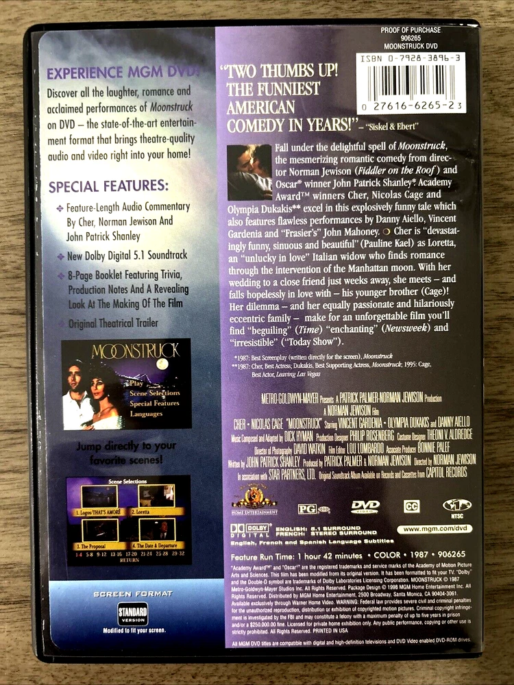 Sub-Genre:Family, Filming, MysteryFormat:DVDDirector:Norman JewisonEdition:Special Edition; Contemporary ClassicsRelease Year:1998Studio:MGM Home EntertainmentGenre:ComedyRating:GMovie/TV Title:MoonstruckType:MovieActor:Cher, Nicolas CageLanguage:English, French