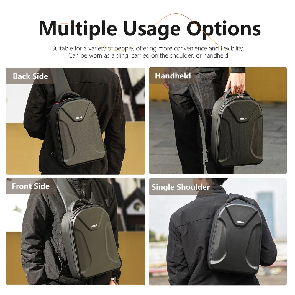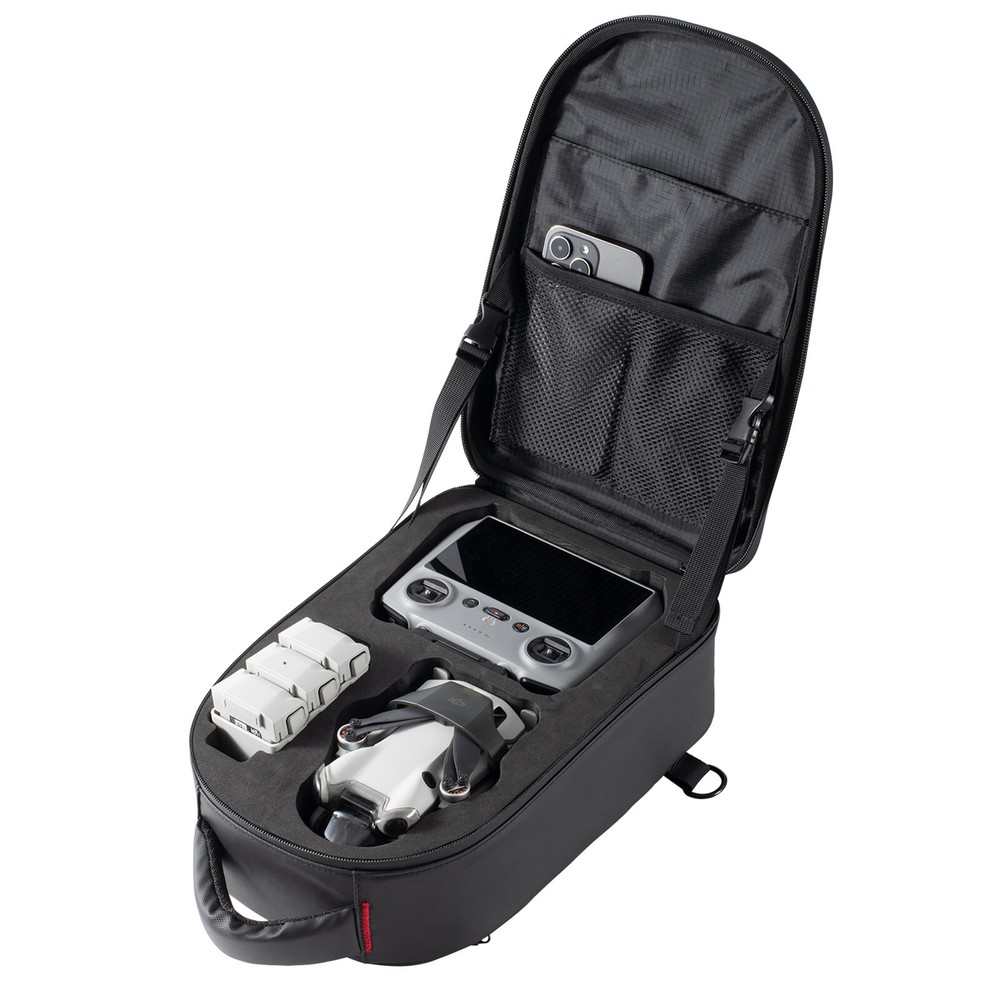 Product Description Mini 4 Pro Case, Portable Sling Backpack Compatible with DJI Mini 3 Pro / Mini 3 / Mini 4 Pro Carrying Case, Travel Mini 3 Bag for DJI Mini 3 Fly More Combo Feature: 【Strong & Stable】— This Backpack Case is made Of high-density material for more durable. High quality precut EVA inner and waterproof PC hard shell secures everything in safety. Protects against scratches, jostles and drops. The high-quality canvas is durable and can better protect your drone. 【Unique Design】— Special storage design for DJI Mini 4 Pro/Mini 3 Pro/Mini 3/Mini 4K/Mini 2 SE Fly More Combo Drone. Large capacity, very useful and convenient to use. Large-capacity backpack, can store Mini series drone, RC-N3/RC-N2/RC-N1/RC 2/RC Remote Controller, batteries, propellers, charger and multiple accessories can be stored, increasing the fun of flying. 【Shockproof & Waterproof】— Designed with a shock-absorbing interior and waterproof zippers, this bag provides extra protection against drops, impacts, and light rain, keeping your gear safe in various conditions. 【Easy to Carry】— This Backpack has an adjustable shoulder strap and handheld strap. Adjustable padded shoulder strap design can relieve pressure on your shoulders. Portable hard shell backpack, you can carry your drone to mountains, buildings, seaside. Whatever scenery you want to see through your drone. (NOT included the drone, remote controller and other drone accessories) Specification: Compatibility For DJI Mini 4 Pro/ Mini 4K/ Mini 3 Pro/ Mini 3/ Mini 2 SE/ Mini SE with DJI RC 2/RC/ RC-N3/N2/N1 Color: Black Material: PC & EVA Weight: 800g Product Size: 37.5*24.5*12.5cm Product List Backpack*1, Instruction Card*1 powered by