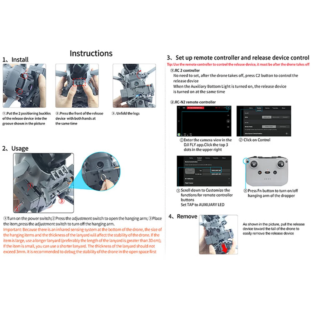 Smartphone Adapter for DJI Osmo Pocket 2 Cellphone Data Connector Accessories 7.92 USD 9.0 USD 1.5 USD 12% off Wireless Remote Controller Transmitter Receiver Kit 6CH 2.4G for DIY RC Boat Car 11.47 USD 13.03 USD 3.99 USD 12% off RC Light Bar Headlight LED Roof Light Lamp Spotlight for 1:8 1:10 RC Crawler Car 9.68 USD 11.0 USD 0.5 USD 12% off 128GB Memory Card Main Motherboard for Samsung Galaxy SM-A505F Laptop 88.58 USD 98.42 USD Free shipping 10% off 4GB 1333MHz Computer Memory for Samsung Desktop Memory RAM Computer Repair Parts 43.99 USD 49.99 USD Free shipping 12% off 12# or 22# or 32# Stainless Steel Square Shaft Screws Powerful Meat Grinder Part 8.86 USD 10.07 USD Free shipping 12% off Stainless Steel M3 Ball Head Tie Rod End Joint Bearing for Tamiya Tractor RC Car 11.23 USD 12.76 USD Free shipping 12% off RC Car Headlight LED Round Lights for 1/8 1/10 RC TRX4 SCX10 #G157H RC Model Car 9.41 USD 10.69 USD 0.99 USD 12% off For Garmin Vivoactive 3 Music Protective Case Anti-Scratch Watch Cover Shell MS 7.03 USD 7.99 USD Free shipping 12% off 2PCS GRC Metal Sand Ladder Plate for 1/10 TRX4 SCX10 D90 RC Crawler Car Parts 9.24 USD 10.5 USD Free shipping 12% off Watch Bands For Garmin Approach S20 Watch Strap Silicone Replacement Wristband 7.66 USD 8.7 USD 1.5 USD 12% off New DDR3 8GB 1333mhz 1600mhz ECC REG Server Memory Card For Samsung Memory RAM 16.61 USD 18.87 USD Free shipping 12% off Silicone Front Face Protective Cover Shell for Quest 2 VR Glasses Headset 9.94 USD 11.3 USD Free shipping 12% off Power Charging Case For Plantronics Voyager 5200/5210 Wireless Bluetooth Headset 17.12 USD 19.45 USD 2.99 USD 12% off Silicone Charger Stand Without Charging Cable for Samsung Galaxy Watch4/Classic 10.24 USD 11.64 USD 0.99 USD 12% off LED Light Warning Light Lamp Position Light for 1/14 Tamiya RC Tractor Truck Car 16.02 USD 18.2 USD 1.99 USD 12% off Wireless Earphone Protective Style Travel Carrying Case fit for Power Beats Pro 11.21 USD 12.74 USD 0.99 USD 12% off Silicone Sealing Ring 58mm/47mm for Solar Water Heater Vacuum Tube Float Valve 7.95 USD 9.03 USD Free shipping 12% off Product Description Drone Thrower Airdrop Payload Transport Delivery Release Device for DJI AIR 3 Feature s: l High quality for professional use l Easy to use, o ne-button c ontrol , easily set up remote controller,yon can use Fn button of the remote controller to turn on or off the dropper with one key, it has the same range as AIR 3 drone l Folding i ntegrated design,easy to install and use l Can start 200 drop-off missions on a full charge, 1.5 hours on a full charge l Can be applied to gift delivery, desert island rescue, sea fishing bait casting, sea rescue and other scenarios Specification: l Material: Plastic l Color: Gray l Maximum Load: 500g l Built-in Battery Capacity: 150mah l Standby Time: about 12 hours l One Charge can be Turned on about: 200 times l Self-charging Time: 1.5 hours l Quantity: 1 Set l Applicable Models: for DJI AIR 3 Package: l 1 x Thrower, 1x Charging Cable, 2x Iron Rings Note: l Turn off the power after using the t hrower l Only the above package content, does not include other accessories Payment We mainly accept payment through PayPal. Payment should be done within 7 days after the end of the Auction. Otherwise Unpaid Item Dispute will be filed with eBay. Please list your special requests (color, packages, etc.) in the PAYPAL NOTES SECTION when you make payment. Shipping We offer Standard International Flat Rate Registered Shipping service to all buyers in the world. We can also offer FedEx, DHL, EMS, TNT or UPS faster service if buyer is willing to pay extra cost. Product will be shipped within Handling time after full payment is received and verified. It normally takes 7-12 business days to United States. Delivery Time is about 15-25 business days to most of the other countries. We ship the package to your confirmed shipping address in PayPal. Please tell us your shipping address in time if it is different from the one in PayPal. The tracking number will be given for the customer to check the shipping status online (registered or faster service only). We are not responsible for any wrong or undeliverable addresses. Please verify and update your shipping address on PayPal during checkout. Returns We offer 60-day refund, and 1 year manufactured warranty on all products. Warranty period starts from the date of purchase. After 60 days from the date of purchase, all return can only be replaced by same item, unless this item is out of stock at that moment. Buyer need pay the shipping fee. * Warranty will be voided if the product is mishandled or physical damaged by customer. We will refuse back all the returns which are out of warranty. * We are not responsible for any kind of compatible issues, or problems related to any specific software or games. In order to return an item, buyer must contact us to request a RMA # (Return Merchandise Authorization Number). RMA number should be written on the outside shipping box or on the return label. The RMA number must not be written on the manufacturer's product box. Contact Us We greatly appreciate your 5-Star POSITIVE Feedback. We have a program which automatically replies as soon as you leave your feedback. We aim to offer each of our valued customers the 100% Satisfaction Product and Service. So if you have any problems, please e-mail us immediately before leaving neutral/negative feedback. Please give us the opportunity to resolve a problem. If no response within 1 work day, please check the spam in your mail box or contact us again via eBay. All communications are handled through Email. We strive to answer all emails as quickly as possible, but due to high email volume it may take time for us to reply. Thanks in advance for your patience. About Us We are an experienced company which specialize in sales of all types of battery packs include laptop battery, camcorder battery, camera battery. Laptop Accessories include laptop AC adapter, porta