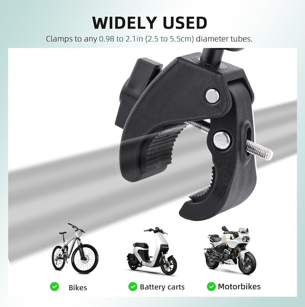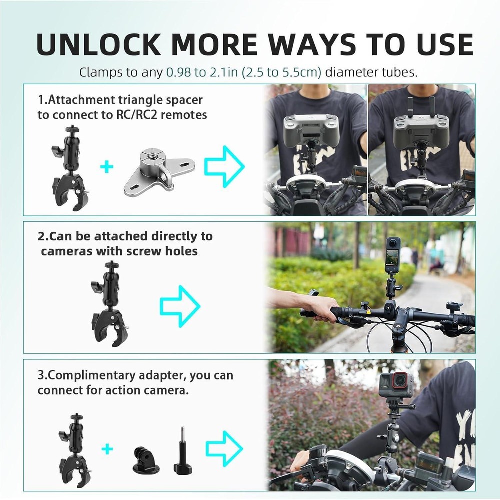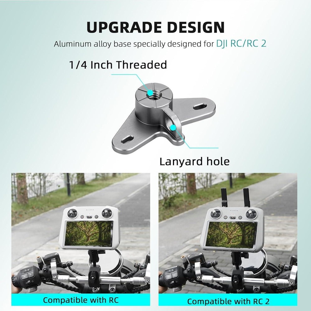 Bike Holder Mount Adapter for DJI RC 2/ RC Controller,360° Dual Ball Head Motorcycle Handlebar Holder Clamp for DJI Mini 4 Pro/Mini 3 Pro/Air 3/Air 3S /Mavic 3 Pro Smart Remote Controller Description Whats in the box remote_control, screw Connectivity technologies No Mounting Type Bike holder clamp Color Black Product Dimensions 3.7 x 1.25 x 6.1 inches Country of Origin China Compatible Devices For Gopro/Osmo action/Insta360, for DJI Mini 4 Pro RC 2 Bike Mount Item Weight 8.8 ounces Special features 360° ball head design, Adjustable Compatible Phone Models for DJI RC/RC 2 UPGRADED DESIGN: This aluminum alloy adapter base is specifically designed for the DJI RC 2 RC remote control, with a sleek, aircraft-shaped design that offers both durability and usability. Featuring a 1/4 inch screw hole and a lanyard hole, Using a lightweight and mini design that remote control can be easily stored in a bag without the need for removal. SAFETY AND STABILITY: Our bike mounts have excellent safety and stability. By increasing the area at the 1/4 screw hole of the adapter base and upgrading the nut, it ensures a firm fixation and is not easy to fall off. In addition, the ABS anti-slip pads on the bracket clamps can increase friction and prevent shaking while riding, further improving shooting stability. WIDE CLAMPING RANGE: The clamp has a clamping range of 2.5cm to 4cm (0.98 to 1.57in), with a good gripping power, it can be mounted on motorbike handlebars, bicycle handlebars, boat rails, road poles, tree trunks, fishing poles, selfie sticks, tables, skateboards and so on. EASY TO SET UP AND REMOVE : Our bike mounts feature a dual ball head design with 360 degree rotation on both the top and bottom. This feature allows you to shoot from any angle and is quick to set up and take down, allowing you to effortlessly install or change equipment as needed. UNIVERSAL COMPATIBILITY - Our bike mount with 1/4 inch ball head and included sports camera adapter and adapter base is compatible with DJI RC RC 2 RC remote control, Osmo Pocket 3 2 Action 3 4 , Insta360 X4 X3 X2 Ace Pro One R RS Go 3 GO 3S, for GoPro Max Mini Hero 12 11 10 9 8 7 6 5 Black Hero 4 3 and other sports cameras.