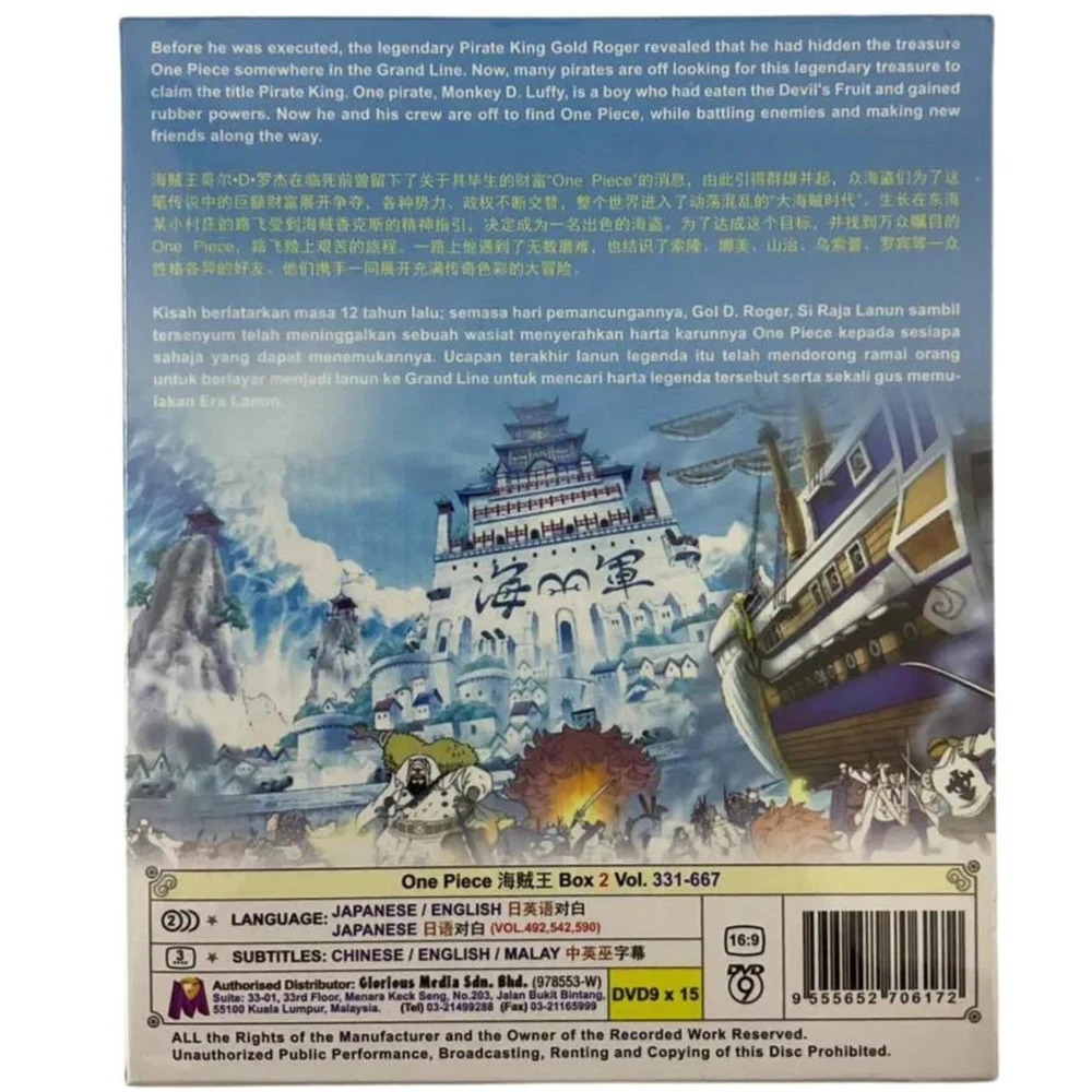 DVD Anime One Piece Box.2 TV Series (Vol.331-667) ~ English Dubbed All Region Synopsis: Before he was executed, the legendary Pirate King Gold Roger revealed that he had hidden the treasure One Piece somewhere in the Grand Line. Now, many pirates are off looking for this legendary treasure to claim the title Pirate King. One pirate, Monkey D. Luffy, is a boy who had eaten the Devil's Fruit and gained rubber powers. Now he and his crew are off to find One Piece, while battling enemies and making new friends along the way. Features and further details Title : One Piece Box 2 Vol. 331 - 667 (English Dubbed) Details: No Of Disc : 15 Disc Language : Japanese / English (Attn - Episode 492 - 542 - 590 : Japanese) Subtitle : Chinese / English Format : DVD / NTSC & All Region Code (16.9) Genres: Action, Adventure, Fantasy Weight : 441g Contact us We can be contacted at any time through eBay messages if you have any questions, comments or product requests. We will respond to you within 24 hours and do our best to help you out! We encourage our customers to contact us with any questions or concerns! We'd like to be sure you are completely satisfied with your purchase. Payment We accept payment via eBay - managed payment Shipping We are using standard international shipping. Handling time is 1-3 business working days. Your goods will be shipped with valid tracking number. All products is packed , layered with bubble wrap to reduce damages during shipment delivery. Estimated delivery is between 11 to 23 business working days. We also provide express shipping as an option. Estimated delivery is between 5 to 8 business days. **Rest assured we will ensure your package arrives as soon as possible. However, the delivery may be delayed due to some unforeseen circumstances which is out of our control, such as bad weather, high postal traffic and the performance of shipping companies. Return If you have any problem with the order, do contact us via eBay message, we will be glad to assist you and resolve your problems as soon as possible. Items can be returned within 30 days in good condition. Note: Import duties, taxes and additional charges are not included in item price or shipping charges. Please be aware these custom import duties and taxes are buyer's responsibility. Free eBay listing template designed by © dewiso.com .