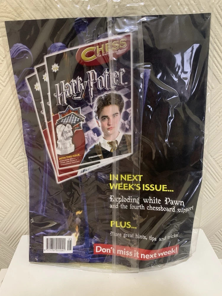 Issue 45: Magnetic Pins What a special listing and opportunity this is for someone. I have the Harry Potter Chess Set and Magazines by DeAgostini, which was a weekly collectors edition around 2007. Partwork published weekly by DeAgostini, originally in 48 parts, then extended with advanced chess set to 81. Each issue came with a magazine and parts for the chess set or chess board You have the exciting opportunity to handpick your preferred issue from the series, allowing you to tailor your collection according to your interests and needs. Whether you're seeking a specific piece to complete your set or simply eager to explore the rich content of the Harry Potter Chess Manual, this listing offers flexibility and choice like never before. With each issue, you'll uncover a new facet of the wizarding world, from iconic characters and magical creatures to pivotal moments in the Harry Potter saga. From the courageous knights to the cunning bishops, each chess piece is meticulously crafted to capture the essence of the beloved series, making your chess set a true collector's item. All issues are still sealed. Magazines have creases and folds from storage but still sealed. Some magazines are a little bent due to weight of the boxed figurine in the post and are in the same condition as when they were originally delivered by the Royal Mail. For combined postage and deals please feel free to message me! Happy Bidding :)